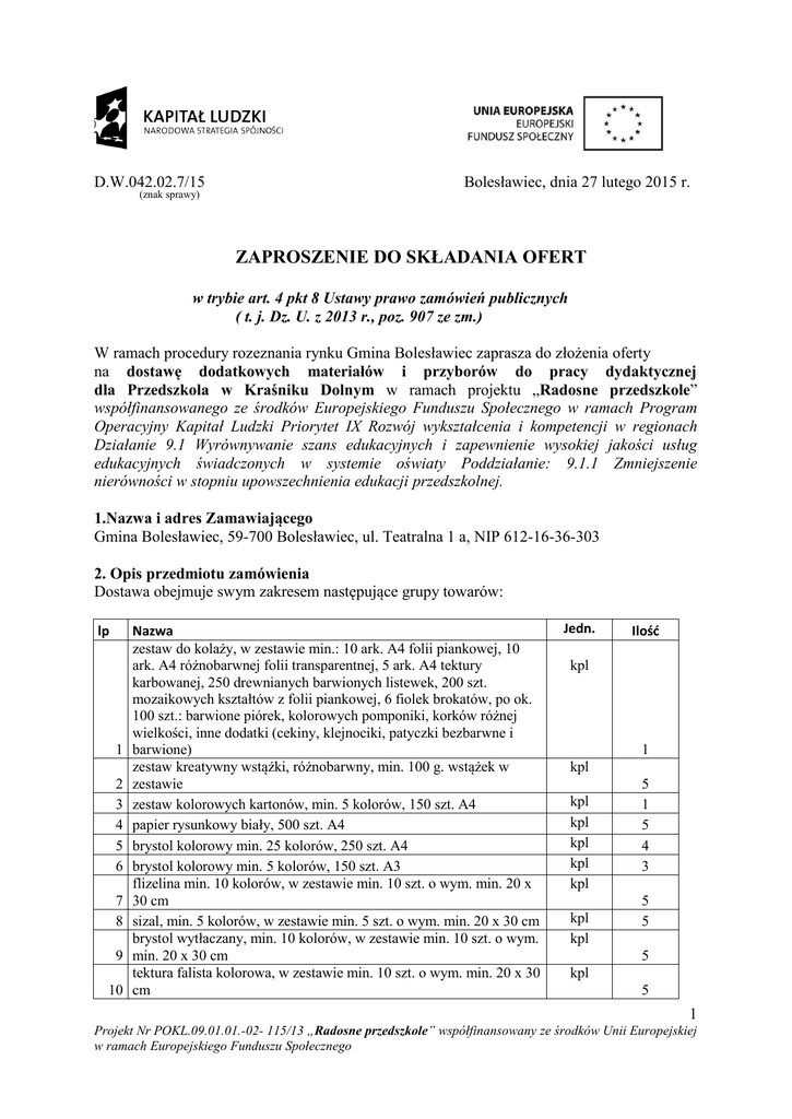 D.W.042.02.7/15 Bolesławiec, dnia 27 lutego 2015 r. (znak sprawy) ZAPROSZENIE DO SKŁADANIA OFERT w trybie art. 4 pkt 8 Ustawy prawo zamówień publicznych ( t. j. Dz. U. z 2013 r., poz. 907 ze zm.) W ramach procedury rozeznania rynku Gmina Bolesławiec zaprasza do złożenia oferty na dostawę dodatkowych materiałów i przyborów do pracy dydaktycznej dla Przedszkola w Kraśniku Dolnym w ramach projektu „Radosne przedszkole” współfinansowanego ze środków Europejskiego Funduszu Społecznego w ramach Program Operacyjny Kapitał Ludzki Priorytet IX Rozwój wykształcenia i kompetencji w regionach Działanie 9.1 Wyrównywanie szans edukacyjnych i zapewnienie wysokiej jakości usług edukacyjnych świadczonych w systemie oświaty Poddziałanie: 9.1.1 Zmniejszenie nierówności w stopniu upowszechnienia edukacji przedszkolnej. 1.Nazwa i adres Zamawiającego Gmina Bolesławiec, 59-700 Bolesławiec, ul. Teatralna 1 a, NIP 612-16-36-303 2. Opis przedmiotu zamówienia Dostawa obejmuje swym zakresem następujące grupy towarów: lp 1 2 3 4 5 6 7 8 9 10 Nazwa zestaw do kolaży, w zestawie min.: 10 ark. A4 folii piankowej, 10 ark. A4 różnobarwnej folii transparentnej, 5 ark. A4 tektury karbowanej, 250 drewnianych barwionych listewek, 200 szt. mozaikowych kształtów z folii piankowej, 6 fiolek brokatów, po ok. 100 szt.: barwione piórek, kolorowych pomponiki, korków różnej wielkości, inne dodatki (cekiny, klejnociki, patyczki bezbarwne i barwione) zestaw kreatywny wstążki, różnobarwny, min. 100 g. wstążek w zestawie zestaw kolorowych kartonów, min. 5 kolorów, 150 szt. A4 papier rysunkowy biały, 500 szt. A4 brystol kolorowy min. 25 kolorów, 250 szt. A4 brystol kolorowy min. 5 kolorów, 150 szt. A3 flizelina min. 10 kolorów, w zestawie min. 10 szt. o wym. min. 20 x 30 cm sizal, min. 5 kolorów, w zestawie min. 5 szt. o wym. min. 20 x 30 cm brystol wytłaczany, min. 10 kolorów, w zestawie min. 10 szt. o wym. min. 20 x 30 cm tektura falista kolorowa, w zestawie min. 10 szt. o wym. min. 20 x 30 cm Jedn. Ilość kpl 1 kpl kpl kpl kpl kpl kpl kpl kpl 5 1 5 4 3 5 5 5 kpl 5 1 Projekt Nr POKL.09.01.01.-02- 115/13 „Radosne przedszkole” współfinansowany ze środków Unii Europejskiej w ramach Europejskiego Funduszu Społecznego bibuła gładka min. 10 kolorów, w zestawie min. 30 ark. o wym. min. 11 50 x 70 cm 12 bibuła marszczona różnokolorowa, min. 10 szt. w zestawie bibuła marszczona w deseń: kropki, paski, różnokolorowa, min. 10 13 szt. w zestawie krepina metalizowana, min. 5 kolorów, w zestawie min. 5 rolek o 14 wym. min. 200 x 50 cm 15 suszarka do prac na kółkach, metalowa, min. 25 poziomów fartuszki do prac ręcznych z materiału, z rękawami, o wym. min. 40 x 16 45 cm kolorowe ceratki wielorazowego użytku na stoliki, o wym. min. 100 17 x 150 cm, min. 4 szt. w zestawie podstawki na farbę do wałków z tworzywa sztucznego, trójdzielne, o 18 wym. min. 35 x 20 cm wałki dekoracyjne z plastikową rączką i piankową rolką, różne 19 tematy zestawów (miasto, wieś, morze, itp.) , min. 5 szt. w zestawie faktury gumowe –stempelki z uchwytem z fakturą różnych 20 zwierzęcych skór, min. 4 szt. w zestawie stemple tematyczne gumowe, śr. min. 9 cm, różne tematy zestawów (buźki, dżungla, Boze Narodzenie), min. 6 różnych stempli w 21 zestawie szablony z tworzywa sztucznego do wykonywania kompozycji, tematy zestawów: Boże Narodzenie, Wielkanoc; min. 6 różnych 22 szablonów o boku min. 15 cm w zestawie 23 dziurkacze wzorów słońce, śnieżynka, o śr. wzoru min. 3 cm nożyczki z tworzywa sztucznego do cięcia wzorków, min. 4 różne 24 wzorki w zestawie folia piankowa min. 15 kolorów, min. 100 ark. o wym. min. 15 x 22 25 cm 26 filc zestaw min. 10 kolorów, min. 40 ark. A4 27 klej w sztyfcie min. 35 g 28 klej uniwersalny min. 1 l kpl kpl kpl 30 20 23 kpl szt szt 2 1 15 kpl 4 szt 5 kpl 5 kpl 1 kpl 3 kpl szt kpl 2 2 2 kpl kpl szt szt 1 1 30 1 3. Wymagany termin realizacji zamówienia: do 23. marca 2015 r. 4. Ocena ofert: Przy wyborze oferty do realizacji Zamawiający będzie się kierował kryterium: Cena 100 % Zapytanie ofertowe ma charakter badania rynku. Gmina zastrzega sobie możliwość nieskorzystania z żadnej z przesłanych ofert lub też skorzystania z niej w części. 5. Opis sposobu obliczenia ceny w składanej ofercie: Cena oferty powinna być całkowita i uwzględniać: a) wartość dostawy w oparciu o ceny jednostkowe przedmiotu zamówienia, b) obowiązujący podatek od towarów i usług VAT, c) koszt dostawy do miejsca wskazanego przez Zamawiającego – Przedszkole w Kraśniku Dolnym, Kraśnik Dolny 45, 59-700 Bolesławiec Cena podana przez Wykonawcę za wykonanie przedmiotu zamówienia jest obowiązująca obie strony zawartej umowy i nie będzie podlegała waloryzacji. Zamawiający wybierze propozycję odpowiadającą wszystkim postawionym przez niego kryterium i o niższej cenie. 2 Projekt Nr POKL.09.01.01.-02- 115/13 „Radosne przedszkole” współfinansowany ze środków Unii Europejskiej w ramach Europejskiego Funduszu Społecznego 6. Opis sposobu przygotowania oferty 1) Wykonawca, składając ofertę cenową, składa wypełniony formularz ofertowy wg załączonego wzoru (zał. nr 1). 2) Oferta musi obejmować całość zamówienia. 7. Miejsce i termin złożenia ofert. Wypełnioną ofertę należy złożyć w siedzibie Zamawiającego, tj. sekretariat Urzędu Gminy Bolesławiec, 59 - 700 Bolesławiec, ul. Teatralna 1 a lub przesłać za pomocą poczty elektronicznej na jeden z adresów: [email protected], [email protected] w terminie do dnia 06 marca 2015 r., do godz. 14.00 Wykonawca może wprowadzić zmiany lub wycofać złożoną przez siebie propozycję przed terminem upływu jej składania. 8. Informacje dotyczące wyboru najkorzystniejszej ofert Informacja o wyborze najkorzystniejszej oferty zostanie umieszczona na stronie internetowej: www.gminaboleslawiec.pl . 9. Osoba uprawniona do kontaktów z wykonawcami : Elżbieta 