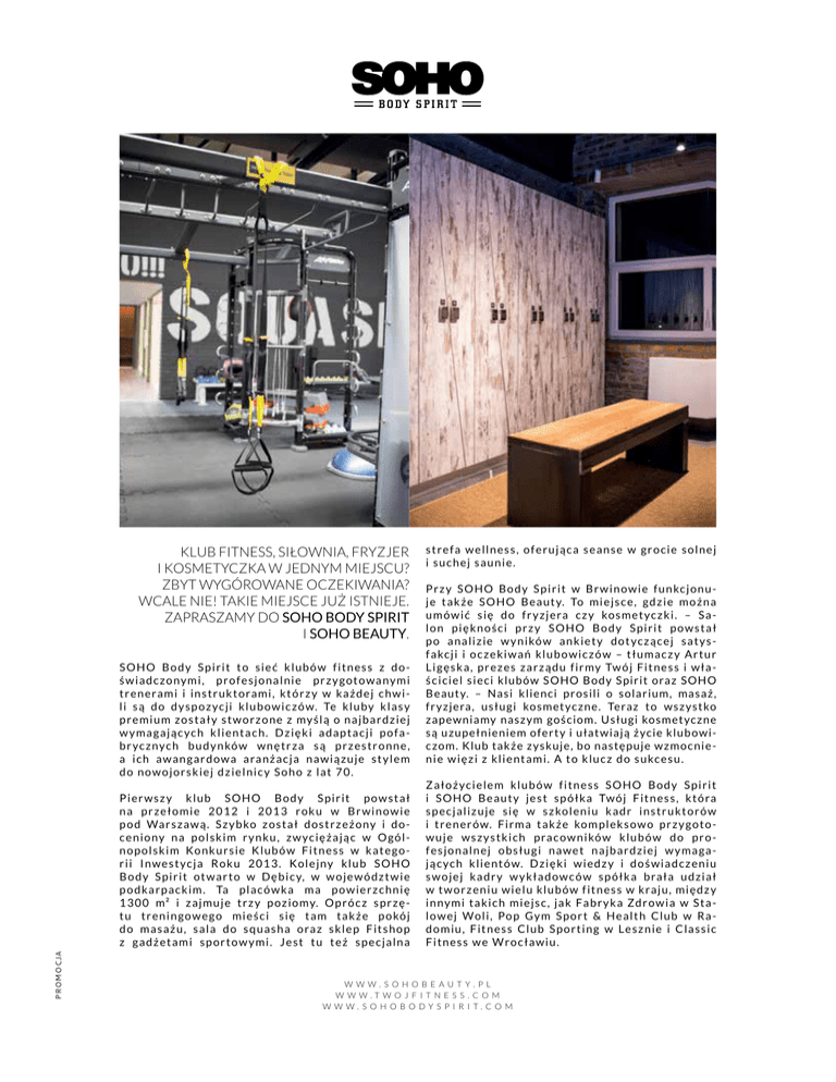 KLUB FITNESS, SIŁOWNIA, FRYZJER I KOSMETYCZKA W JEDNYM MIEJSCU? ZBYT WYGÓROWANE OCZEKIWANIA? WCALE NIE! TAKIE MIEJSCE JUŻ ISTNIEJE. ZAPRASZAMY DO SOHO BODY SPIRIT I SOHO BEAUTY. S OHO Bo dy Sp i r i t to si eć kl ubów f i tne s s z d o ś wiad czo nymi , p r of esjonal ni e p r z yg oto w a ny m i t ren erami i i nstr uktorami , któr z y w każ d e j c hw i li s ą d o d ysp oz yc ji kl ubow i c z ów. Te kl u by k l a s y premium zostały stw or z one z myśl ą o naj b a r d zi e j wymag ając yc h kl i entac h. D z i ęki adap tac j i p o fa b rycznych budynków wnętr z a są p r z e s t r o n n e , a ich awan g ar dow a aranż ac ja nawi ąz uje s t y l e m d o n owo jor ski ej dz i el ni c y Soho z l at 7 0 . PR OM OCJA Pie rws zy kl ub SO H O B ody Sp i r i t p o w s t a ł n a przeło mi e 2 0 1 2 i 2 0 1 3 r oku w B rw i n o w i e pod Wars z awą. Sz ybko z ostał dostr z eż o ny i d o ce niony n a p ol ski m r ynku, z w yc i ęż ając w O gó l n opols k im Konkur si e Kl ubów F i tness w k a t e go rii Inwes tyc ja R oku 2 0 1 3 . Kol ejny kl ub S O H O Bo d y S piri t otw ar to w D ębi c y, w wojew ó d zt w i e pod karpac ki m. Ta p l ac ów ka ma p owie r zc h n i ę 1300 m² i z ajmuje tr z y p oz i omy. O p r óc z s p r zę t u t re ningoweg o mi eśc i si ę tam także p o kó j d o mas ażu, sal a do squasha oraz skl ep Fi t s h o p z g ad żet ami sp or tow ymi . J est tu też s p e c j a l n a s t r e fa w e l l n e s s , o fe r u j ą c a s e a n s e w gr o c i e s o l n e j i suchej saunie. P r zy S O H O B o d y S p i r i t w B r w i n o w i e fu n kc j o n u j e t a k że S O H O B e a u t y. To m i e j s c e , gd zi e m o żn a u m ó w i ć s i ę d o fr y zj e ra c zy ko s m e t yc zk i . – S a l o n p i ę k n o ś c i p r zy S O H O B o d y S p i r i t p o w s t a ł p o a n a l i zi e w y n i kó w a n k i e t y d o t yc zą c e j s a t y s fa kc j i i o c ze k i w a ń k l u b o w i c zó w – t ł u m a c zy A r t u r Li gę s k a , p r e ze s za r zą d u fi r my Tw ó j Fi t n e s s i w ł a ś c ic iel s ieci klubów SOHO Body Spirit oraz SOHO Beauty. – Nasi klienci prosili o solarium, masaż, fryzjera, usługi kosmetyczne. Teraz to wszystko zapewniamy naszym gościom. Usługi kosmetyczne są uzupełnieniem oferty i ułatwiają życie klubowiczom. Klub także zyskuje, bo następuje wzmoc n ien i e w i ę zi z k l i e n t a m i . A t o k l u c z d o s u kc e s u . Za ł o życ i e l e m k l u b ó w fi t n e s s S O H O B o d y S p i r i t i S O H O B e a u t y j e s t s p ó ł k a Tw ó j Fi t n e s s , k t ó ra s p e c j a l i zu j e s i ę w s zko l e n i u k a d r i n s t r u k t o r ó w i t r e n e r ó w. Fi r m a t a k że ko m p l e k s o w o p r zy go t o w u j e w s zy s t k i c h p ra c o w n i kó w k l u b ó w d o p r o fe s j o n a l n e j o b s ł u gi n aw e t n a j b a r d zi e j w y m a ga j ą c yc h k l i e n t ó w. D zi ę k i w i e d zy i d o ś w i a d c ze n i u s w o j e j k a d r y w y k ł a d o w c ó w s p ó ł k a b ra ł a u d zi a ł w t w o r ze n i u w i e l u k l u b ó w fi t n e s s w k ra j u , m i ę d zy i n ny m i t a k i c h m i e j s c , j a k Fa b r y k a Zd r o w i a w S t a l o w e j Wo l i , Po p G y m S p o r t & H e a l t h Cl u b w R a d o m i u , Fi t n e s s Cl u b S p o r t i n g w Le s zn i e i Cl a s s i c Fi t n e s s w e W r o c ł aw i u . W WW.SO HO BE AUTY.P L W W W.TWO J FI TNE SS.CO M W W W. SO HO BO DYSP I RI T.CO M