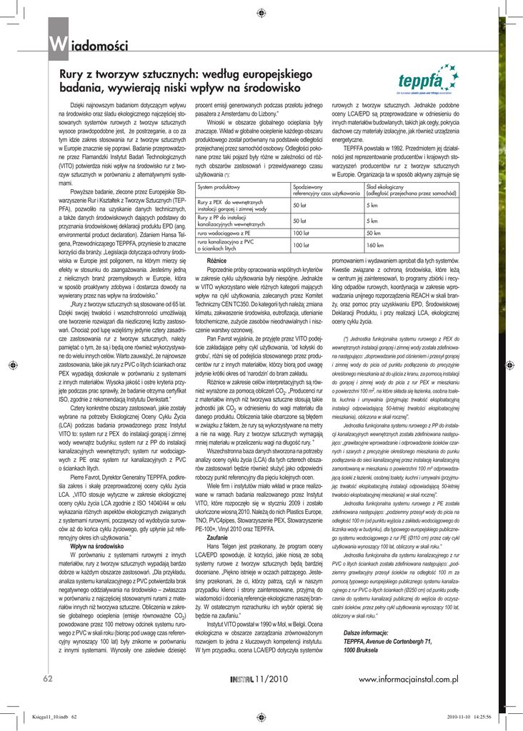 W iadomości Rury z tworzyw sztucznych: według europejskiego badania, wywierają niski wpływ na środowisko Dzięki najnowszym badaniom dotyczącym wpływu na środowisko oraz śladu ekologicznego najczęściej stosowanych systemów rurowych z tworzyw sztucznych wysoce prawdopodobne jest, że postrzeganie, a co za tym idzie zakres stosowania rur z tworzyw sztucznych w Europie znacznie się poprawi. Badanie przeprowadzone przez Flamandzki Instytut Badań Technologicznych (VITO) potwierdza niski wpływ na środowisko rur z tworzyw sztucznych w porównaniu z alternatywnymi systemami. Powyższe badanie, zlecone przez Europejskie Stowarzyszenie Rur i Kształtek z Tworzyw Sztucznych (TEPPFA), pozwoliło na uzyskanie danych technicznych, a także danych środowiskowych dających podstawy do przyznania środowiskowej deklaracji produktu EPD (ang. environmental product declaration). Zdaniem Hansa Telgena, Przewodniczącego TEPPFA, przyniesie to znaczne korzyści dla branży. „Legislacja dotycząca ochrony środowiska w Europie jest poligonem, na którym mierzy się efekty w stosunku do zaangażowania. Jesteśmy jedną z nielicznych branż przemysłowych w Europie, która w sposób proaktywny zdobywa i dostarcza dowody na wywierany przez nas wpływ na środowisko.” „Rury z tworzyw sztucznych są stosowane od 65 lat. Dzięki swojej trwałości i wszechstronności umożliwiają one tworzenie rozwiązań dla niezliczonej liczby zastosowań. Chociaż pod lupę wzięliśmy jedynie cztery zasadnicze zastosowania rur z tworzyw sztucznych, należy pamiętać o tym, że są i będą one również wykorzystywane do wielu innych celów. Warto zauważyć, że najnowsze zastosowania, takie jak rury z PVC o litych ściankach oraz PEX wypadają doskonale w porównaniu z systemami z innych materiałów. Wysoka jakość i ostre kryteria przyjęte podczas prac sprawiły, że badanie otrzyma certyfikat ISO, zgodnie z rekomendacją Instytutu Denkstatt.” Cztery konkretne obszary zastosowań, jakie zostały wybrane na potrzeby Ekologicznej Oceny Cyklu Życia (LCA) podczas badania prowadzonego przez Instytut VITO to: system rur z PEX do instalacji gorącej i zimnej wody wewnątrz budynku; system rur z PP do instalacji kanalizacyjnych wewnętrznych; system rur wodociągowych z PE oraz system rur kanalizacyjnych z PVC o ściankach litych. Pierre Favrot, Dyrektor Generalny TEPPFA, podkreśla zakres i skalę przeprowadzonej oceny cyklu życia LCA. „VITO stosuje wytyczne w zakresie ekologicznej oceny cyklu życia LCA zgodnie z ISO 14040/44 w celu wykazania różnych aspektów ekologicznych związanych z systemami rurowymi, począwszy od wydobycia surowców aż do końca cyklu życiowego, gdy upłynie już referencyjny okres ich użytkowania.” Wpływ na środowisko W porównaniu z systemami rurowymi z innych materiałów, rury z tworzyw sztucznych wypadają bardzo dobrze w każdym obszarze zastosowań. „Dla przykładu, analiza systemu kanalizacyjnego z PVC potwierdziła brak negatywnego oddziaływania na środowisko – zwłaszcza w porównaniu z najczęściej stosowanymi rurami z materiałów innych niż tworzywa sztuczne. Obliczenia w zakresie globalnego ocieplenia (emisje równoważne CO2) powodowane przez 100 metrowy odcinek systemu rurowego z PVC w skali roku (biorąc pod uwagę czas referencyjny wynoszący 100 lat) były znikome w porównaniu z innymi systemami. Wynosiły one zaledwie dziesięć 62 Księga11_10.indb 62 procent emisji generowanych podczas przelotu jednego pasażera z Amsterdamu do Lizbony.” Wnioski w obszarze globalnego ocieplania były znaczące. Wkład w globalne ocieplenie każdego obszaru produktowego został porównany na podstawie odległości przejechanej przez samochód osobowy. Odległości pokonane przez taki pojazd były różne w zależności od różnych obszarów zastosowań i przewidywanego czasu użytkowania (*): System produktowy rurowych z tworzyw sztucznych. Jednakże podobne oceny LCA/EPD są przeprowadzane w odniesieniu do innych materiałów budowlanych, takich jak cegły, pokrycia dachowe czy materiały izolacyjne, jak również urządzenia energetyczne. TEPFFA powstała w 1992. Przedmiotem jej działalności jest reprezentowanie producentów i krajowych stowarzyszeń producentów rur z tworzyw sztucznych w Europie. Organizacja ta w sposób aktywny zajmuje się Spodziewany referencyjny czas użytkowania Ślad ekologiczny (odległość przejechana przez samochód) Rury z PEX do wewnętrznych instalacji gorącej i zimnej wody 50 lat 5 km Rury z PP do instalacji kanalizacyjnych wewnętrznych 50 lat 5 km rura wodociągowa z PE 100 lat 50 km rura kanalizacyjna z PVC o ściankach litych 100 lat 160 km Różnice Poprzednie próby opracowania wspólnych kryteriów w zakresie cyklu użytkowania były niespójne. Jednakże w VITO wykorzystano wiele różnych kategorii mających wpływ na cykl użytkowania, zalecanych przez Komitet Techniczny CEN TC350. Do kategorii tych należą: zmiana klimatu, zakwaszenie środowiska, eutrofizacja, utlenianie fotochemiczne, zużycie zasobów nieodnawialnych i niszczenie warstwy ozonowej. Pan Favrot wyjaśnia, że przyjęte przez VITO podejście zakładające pełny cykl użytkowania, ‘od kołyski do grobu’, różni się od podejścia stosowanego przez producentów rur z innych materiałów, którzy biorą pod uwagę jedynie krótki okres od ‘narodzin’ do bram zakładu. Różnice w zakresie celów interpretacyjnych są również wyrażone za pomocą obliczeń CO2. „Producenci rur z materiałów innych niż tworzywa sztuczne stosują takie jednostki jak CO2 w odniesieniu do wagi materiału dla danego produktu. Obliczenia takie obarczone są błędem w związku z faktem, że rury są wykorzystywane na metry a nie na wagę. Rury z tworzyw sztucznych wymagają mniej materiału w przeliczeniu wagi na długość rury. ” Wszechstronna baza danych stworzona na potrzeby analizy oceny cyklu życia (LCA) dla tych czterech obszarów zastos