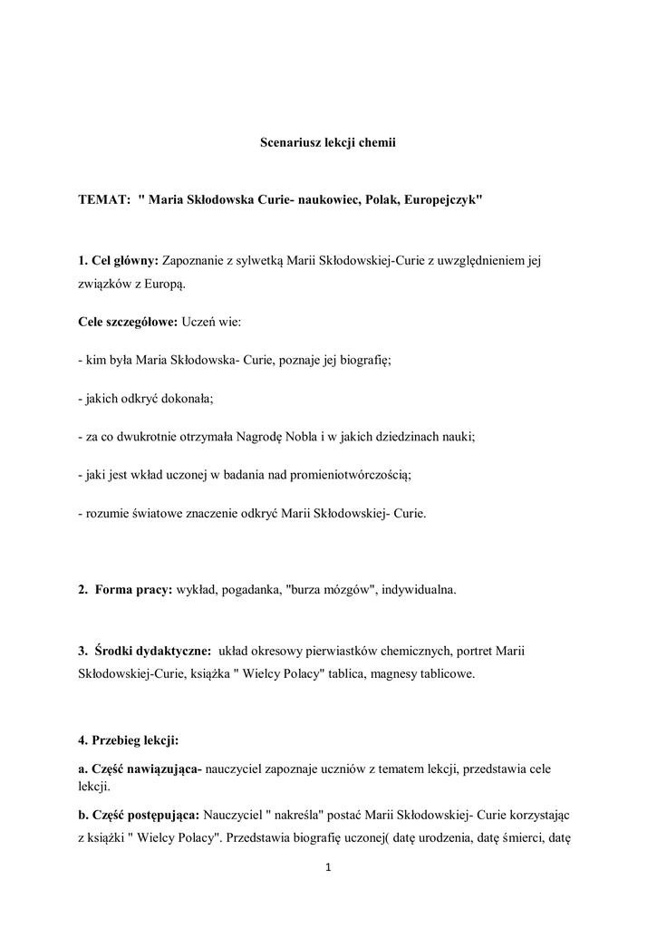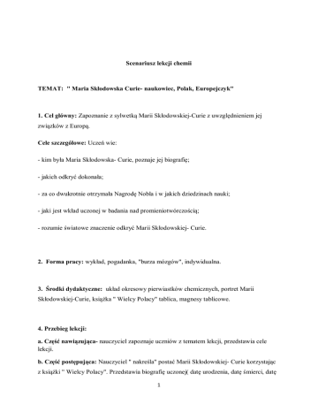 Scenariusz lekcji chemii TEMAT: " Maria Skłodowska Curie- naukowiec, Polak, Europejczyk" 1. Cel główny: Zapoznanie z sylwetką Marii Skłodowskiej-Curie z uwzględnieniem jej związków z Europą. Cele szczegółowe: Uczeń wie: - kim była Maria Skłodowska- Curie, poznaje jej biografię; - jakich odkryć dokonała; - za co dwukrotnie otrzymała Nagrodę Nobla i w jakich dziedzinach nauki; - jaki jest wkład uczonej w badania nad promieniotwórczością; - rozumie światowe znaczenie odkryć Marii Skłodowskiej- Curie. 2. Forma pracy: wykład, pogadanka, "burza mózgów", indywidualna. 3. Środki dydaktyczne: układ okresowy pierwiastków chemicznych, portret Marii Skłodowskiej-Curie, książka " Wielcy Polacy" tablica, magnesy tablicowe. 4. Przebieg lekcji: a. Część nawiązująca- nauczyciel zapoznaje uczniów z tematem lekcji, przedstawia cele lekcji. b. Część postępująca: Nauczyciel " nakreśla" postać Marii Skłodowskiej- Curie korzystając z książki " Wielcy Polacy". Przedstawia biografię uczonej( datę urodzenia, datę śmierci, datę 1 rozpoczęcia studiów, datę wyjazdu uczonej z Polski, dokładne daty otrzymania nagrody Nobla dziedzinie fizyki oraz chemii, przyczynę śmierci uczonej itd.) . Nauczyciel pokazuje zdjęcia z życia uczonej. Nauczyciel zapoznaje uczniów z trudną drogą uczonej do zdobycia wykształcenia. Na terenie Polski kobietom nie wolno było studiować, dlatego Maria Skłodowska- Curie zmuszona była wyjechać do Paryża. Nauczyciel korzystając z układu okresowego pierwiastków chemicznych charakteryzuje polon i rad dwa pierwiastki chemiczne odkryte przez uczoną, podkreśla wyraźny wkład uczonej w prace nad zjawiskiem promieniotwórczości. Zaznacza europejską skalę odkrycia tego zjawiska. Odkrycie zjawiska promieniotwórczości było wydarzeniem na skalę nie tylko europejską. Dzięki odkryciom Marii Skłodowskiej- Curie w Polsce powstał Instytut Radowy w Warszawie, dzisiejsze Centrum Onkologii. c. Rekapitulacja: "Burza mózgów": Nauczyciel zadaje uczniom pytanie: Czy Maria Skłodowska- Curie może być autorytetem dla współczesnej młodzieży?, czy można nazwać ją wielką patriotką, Europejką. Jakie dziedziny nauki mogły rozwinąć się dzięki odkryciom uczonej? Po przeprowadzonej dyskusji nauczyciel przeprowadza krótki test dotyczący życia i twórczości uczonej.( Test składa się z 10 zadań zamkniętych w którym wśród trzech wariantów odpowiedzi jedna odpowiedź jest poprawna). Uczniowie którzy wykażą się największą wiedzą otrzymają oceny za aktywność) Pytania do testu: 1) Dzieciństwo Marii Skłodowskiej upłynęło: a) w Paryżu b) w Warszawie c) w Berlinie 2) Dlaczego Maria Skłodowska rozpoczęła studia w Paryżu, a nie w Warszawie? 2 a) z nakazu ojca b) miała rodzinę w Paryżu c) na terenie zaboru rosyjskiego kobiety nie mogły studiować 3) Maria i Piotr Curie odkryli promieniotwórcze pierwiastki polon i rad w roku: a) w 1890 b) w 1898 c) w 1900 4) Pierwiastek polon zyskał swą nazwę na cześć: a) miejscowości, w której został odkryty b) ojczyzny uczonej c) dyrektora kopalni rudy uranu 5) Po śmierci męża Maria Skłodowska-Curie objęła katedrę uczelni: a) w Oxfordzie b) w Sorbonie c) w Uniwersytecie Wileńskim 6) Maria Skłodowska-Curie była dwukrotnie laureatką nagrody Nobla. Nagrody te otrzymała w latach: a) 1902 i 1913 b) 1903 i 1911 c) 1903 i 1913 7) W czasie I wojny światowej Maria Skłodowska-Curie: a) zajmowała się lecznictwem radiologicznym b) wstąpiła w szeregi armii francuskiej c) pisała pracę doktorską 8) "Tam spędziłam najlepsze i najszczęśliwsze lata naszego życia" - mówi uczona. Wspomnienie to dotyczy: 3 a) mieszkania w Paryżu b) starej, opuszczonej szopy c) laboratorium na uczelni 9) W 1932 roku Maria Skłodowska-Curie podarowała Instytutowi Radowemu w Warszawie: a) wyposażenie pracowni fizyko-chemicznej b) 1 kg polonu c) 1 gram radu 10) Maria Skłodowska-Curie zmarła w 1934 roku. Przyczyną śmierci była: a) gruźlica b) anemia złośliwa c) choroba wieńcowa d. Zadanie domowe: Do wyboru ( zadanie 1 i 2 uczniowie mogą wykonać w grupach 3,4 osobowych) : 1. Dowiedz się, gdzie w najbliższej okolicy znajduje się pomnik Marii Skłodowskiej-Curie oraz wykonaj rysunek lub zrób zdjęcie pomnika, spróbuj przeprowadzić wywiad na temat historii tego pomnika lub 2. Która ze szkół w Twojej okolicy nosi imię Marii Skłodowskiej-Curie?. Spróbuj nawiązać kontakt z tą szkołą i przeprowadzić wywiad na temat patronki szkoły lub 3. Napisz list do kolegi w którym przedstawisz postać Marii Skłodowskie- Curie jako autorytet dla współczesnej młodzieży. Termin wykonania: 2 tygodnie Opracowanie: Bernadeta Kita 4