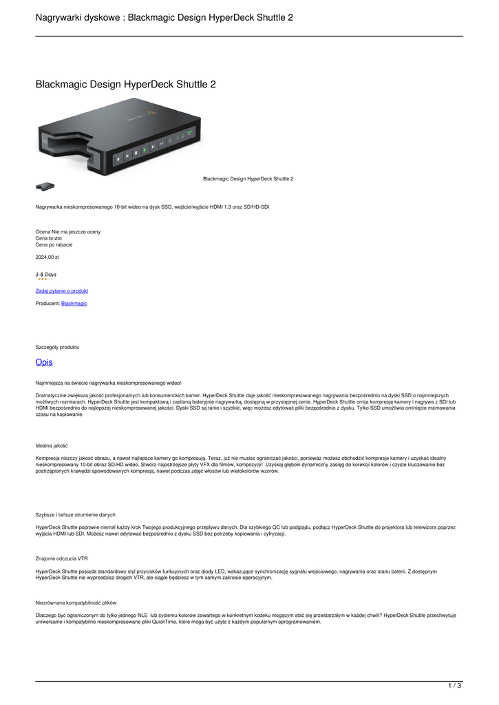 Nagrywarki dyskowe : Blackmagic Design HyperDeck Shuttle 2 Blackmagic Design HyperDeck Shuttle 2 Blackmagic Design HyperDeck Shuttle 2 Nagrywarka nieskompresowanego 10-bit wideo na dysk SSD, wejście/wyjście HDMI 1.3 oraz SD/HD-SDI Ocena Nie ma jeszcze oceny Cena brutto Cena po rabacie 2024,00 zł Zadaj pytanie o produkt Producent: Blackmagic Szczegóły produktu Opis Najmniejsza na świecie nagrywarka nieskompresowanego wideo! Dramatycznie zwiększa jakość profesjonalnych lub konsumenckich kamer. HyperDeck Shuttle daje jakość nieskompresowanego nagrywania bezpośrednio na dyski SSD o najmniejszych możliwych rozmiarach. HyperDeck Shuttle jest kompaktową i zasilaną bateryjnie nagrywarką, dostępną w przystępnej cenie. HyperDeck Shuttle omija kompresję kamery i nagrywa z SDI lub HDMI bezpośrednio do najlepszej nieskompresowanej jakości. Dyski SSD są tanie i szybkie, więc możesz edytować pliki bezpośrednio z dysku. Tylko SSD umożliwia ominięcie marnowania czasu na kopiowanie. Idealna jakość Kompresja niszczy jakosć obrazu, a nawet najlepsze kamery go kompresują. Teraz, już nie musisz ograniczać jakości, poniewaz możesz obchodzić kompresje kamery i uzyskać idealny nieskompresowany 10-bit obraz SD/HD wideo. Stwórz najostrzejsze płyty VFX dla filmów, kompozycji! Uzyskaj głęboki dynamiczny zasięg do korekcji kolorów i czyste kluczowanie bez postrzępionych krawędzi spowodowanych kompresją, nawet podczas zdjęć włosów lub wielokolorów wzorów. Szybsze i tańsze strumienie danych HyperDeck Shuttle poprawie niemal każdy krok Twojego produkcyjnego przepływu danych. Dla szybkiego QC lub podglądu, podłącz HyperDeck Shuttle do projektora lub telewizora poprzez wyjścia HDMI lub SDI. Możesz nawet edytować bezpośrednio z dysku SSD bez potrzeby kopiowania i cyfryzacji. Znajome odczucia VTR HyperDeck Shuttle posiada standardowy styl przycisków funkcyjnych oraz diody LED, wskazujące synchronizację sygnału wejściowego, nagrywania oraz stanu baterii. Z dostępnym HyperDeck Shuttle nie wyprzedzisz drogich VTR, ale ciągle będziesz w tym samym zakresie operacyjnym. Niezrównana kompatybilność plików Dlaczego być ograniczonym do tylko jednego NLE lub systemu kolorów zawartego w konkretnym kodeku mogącym stać się przestarzałym w każdej chwili? HyperDeck Shuttle przechwytuje uniwersalne i kompatybilne nieskompresowane pliki QuickTime, które moga być użyte z każdym popularnym oprogramowaniem. 1/3 Nagrywarki dyskowe : Blackmagic Design HyperDeck Shuttle 2 Idź gdziekolwiek, nagrywaj kiedykolwiek! Z kompaktowym i niewiarygodnie wytrzymałym designem, HyperDeck Shuttle jest wykonany z bloku lotniczego aluminium! Oznacza to, że design z wytrzymałością by iść gdziekolwiek. Zabierz swojego HyperDeck Shuttle na zewnątrz, na wydażenia na żywo lub nawet na ekstremalne zdjęcia sportowe. Z wewnętrzną baterią wystarczy tylko naładować i wychodzić. Możliwości są w zasadzie nieograniczone! Technologia Solid State Disk (SSD) Wystarczy włożyć dysk 2.5” SSD do HyperDeck Shuttle i można nagrywać z dużą szybkość, niskim poborem mocy oraz kompletnie cichą pracą. Teraz,pżesz wyeliminować skomplikowane i drogie macierze dystkowe. Pojedynczy dysk SSD może bez problemu nagrywać nieskompresowane wideo. Wymienialne media takie jak karty CF i SxS nie mogą sprostać takiej wydajności i wymagają kopiowania plików. Podłącz do profesjonalnej lub konsumenckiej kamery Z wejściami i wyjściami SDI oraz HDMI, HyperDeck Shuttle działa z każdą kamerą, sterownikiem i monitorem! Bezproblemowo podłącz monitory lub telewizory aby uzyskać podgląd. Korzystaj z HyperDeck Shuttle jako źródło odtwarzania wideo dla systemów digital signage lub przełączników. Wyobraź sobie wykorzsytanie HyperDeck Shuttle podłączonego do przełącznika produkcji na żywo dla nagrywania wydarzeń a potem wykorzystac go do odtwarzania. HyperDeck Shuttle może niemal wszystko i jest na tyle mały, że możesz go zabrać wszędzie. Dane techniczne 1. Kontrola transportu - przyciski nagrywaj, stop, następny klip i inne! 2. Przycisk wyświetlacza - aktywuje tryb wyświetlania 3. Przycisk zasilania - włacza i wyłącza urządzenie. Przytrzymaj 1 sek. aby wyłączyć. 4. Status wideo - pokazuje czy jest obecne odpowiednie wejście wideo 5. Status SSD - pokazuje zapis i odczyt z dysku 6. Poziom baterii - pokazuje stan naładowania baterii 7. Połączenie zasilacza - ładuj i zasilaj urządzenie 8. Połączenia HDMI - HDMI 1.3, nagrywaj i odtwarzaj 9. Połączenia SDI - wejścia i wyjścia SDI/HD-SDI 10. Mini USB 2.0 - aktualizuj oprogramowanie i zmieniaj ustawienia Połączenia Wejście SDI Video Wyjście SDI Video Wejście HDMI Video Wyjście HDMI Video Wejście SDI Audio 1 x 10-bit SD/HD przełączane. 1 x 10-bit SD/HD przełączane. 1 x HDMI 1.3 konektor typ A 1 x HDMI 1.3 konektor typ A 16 kanałów z Wyjście SDI Audio 16 kanałów z Wejście HDMI Audio 8 kanałów ze Wyjście HDMI Audio 2 kanały zem badowanych w SD i HD Interfejs SSD 1 x 2.5" SATA 3Gb/s Interfejs 1 x konektor komputerowy typ Mini-B type USB 2.0 dla instalacji wstępnej, aktualizacji firmware i op 2/3 Nagrywarki dyskowe : Blackmagic Design HyperDeck Shuttle 2 Połączenia Kontrola nagrywarki Konfiguracja nagrywarki Standardy Format SD Format HD Zgodność SDI Obsługa metadanych SDI Próbkowanie wideo Próbkowanie audio Precyzja kolorów Przestrzenie kolorów Dodatki Bateria Zasilacz Gwarancja 7 przycisków dla lokalnej kontroli HyperDeck Shuttle oraz USB 2.0 high speed USB 2.0 high speed 625/25 PAL i 525/29.97 NTSC. 480p60 i 576p50 tylko przez HDMI. 720p50, 720p59.94, 720p60, 1080i50, 1080i59.94, 1080i60, 108 0PsF23.98, 1080PsF24, 1080PsF25, SMPTE 259M, SMPTE 292M HD RP188 oraz napisy. 4:2:2 Standardy telewizyjne 48 kHz and 24 bit 10-bit REC 601, REC 709 Przełączanie SDI i HDMI pomiędzy SDI 270 Mb/s oraz 1.5 Gb/s HD-SDI. Wbudowana ładowana bateria lithium-ion polymer +12V uniwe