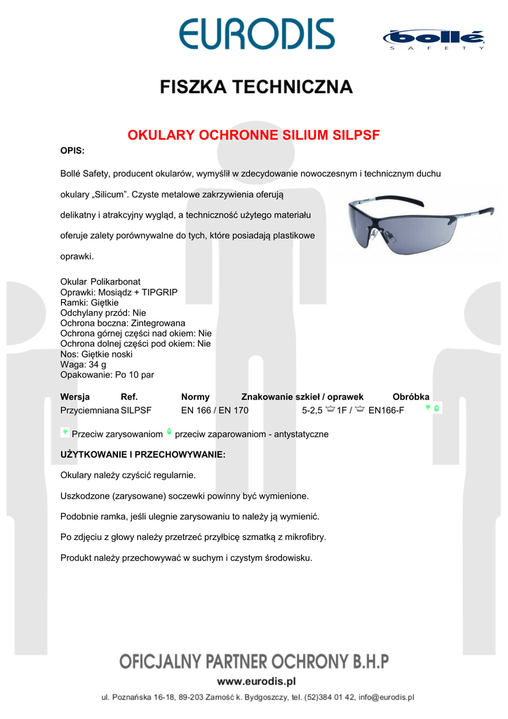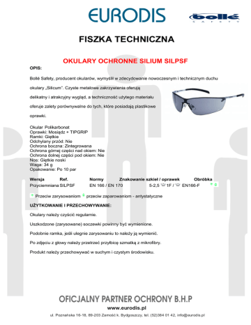 OKULARY OCHRONNE SILIUM SILPSF OPIS: Bollé Safety, producent okularów, wymyślił w zdecydowanie nowoczesnym i technicznym duchu okulary „Silicum”. Czyste metalowe zakrzywienia oferują delikatny i atrakcyjny wygląd, a techniczność użytego materiału oferuje zalety porównywalne do tych, które posiadają plastikowe oprawki. Okular Polikarbonat Oprawki: Mosiądz + TIPGRIP Ramki: Giętkie Odchylany przód: Nie Ochrona boczna: Zintegrowana Ochrona górnej części nad okiem: Nie Ochrona dolnej części pod okiem: Nie Nos: Giętkie noski Waga: 34 g Opakowanie: Po 10 par Wersja Ref. Przyciemniana SILPSF Przeciw zarysowaniom Normy Znakowanie szkieł / oprawek Obróbka 1F / EN166-F EN 166 / EN 170 5-2,5 przeciw zaparowaniom - antystatyczne UŻYTKOWANIE I PRZECHOWYWANIE: Okulary należy czyścić regularnie. Uszkodzone (zarysowane) soczewki powinny być wymienione. Podobnie ramka, jeśli ulegnie zarysowaniu to należy ją wymienić. Po zdjęciu z głowy należy przetrzeć przyłbicę szmatką z mikrofibry. Produkt należy przechowywać w suchym i czystym środowisku.