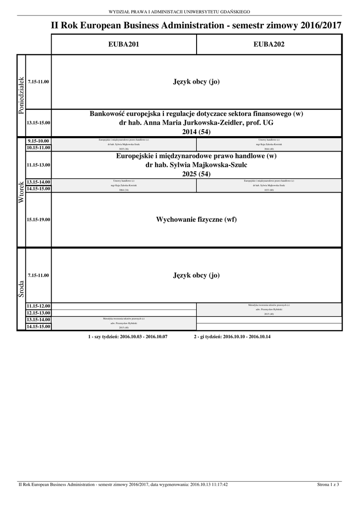 WYDZIAŁ PRAWA I ADMINISTACJI UNIWERSYTETU GDAŃSKIEGO II Rok European Business Administration - semestr zimowy 2016/2017 Poniedziałek EUBA201 7.15-11.00 Język obcy (jo) 13.15-15.00 Bankowość europejska i regulacje dotyczace sektora finansowego (w) dr hab. Anna Maria Jurkowska-Zeidler, prof. UG 2014 (54) 9.15-10.00 10.15-11.00 11.15-13.00 13.15-14.00 14.15-15.00 Europejskie i międzynarodowe prawo handlowe (c) Europejskie i międzynarodowe prawo handlowe (c) dr hab. Sylwia Majkowska-Szulc 3035 (36) dr hab. Sylwia Majkowska-Szulc Umowy handlowe (c) Umowy handlowe (c) mgr Kaja Zaleska-Korziuk 3044 (40) mgr Kaja Zaleska-Korziuk 3035 (36) 3044 (40) Umowy handlowe (c) Umowy handlowe (c) mgr Kaja Zaleska-Korziuk 3064 (34) mgr Kaja Zaleska-Korziuk Europejskie i międzynarodowe prawo handlowe (c) Europejskie i międzynarodowe prawo handlowe (c) dr hab. Sylwia Majkowska-Szulc 1033 (60) dr hab. Sylwia Majkowska-Szulc 3064 (34) 1033 (60) Europejskie i międzynarodowe prawo handlowe (w) dr hab. Sylwia Majkowska-Szulc 2025 (54) 15.15-19.00 Wychowanie fizyczne (wf) 7.15-11.00 Język obcy (jo) Środa Wtorek EUBA202 11.15-12.00 12.15-13.00 13.15-14.00 14.15-15.00 Metodyka tworzenia tekstów prawnych (c) Metodyka tworzenia tekstów prawnych (c) adw. Przemysław Rybiński 2015 (40) adw. Przemysław Rybiński 2015 (40) Metodyka tworzenia tekstów prawnych (c) Metodyka tworzenia tekstów prawnych (c) adw. Przemysław Rybiński 2015 (40) adw. Przemysław Rybiński 2015 (40) 1 - szy tydzień: 2016.10.03 - 2016.10.07 2 - gi tydzień: 2016.10.10 - 2016.10.14 II Rok European Business Administration - semestr zimowy 2016/2017, data wygenerowania: 2016.10.13 11:17:42 Strona 1 z 3 WYDZIAŁ PRAWA I ADMINISTACJI UNIWERSYTETU GDAŃSKIEGO II Rok European Business Administration - semestr zimowy 2016/2017 EUBA201 9.15-11.00 Piątek Czwartek 11.15-12.00 12.15-13.00 EUBA202 Podstawy przedsiębiorczości (w) dr hab. Anna Dobaczewska, prof. UG (1-szy tydzień) / dr Bartłomiej Gliniecki (2-gi tydzień) 3043 (40) Podstawy przedsiębiorczości przedsiębiorczości Podstawy - 1-szy tydzień (c) Maciej Zejda -mgr 1-szy tydzień (c) 3043 (40) mgr Maciej Zejda //////////////////////////// Bankowość europejska i regulacje dotyczace sektora finansowego 3043 (40) (c) - 2-gi tydzień dr//////////////////////////// Rafał Mroczkowski 3053 (40) Bankowość europejska i regulacje dotyczace sektora finansowego - 2-gi tydzień (c) dr Rafał Mroczkowski 3053 (40) Bankowość europejska europejska ii regulacje regulacje dotyczace dotyczace sektora sektora finansowego finansowego Bankowość - 1-szy tydzień (c) dr-Rafał 1-szyMroczkowski tydzień (c) 3053 (40) dr//////////////////////////// Rafał Mroczkowski Podstawy przedsiębiorczości 3053 (40) (c) - 2-gi tydzień dr hab. Anna Dobaczewska, prof. UG //////////////////////////// 3043 (40) Podstawy przedsiębiorczości - 2-gi tydzień (c) dr hab. Anna Dobaczewska, prof. UG 3043 (40) 15.15-19.00 Wychowanie fizyczne (wf) 9.15-11.00 Umowy handlowe (w) dr Bartłomiej Gliniecki 3065 (60) 1 - szy tydzień: 2016.10.03 - 2016.10.07 2 - gi tydzień: 2016.10.10 - 2016.10.14 II Rok European Business Administration - semestr zimowy 2016/2017, data wygenerowania: 2016.10.13 11:17:42 Strona 2 z 3 WYDZIAŁ PRAWA I ADMINISTACJI UNIWERSYTETU GDAŃSKIEGO II Rok European Business Administration - semestr zimowy 2016/2017 EUBA201 7.15-9.00 Piątek 11.15-13.00 EUBA202 Etyka w zatrudnieniu EUBA (wdw) dr Marta Zbucka 1033 (60) Podstawy procesu karnego (wdw) dr hab. Krzysztof Woźniewski, prof. UG 3065 (60) Prawo lotnicze i kosmiczne (wdw) 13.15-18.00 dr hab. Małgorzata Polkowska 2002 (60) 1 - szy tydzień: 2016.10.03 - 2016.10.07 2 - gi tydzień: 2016.10.10 - 2016.10.14 II Rok European Business Administration - semestr zimowy 2016/2017, data wygenerowania: 2016.10.13 11:17:42 Strona 3 z 3