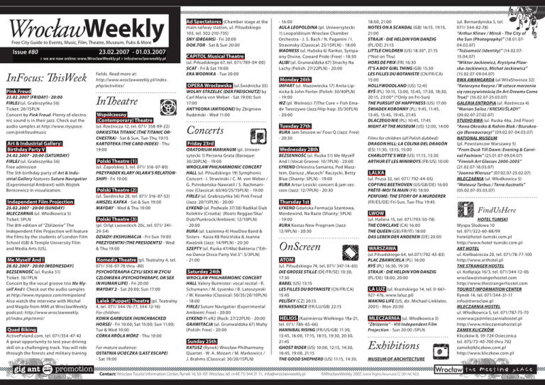 WrocławWeekly Free City Guide to Events, Music, Film, Theatre, Museum, Pubs & More Issue #80 23.02.2007 - 01.03.2007 > we are now online: www.WroclawWeekly.pl > [email protected] InFocus: ThisWeek fields. Read more at: http://www.wroclawweekly.pl/index. php/activities/ 23.02.2007 (Friday) - 20:00 FIRLEJ (ul. Grabiszyńka 56) Ticket: 20/15PLN Concert by Pink Freud. Plenty of electronic sound is in their jazz. Check out the audio samples at http://www.myspace. com/pinkfreudmusic InTheatre Pink Freud Art & Industrial Gallery: Birthday Party V Współczesny (Contemporary) Theatre (ul. Rzeźnicza 12, tel. 071/ 358-89-22) Orkiestra TITANIC (The Titanic Orchestra) - Sat & Sun, Tue-Thu 19:15 Kartoteka (The Card Index) - Thu 19:00 24.02.2007 - 20:00 (Saturday) FIRLEJ (ul. Grabiszyńka 56) Free admission The 5th birthday party of Art & Industrial Gallery features Suture Navigatior (Experimental Ambient) with Wojtek Benicewicz in visualization. (ul. Zapolskiej 3, tel. 071/ 316-07-80) Przypadek Klary (Klara’s Relationship) - Fri 19:00 Independent Film Projection (ul. Świdnicka 28, tel. 071/ 316-07-52) Amszel Kafka - Sat & Sun 19:00 Mayday - Wed & Thu 19:00 25.02.2007 - 20:00 (Sunday) MLECZARNIA (ul. Włodkowica 5) Ticket: 5PLN The 8th edition of “Zbliżenie” The Independent Film Projection will feature the films by the students of London Film School (GB) & Temple University Film and Media Arts (US). Me Myself And I 28.02.2007 - 20:00 (Wednesday) BEZSENNOŚĆ (ul. Ruska 51) Ticket: 10/7PLN Concert by the vocal groove trio Me Myself And I. Check out the audio samples at http://www.myspace.com/mmipoland Also watch the interview with Michał and Magda from MMI at WroclawWeekly podcast: http://www.wroclawweekly. pl/index.php/mmii/ Quad Biking ActivePoland.com, tel. 071/354-47-42 A great opportunity to test your driving skill on a challenging track. You will ride through the forests and military traning Polski Theatre (1) Polski Theatre (2) Polski Theatre (3) (pl. Orląt Lwowskich 20c, tel. 071/ 34129-54) Dziady: Ekshumacja - Fri-Sun 19:00 Prezydentki (The Presidents) - Wed & Thu 19:00 Komedia Theatre (pl. Teatralny 4, tel. 071/ 316-07-78 thru -80) Psychoterapia czyli seks w zyciu czlowieka (Psychotherapy, or sex in human life) - Fri 20:00 Mayday 2 - Sat 20:00; Sun 17:00 Lalek (Puppet) Theatre (pl. Teatralny 4, tel. 071/ 344-76-77, 344-12-16) For children: Konik Garbusek (Hunchbacked Horse) - Fri 10:00; Sat 15:00; Sun 11:00; Tue & Wed 10:00 Córka Króla Mórz - Thu 10:00 For mature audience: Ostatnia Ucieczka (Last Escape) - Sat 19:00 Ad Spectatores (Chamber stage at the main railway station, ul. Piłsudskiego 103, tel. 502-210-735) Sny (Dreams) - Fri 20:00 Dok.Tor - Sat & Sun 20:00 CAPITOL Musical Theatre (ul. Piłsudskiego 67, tel. 071/789-04-00) Scat - Fri & Sat 19:00 Era Wodnika - Tue 20:00 OPERA Wrocławska (ul.Świdnicka 35) - 16:00 AULA LEOPOLDINA (pl. Uniwersytecki 1) Leopoldinum Wroclaw Chamber Orchestra - J. S. Bach / N. Paganini / I. Stravinsky (Classical: 25/15PLN) - 18:00 MADNESS (ul. Hubska 6) Rankor, Sympaony Divine, Coward Pride (Free) - 18:30 ALIBI (ul. Grunwaldzka 67) Strachy Na Lachy (Polish: 27/22PLN) - 20:00 Monday 26th Wolny Strzelec (Der Freischutz) by Carl Maria von Weber - Sat 19:00; Sun 17:00 Antygona (Antigone) by Zbigniew Rudziński - Wed 11:00 IMPART (ul. Mazowiecka 17) Anita Lipnicka & John Porter (Polish: 50/40PLN) - 19:00 WZ (pl. Wolności 7)The Core + Fish Emade Tworzywo (Jazz/Hip-hop: 35/30PLN) - 20:00 Concerts RURA Jam Session w/ Four Q (Jazz: Free) - 20:30 Friday 23rd ORATORIUM MARIANUM (pl. Uniwersytecki 1) Persona Grata (Baroque: 30/20PLN) - 19:00 WROCŁAW PHILHARMONIC CONCERT HALL (ul. Piłsudskiego 19) Symphonic Concert - I. Stravinski / C. M. von Weber / G. Pstrokońska-Nawratil / S. Rachmaninov (Classical: 60/40/25/15PLN) - 19:00 FIRLEJ (ul. Grabiszyńka 56) Pink Freud (Jazz: 20/15PLN) - 20:00 ŁYKEND (ul. Podwale 37/38) Radikal Dub Kolektiv (Croatia) (Roots Reggae/Ska/ Dub/Punkrock/Ambient: 12/10PLN) - 20:00 RURA (ul. Łazienna 4) HooDoo Band & Sisters - Kasia K8 Rościńska & Joanna Kwaśnik (Jazz: 14/9PLN) - 20:30 SZEPTY (ul. Ruska 47/48a) Bakteria (“Ethno Dance Disco Party Vol.5”: 5/3PLN) - 21:00 Saturday 24th WROCŁAW PHILHARMONIC CONCERT HALL Valery Buimister: vocal recital - R. Schumann / M. Łysenko / B. Latoszynski / W. Kosenko (Classical: 50/35/20/10PLN) - 18:00 FIRLEJ Suture Navigatior (Experimental Ambient: Free) - 20:00 ŁYKEND Pi eR2 (Rock: 27/22PLN) - 20:00 GRAWITACJA (ul. Grunwaldzka 67) Muhy (Polish: Free) - 20:00 Sunday 25th RATUSZ (Rynek) Wrocław Philharmony Quartet - W. A. Mozart / M. Markowicz / J. Brahms (Classical: 30/20/15PLN) Tuesday 27th Wednesday 28th BEZSENNOŚĆ (ul. Ruska 51) Me Myself And I (Vocal Groove: 10/7PLN) - 20:00 ŁYKEND Orkiestra Samanta, Pod Masztem, Dariusz „Macoch” Raczycki, Betty Blue (Shanty: 5PLN) - 19:00 RURA Artur Lesicki: concert & jam session (Jazz: 12/7PLN) - 20:30 Thursday 1st ŁYKEND Gdańska Formacja Szantowa, Mordewind, Na Razie (Shanty: 5PLN) - 19:00 RURA Kostas New Progrram (Jazz: 12/9PLN) - 20:30 OnScreen Films for children (all Polish dubbed): Dragon Hill: La colina del dragón (ES) 11:30, 13:15, 15:00 Charlotte’s Web (US) 11:15, 13:30 Arthur et les Minimoys (FR/US) 10:00 LALKA (ul. Prusa 32, tel. 071/ 792-44-05) Copying Beethoven (US/GB/DE) 16:00 Prête-moi ta main (FR) 18:00 Perfume: The Story of a Murderer (FR/ES/DE) Fri-Sun, Tue-Thu 19:45 LWOW (ul. Hallera 15, tel. 071/793-50-78) The Conclave (CA) 16:00 The Queen (GB)/FR/IT) 18:00 Das Leben der Anderen (DE) 20:00 WARSZAWA ATOM (ul. Piłsudskiego 74, tel. 071/ 347-14-65) Die Grosse Stille (DE/FR/SE) 10:30, 17:30 Babel (US) 13:15 Les Filles du botaniste (CN/FR/CA) 15:45 Pelíšky (CZ) 20:15 Renaissance (FR/LU/GB) 22:15 HELIOS (Kazimierza Wielkiego 19a-21, tel. 071/ 786-65-66) Hannibal Rising (FR/US/GB) 11:30, 13:45, 16:00, 17:15, 18:15, 19:30, 20:30, 21:45 Ghost Rider (US) 10:00, 12:15, 14:30, 16:45, 19:00, 21:15 The Good Shepherd (U