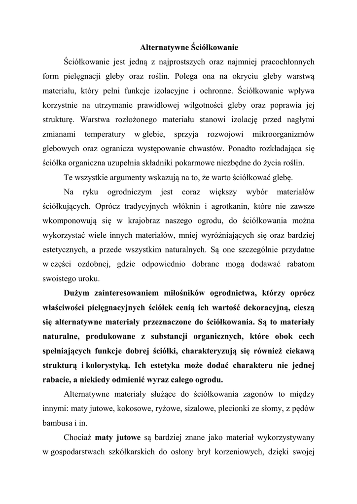 Alternatywne Ściółkowanie Ściółkowanie jest jedną z najprostszych oraz najmniej pracochłonnych form pielęgnacji gleby oraz roślin. Polega ona na okryciu gleby warstwą materiału, który pełni funkcje izolacyjne i ochronne. Ściółkowanie wpływa korzystnie na utrzymanie prawidłowej wilgotności gleby oraz poprawia jej strukturę. Warstwa rozłożonego materiału stanowi izolację przed nagłymi zmianami temperatury w glebie, sprzyja rozwojowi mikroorganizmów glebowych oraz ogranicza występowanie chwastów. Ponadto rozkładająca się ściółka organiczna uzupełnia składniki pokarmowe niezbędne do życia roślin. Te wszystkie argumenty wskazują na to, że warto ściółkować glebę. Na ryku ogrodniczym jest coraz większy wybór materiałów ściółkujących. Oprócz tradycyjnych włóknin i agrotkanin, które nie zawsze wkomponowują się w krajobraz naszego ogrodu, do ściółkowania można wykorzystać wiele innych materiałów, mniej wyróżniających się oraz bardziej estetycznych, a przede wszystkim naturalnych. Są one szczególnie przydatne w części ozdobnej, gdzie odpowiednio dobrane mogą dodawać rabatom swoistego uroku. Dużym zainteresowaniem miłośników ogrodnictwa, którzy oprócz właściwości pielęgnacyjnych ściółek cenią ich wartość dekoracyjną, cieszą się alternatywne materiały przeznaczone do ściółkowania. Są to materiały naturalne, produkowane z substancji organicznych, które obok cech spełniających funkcje dobrej ściółki, charakteryzują się również ciekawą strukturą i kolorystyką. Ich estetyka może dodać charakteru nie jednej rabacie, a niekiedy odmienić wyraz całego ogrodu. Alternatywne materiały służące do ściółkowania zagonów to między innymi: maty jutowe, kokosowe, ryżowe, sizalowe, plecionki ze słomy, z pędów bambusa i in. Chociaż maty jutowe są bardziej znane jako materiał wykorzystywany w gospodarstwach szkółkarskich do osłony brył korzeniowych, dzięki swojej zwartej strukturze świetnie nadają się również do okrycia gleby. Produkuje się je z naturalnych włókien roślinnych, które po kilku latach ulegają całkowitej biodegradacji. Jako ściółka mata jutowa doskonale ogranicza wzrost chwastów, przy czym jest przepuszczalna dla wody i nie zawiera żadnych szkodliwych dla roślin substancji. Oprócz naturalnej barwy można zakupić maty w odcieniu żółci lub złota. Decydując się na ściółkę z maty jutowej zyskujemy 3 - 4 lata ograniczonej pielęgnacji zagonu, a przy tym interesujący efekt kontrastu. Mata produkowana z włókna łupin orzechów kokosowych ze względu na dużą zawartość ligniny (substancji drzewnej), również charakteryzuje się bardzo dobrą wytrzymałością na warunki sprzyjające rozkładowi związków organicznych. Dzięki temu długo utrzymuje swoją strukturę. Poza tym mata kokosowa ma odczyn lekko kwaśny (pH 6,0-6,5) – czyli sprzyjający większości roślin uprawnych, jest również pozbawiona wszelkich składników chorobotwórczych (sterylna). Jej mocna struktura w znacznym stopniu utrudnia wzrost chwastów. Kolejną zaletą maty kokosowej jest porowata oraz sucha powierzchnia, która ogranicza występowanie ślimaków. Wszystkie te cechy sprawiają, że mata kokosowa doskonale nadaje się na materiał ściółkowy. W postaci mat i brykietów włókna kokosów są powszechnie stosowane także jako podłoże do produkcji ogrodniczej. Można je również wykorzystywać do ochrony gleby narażonej na erozję np. na powierzchni rowów melioracyjnych. W sprzedaży dostępne są również tzw. chipsy kokosowe przeznaczone do ściółkowania. Rozłożone wokół rabaty, dają świetny efekt wizualny są jednak bardzo lekkie i przy pierwszym silniejszym podmuchu wiatru trzeba liczyć się z dużymi stratami. Niekiedy spoglądając na ozdobne zakątki ogrodu mamy wrażenie nieładu. Porozrzucane rabaty i klomby, jakby przypadkowe krzewy i puste przestrzenie, które co chwilę zielenią się od chwastów. Widok ten nie sprzyja harmonii ogrodu, którą można przywołać wnosząc subtelne „łączenia” w postaci ściółek o ciekawej fakturze i barwie. Naturalne plecionki i maty świetnie uzupełnią miejsca wokół roślin tworząc niepowtarzalne kompozycje. Będą przy tym ograniczać częstotliwość podlewania roślin oraz utrudnią wzrost roślin konkurencyjnych czyli chwastów. Rośliny preferujące kwaśny odczyn gleby będą wdzięczne za ściółki z igliwia oraz kory i trocin drzew iglastych. Jednak orientalny charakter różanecznikków i azalii świetnie podkreślą także łączenia z pędów bambusa lub ryżowych mat. Intensywne kolory tych roślin świetnie będą korespondować z ciepłymi tonami beżu materiału. Z kolei wrzośce przepięknie będą zwiastować wiosnę na tle delikatnej maty sizalowej, która doskonale podkreśli subtelność tych roślin. Oprócz barwy słomkowej dostępna jest również cała paleta barw materiału. Można zatem pobawić się kolorami. Pamiętajmy jednak, że nie utrzymają się one zbyt długo. Plecionka ze słomy rozłożona w kąciku z poziomkami lub między rzędami truskawek z pewnością ułatwi zbiór owoców, a jakże przyozdobi całą grządkę. Proponowane rozwiązania na pewno będą cieszyć oko, a samo komponowanie materiałów z roślinami przyniesie dużo satysfakcji. Nie bójmy się eksperymentować z barwami i fakturami w naszym ogrodzie. Ściółkowanie wcale nie musi być nudne. Trzeba jednak liczyć się z tym, że tego rodzaju plecionki i maty nie są zbyt trwałe i utrzymają efekt głównie sezonowy. Dr inż. Anna Ewa Michowska Źródło: Michowska A. E. 2012. Alternatywne Ściółkowanie, Działkowiec 3: 76.