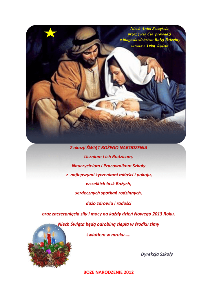 Niech Anioł Szczęścia przez życie Cię prowadzi a błogosławieństwo Bożej Dzieciny zawsze z Tobą będzie Z okazji ŚWIĄT BOŻEGO NARODZENIA Uczniom i ich Rodzicom, Nauczycielom i Pracownikom Szkoły z najlepszymi życzeniami miłości i pokoju, wszelkich łask Bożych, serdecznych spotkań rodzinnych, dużo zdrowia i radości oraz zaczerpnięcia siły i mocy na każdy dzień Nowego 2013 Roku. Niech Święta będą odrobiną ciepła w środku zimy światłem w mroku….. Dyrekcja Szkoły BOŻE NARODZENIE 2012 WIGILIA 2012