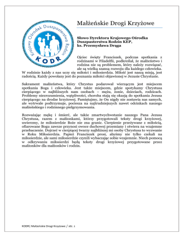 Małżeńskie Drogi Krzyżowe Słowo Dyrektora Krajowego Ośrodka Duszpasterstwa Rodzin KEP, ks. Przemysława Drąga Ojciec święty Franciszek, podczas spotkania z rodzinami w Filadelfii, podkreślał, że małżeństwo i rodzina nie są problemem, który należy rozwiązać, ale są wielką szansą rozwoju dla każdego człowieka. W rodzinie każdy z nas uczy się miłości i miłosierdzia. Miłość jest naszą misją, jest radością. Każdy powołany jest do poznania miłości objawionej w Jezusie Chrystusie. Sakrament małżeństwa, który Chrystus podarował wierzącym jest miejscem spotkania Boga i człowieka. Jest także miejscem, gdzie spotykamy Chrystusa cierpiącego w najbliższych nam osobach – mężu, żonie, dzieciach, rodzicach. Problemy niezrozumienia, wątpliwości, choroba stają się okazją do spotkania Jezusa cierpiącego na drodze krzyżowej. Pamiętajmy, że On nigdy nie zostawia nas samych, ale wytrwale podtrzymuje, pociesza na najtrudniejszych nawet odcinkach naszego małżeńskiego i rodzinnego pielgrzymowania. Rozważając mękę i śmierć, ale także zmartwychwstanie naszego Pana Jezusa Chrystusa, razem z małżonkami, którzy przygotowali teksty drogi krzyżowej, uwierzmy, że miłosierdzie Boże nie zna granic. Cierpienie przeżywane z miłością, ofiarowane Bogu zawsze przynosi owoce duchowej przemiany i otwiera na wzajemne przebaczenie. Dojrzeć w cierpiącej twarzy najbliższej mi osoby Chrystusa to wyzwanie w Roku Miłosierdzia. Papież Franciszek prosi, abyśmy nie tylko czekali na miłosierdzie, ale sami miłosierdzie czynili wybaczając sobie wzajemnie. Niech pomocą w odkrywaniu miłosierdzi będą teksty drogi krzyżowej przygotowane przez małżonków dla małżonków i rodzin. KODR| Małżeńskie Drogi Krzyżowe / str. 1 Droga krzyżowa I Małżeństwo jest drogą świętości Wstęp Święty Jan Paweł II powiedział w 1999 r. w Nowym Sączu, że małżeństwo jest drogą świętości, nawet wtedy, gdy staje się Drogą Krzyżową. Rozważając poszczególne stacje Drogi Krzyżowej będziemy czasem utożsamiać się z Panem Jezusem, a czasem, niestety, z tymi, którzy Go na śmierć skazali. Rozważając poszczególne stacje, przyjmujmy Boże błogosławieństwo na drodze do świętości każdego z nas żyjącego w małżeństwie, zobaczmy nasze własne zmagania o dobro, zmagania ze złem, codzienne wybory między miłością, a wszystkim, co jest jej przeciwieństwem. Zauważmy, że droga krzyżowa jest drogą okazywania nam przez Pana Jezusa miłosierdzia. Ufajmy w zmartwychwstanie naszego małżeństwa jeszcze tu na ziemi i radujmy się zapowiedzią zmartwychwstania każdego z nas po śmierci. Stacja I Jezus skazany na śmierć Kłaniamy Ci się, Panie Jezu Chryste, i błogosławimy Tobie, że przez krzyż i mękę swoją odkupiłeś świat. Jezus usłyszał: On bluźni! Ale to nie Jezus bluźnił, tylko Jego oskarżyciele. W jakże wielu małżeństwach usłyszeć taki dialog: - Z tobą w ogóle nie można się dogadać. - To przecież ty nie chcesz ze mną rozmawiać! - Nie będę z tobą rozmawiać tym tonem! - Ach, szkoda się odzywać. - Widzisz tylko swoje sprawy i nie zauważasz, jak mi ciężko. - Nasze małżeństwo jest tylko na papierze i tak już niestety pozostanie. - Rozwiodę się z tobą! Wyrażam swoje emocje, nakręcam je. Mówię bez sensu, raniąc męża/ żonę. Oskarżam, a tak naprawdę wyrażam swój własny problem. Czyż to, co mówię, nie jest bluźnierstwem? Skazuję nim na śmierć Jezusa. Czy rzeczywiście chcę skazać Go na śmierć w moim małżeństwie? Któryś za nas cierpiał rany, Jezu Chryste, zmiłuj się nad nami. Stacja II Pan Jezus bierze krzyż na swoje ramiona. Kłaniamy Ci się, Panie Jezu Chryste, i błogosławimy Tobie, że przez krzyż i mękę swoją odkupiłeś świat. Pan Jezus z pokorą wziął krzyż na swoje ramiona, bo wiedział. że będzie to znak zwycięstwa. A mnie tak trudno dźwigać krzyż codzienności w moim małżeństwie, w mojej rodzinie. Tak trudno wysłuchać siebie nawzajem, zrozumieć, przebaczyć. Bo KODR| Małżeńskie Drogi Krzyżowe / str. 2 jestem zmęczony, bo brak czasu i pośpiech, rozdrażnienie. I wtedy łatwiej o ocenę niż zrozumienie. Z wielkim trudem przychodzi nam wtedy dialog. Odczuwamy go jako ciężki krzyż, który najchętniej chcielibyśmy odrzucić. Panie Jezu, przepraszamy Cię za brak pokory w naśladowaniu Ciebie. Naucz nas z miłością przyjmować dar dialogu w naszym małżeństwie, chociaż jest to czasem tak bardzo trudne. Któryś za nas cierpiał rany, Jezu Chryste, zmiłuj się nad nami. Stacja III Pan Jezus upada pod krzyżem Kłaniamy Ci się, Panie Jezu Chryste, i błogosławimy Tobie, że przez krzyż i mękę swoją odkupiłeś świat. Jest trudno, bo krzyż ciężki, łatwo się poddać, uznać, że się nie powiodło, więc już nie warto rozmawiać, nie warto podejmować dialogu. Lepiej zrezygnować i nie iść dalej. A jednak trzeba się podnieść, wstać i iść. Przecież miłość, to nie uczucie – raz przyjemne, a potem przykre. Miłość to postawa, to cierpliwość, która oczyszcza, uzdrawia i umacnia. Jeżeli powstanę, jeżeli zbliżę się do Ciebie, Panie Jezu, znowu, jeżeli odbuduję więź ze współmałżonkiem, to nie będzie jak dawniej, ale jeszcze piękniej, jak po zdaniu trudnego egzaminu. Któryś za nas cierpiał rany, Jezu Chryste, zmiłuj się nad nami. Stacja IV Spotkanie z Matką Kłaniamy Ci się, Panie Jezu Chryste, i błogosławimy Tobie, że przez krzyż i mękę swoją odkupiłeś świat. Maryja wiedziona miłością przedarła się przez tłum na spotkanie z Synem. W naszych małżeństwach nie musimy przedzierać się przez tłum, żeby spotkać się ze sobą. A jednak, mimo bliskości fizycznej, nasz dialog staje się czasem drogą krzyżową. A kiedyś było tak dobrze… Może zbyt duża pewność siebie, a może rutyna sprawiły, że coś się popsuło. Nawet nie zauważyłam, kiedy m