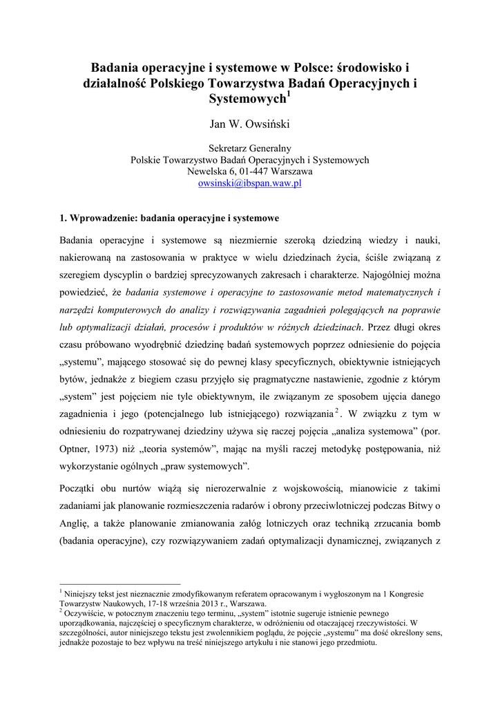 Badania operacyjne i systemowe w Polsce: środowisko i działalność Polskiego Towarzystwa Badań Operacyjnych i Systemowych1 Jan W. Owsiński Sekretarz Generalny Polskie Towarzystwo Badań Operacyjnych i Systemowych Newelska 6, 01-447 Warszawa [email protected] 1. Wprowadzenie: badania operacyjne i systemowe Badania operacyjne i systemowe są niezmiernie szeroką dziedziną wiedzy i nauki, nakierowaną na zastosowania w praktyce w wielu dziedzinach życia, ściśle związaną z szeregiem dyscyplin o bardziej sprecyzowanych zakresach i charakterze. Najogólniej można powiedzieć, że badania systemowe i operacyjne to zastosowanie metod matematycznych i narzędzi komputerowych do analizy i rozwiązywania zagadnień polegających na poprawie lub optymalizacji działań, procesów i produktów w różnych dziedzinach. Przez długi okres czasu próbowano wyodrębnić dziedzinę badań systemowych poprzez odniesienie do pojęcia „systemu”, mającego stosować się do pewnej klasy specyficznych, obiektywnie istniejących bytów, jednakże z biegiem czasu przyjęło się pragmatyczne nastawienie, zgodnie z którym „system” jest pojęciem nie tyle obiektywnym, ile związanym ze sposobem ujęcia danego zagadnienia i jego (potencjalnego lub istniejącego) rozwiązania 2 . W związku z tym w odniesieniu do rozpatrywanej dziedziny używa się raczej pojęcia „analiza systemowa” (por. Optner, 1973) niż „teoria systemów”, mając na myśli raczej metodykę postępowania, niż wykorzystanie ogólnych „praw systemowych”. Początki obu nurtów wiążą się nierozerwalnie z wojskowością, mianowicie z takimi zadaniami jak planowanie rozmieszczenia radarów i obrony przeciwlotniczej podczas Bitwy o Anglię, a także planowanie zmianowania załóg lotniczych oraz techniką zrzucania bomb (badania operacyjne), czy rozwiązywaniem zadań optymalizacji dynamicznej, związanych z 1 Niniejszy tekst jest nieznacznie zmodyfikowanym referatem opracowanym i wygłoszonym na 1 Kongresie Towarzystw Naukowych, 17-18 września 2013 r., Warszawa. 2 Oczywiście, w potocznym znaczeniu tego terminu, „system” istotnie sugeruje istnienie pewnego uporządkowania, najczęściej o specyficznym charakterze, w odróżnieniu od otaczającej rzeczywistości. W szczególności, autor niniejszego tekstu jest zwolennikiem poglądu, że pojęcie „systemu” ma dość określony sens, jednakże pozostaje to bez wpływu na treść niniejszego artykułu i nie stanowi jego przedmiotu. potencjalną wojną w powietrzu i zbrojeniami rakietowymi (badania systemowe).3 Okazało się jednak bardzo szybko, że rozwijająca się metodyka rozwiązywania zagadnień związanych z wojskowością, w tym logistyką i optymalizacją w czasie i przestrzeni, ma ogromne pole zastosowań cywilnych, przede wszystkim w organizacji i optymalizacji produkcji oraz właśnie w logistyce. Prace nad metodami, które można zaliczyć do rozpatrywanej dziedziny, doprowadziły do powstania, na przełomie lat 40-tych i 50-tych XX wieku, teorii sterowania optymalnego, techniki programowania liniowego, teorii informacji, teorii gier, teorii kolejek, itp. Rozwijano zatem także bardzo dynamicznie metody, oparte na teorii prawdopodobieństwa i statystyce matematycznej, niezmiernie przydatne w analizie i projektowaniu w odniesieniu do tych zagadnień – a stanowią one znakomitą większość wszystkich rozpatrywanych zagadnień praktycznych – w których losowa niepewność odgrywa istotną rolę (por. Singh, 1971). Stworzono niezwykle szeroki wachlarz metodyk, mających zastosowanie w bardzo wielu dziedzinach życia gospodarczego (por. Sienkiewicz, Straszak, 2008). Bardzo ważnym momentem w rozwoju badań operacyjnych i systemowych, które w zasadzie od początku były powiązane z rozwojem informatyki (zaistnieniem i upowszechnieniem komputerów), była „rewolucja informatyczna”. Zaistnienie tej nowej jakości, z jednej strony umożliwiło (łatwe) prowadzenie operacji na obszernych zbiorach danych i na ich często złożonych strukturach, które to operacje poprzednio były niedostępne, a z drugiej strony – spowodowała konieczność rozwiązywania nowych zagadnień (np. związanych z rozdziałem zadań między komputerami, rzeczywistymi lub wirtualnymi, czy analizą niezawodności sieci komputerowych). Łatwo się zorientować, że tak pojmowana dziedzina badań operacyjnych i systemowych graniczy lub nakłada się wręcz na wiele dyscyplin, których charakter i zawartość merytoryczna są w pewnym sensie lepiej określone. Dotyczy to przede wszystkim matematyki (zwłaszcza matematyki stosowanej), statystyki, informatyki, ekonomii, czy zarządzania, ale także, w istocie, szerokiego spektrum dziedzin zastosowań, a więc wojskowości, logistyki, transportu, organizacji produkcji, ochrony zdrowia, ekologii, energetyki, itp. 3 „Teoria systemów” była, naturalnie, rozwijana, zwłaszcza w kontekście nauk biologicznych (por. Ludwig von Bertalanffy, 1973), choć próbowano ją rozciągnąć na wszelkie rodzaje systemów, jednakże stopień jej operacjonalizacji był znikomy, a przydatność praktyczna prawie żadna. Była ona raczej pewnym, interesującym, opisem zjawisk i procesów, o niewielkiej zawartości konstruktywnej. Ciekawy zbiór tekstów na temat „teorii systemów” został opublikowany przez F. E. Emery’ego (1969). Pewną ilustracją tej szczególnej sytuacji badań operacyjnych i systemowych jest Rys. 1, pokazujący przykład współdziałania szeregu dyscyplin przy formułowaniu, analizowaniu i rozwiązywaniu zadania z określonej klasy, powszechnie przyjmowanego jako par excellence należącego do dziedziny badań operacyjnych (faktycznie – będącego jednym z reprezentatywnych zadań z tej dziedziny). Zadanie optymalizacji wielkości zamówienia / stanu zapasów Zarządzanie, logistyka, mikroekonomia: postać, kryterium oceny rozwiązania Sformułowanie zadania Matematyka stosowana: postać, własności, istni