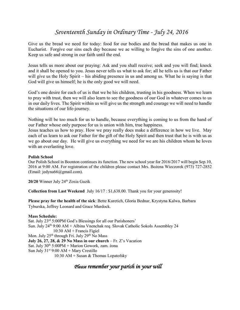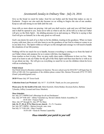 Seventeenth Sunday in Ordinary Time - July 24, 2016 Give us the bread we need for today: food for our bodies and the bread that makes us one in Eucharist. Forgive our sins each day because we ae willing to forgive the sins of one another. Keep us safe and strong in our faith until the end. Jesus tells us more about our praying: Ask and you shall receive; seek and you will find; knock and it shall be opened to you. Jesus never tells us what to ask for; all he tells us is that our Father will give us the Holy Spirit – his abiding presence in us and among us. What he is saying is that God will give us himself; he is the only good we will need. God’s one desire for each of us is that we be his children, trusting in his goodness. When we learn to pray with trust, then we will also learn to see the goodness of our God in whatever comes to us in our daily lives. The Spirit within us will give us the strength and courage we will need to handle the situations of our life-journey. Nothing will be too much for us to handle, because everything is coming to us from the hand of our Father whose only purpose for us is union with him, true happiness. Jesus teaches us how to pray. How we pray really does make a difference in how we live. May each of us learn to ask our Father for the gift of the Holy Spirit and then trust that he is with us as we go about our day. He will give us everything we need for we are his children whom he loves with an everlasting love. Polish School Our Polish School in Boonton continues its function. The new school year for 2016/2017 will begin Sep.10, 2016 at 9:00 AM. For registration of the children please contact Mrs. Bożena Wieczorek (973) 727-2852 (Email: [email protected]). 20/20 Winner July 24th Zosia Guzik Collection from Last Weekend July 16/17 : $1,638.00. Thank you for your generosity! Please pray for the health of the sick: Bette Kuretich, Gloria Bednar, Krystyna Kalwa, Barbara Tyburska, Jeffrey Leonard and Grace Murdock. Mass Schedule: Sat. July 23rd 5:00PM God’s Blessings for all our Parishoners’ Sun. July 24th 9:00 AM + Albina Vnenchak req. Slovak Catholic Sokols Assembley 24 10:30 AM + Francis Figiel Mon. July 25th through Fri. July 29th No Mass July 26, 27, 28, & 29 No Mass in our church – Fr. Z’s Vacation Sat. July 30th 5:00PM + Marion Gowork, zam. żona Sun July 31st 9:00 AM + Mary Crestillo 10:30 AM + Susan & Thomas Lopatofsky Please remember your parish in your will Siedemnasta Niedziela Zwykła – 24 lipca, 2016 O Sprawiedliwości Bożej Pan Bóg postanowił dać pouczenie Abrahamowi o powodach bliskiego zburzenia Sodomy. Chciał, aby Abraham nie patrzył na zniszczenie Sodomy od zewnątrz, jako na naturalne tylko zdarzenie, ale też i od wewnątrz, jako na zamierzone działanie Boże w historii. Przez pośrednictwo Abrahama ludzie Sodomy zaczęli płakać i błagać Boga o uratowanie ich życia. Natomiast Abraham „wyłócał się” z Bogiem czy zniszczy całe miasto jeżeli znajdzie się tam przynajmniej piećdziesięciu ... czterdziestu, trzydziestu, dwudziestu, lub dziesięciu ... sprawiedliwych? Tym wołaniem o pomoc był nie tylko płacz tych mieszkańców Sodomy, którzy muszieli znosić ucisk swych ziomków i apelem do Boga o wymierzenie im sprawiedliwości, ale też i krzyk samych grzesznych mieszkańców tych miast. Każdy bowiem grzech, jak krew sprawiedliwego Abla krzyczy do Boga o karę (Rdz 4, 10). Aczkolwiek Bóg zna dobrze występki mieszkańców Sodomy i Gomory, to jednak tak jak w raju przeprowadzał dochodzenie winy pierwszych rodziców, tak i teraz postanowił udać się do tych miast, aby dokładnie dowiedzieć się o rzeczywistości popełnionych tam zbrodni. Na wzgórzu położonym na wschód od Hebronu, skąd rozciągał się widok na grzeszną Sodomę, wstawił się Abraham za grzesznym miastem do sprawiedliwego Boga. To miasto nie przeczuwało, że tu, na tym wzgórzu rozegrał się największy dramat historii Starego Testamentu: walka modlitwy świętego orędownika ze sprawiedliwością Bożą, mającą ukarać miasto. Nie chodziło bowiem Abrahamowi jedynie o wyratowanie Lota, mieszkającego w Sodomie, ale o wszystkich jej mieszkańców i całą grzeszną ludzkość. Sodoma bowiem jest dla Abrahama obrazem ludzkiej społeczności, którą Bóg powołał przed swój sąd. Jak przy każdym ludzkim sądzie, tak i przy Bożym sądzie ważna jest rola pośrednia, czyli w naszych czasach, kapłana, który wstawia się do Boga za powierzonymi mu grzesznikami. Często jednak oceniamy rolę kapłana tylko po ludzku „jako jednego z nas.” Polska Szkoła Polska Szkoła przy naszej Parafii w Boonton kontynuuje swoją działalność. Nowy Rok szkolny 2016/2017 rozpocznie się 10-go września 2016 o godz. 9:00. Rejestrację dzieci proszę zgłaszać do Pani Bożeny Wieczorek: Tel. (973) 727-2852 (Email: [email protected]). Pierwszo-Sobotnie Nabożeństwo do Matki Bożej. W Pierwsze Soboty Miesiąca prosimy Matkę Bożą Fatimską w naszej Parafii o pokój na świecie oraz o Jej szczególną opiekę nad naszymi rodzinami, parafią i naszą ojczyzną. Specjalne nabożeństwo z wystawieniem Najświętszego Sakramentu i okazją do spowiedzi, (zakończone Mszą Świętą) rozpoczyna się zawsze o godz. 6:00 wieczorem. Serdecznie zapraszamy do wspólnej modlitwy. Taca z ostatniego weekendu: 16/17 lipca: $ 1,638.00. Dziękujemy za hojność. 20/20 Wygrana 24 lipca: Zosia Guzik