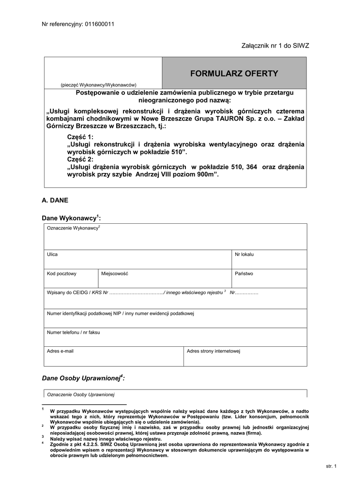 Nr referencyjny: 011600011 Załącznik nr 1 do SIWZ FORMULARZ OFERTY (pieczęć Wykonawcy/Wykonawców) Postępowanie o udzielenie zamówienia publicznego w trybie przetargu nieograniczonego pod nazwą: „Usługi kompleksowej rekonstrukcji i drążenia wyrobisk górniczych czterema kombajnami chodnikowymi w Nowe Brzeszcze Grupa TAURON Sp. z o.o. – Zakład Górniczy Brzeszcze w Brzeszczach, tj.: Część 1: „Usługi rekonstrukcji i drążenia wyrobiska wentylacyjnego oraz drążenia wyrobisk górniczych w pokładzie 510”. Część 2: „Usługi drążenia wyrobisk górniczych w pokładzie 510, 364 oraz drążenia wyrobisk przy szybie Andrzej VIII poziom 900m”. A. DANE Dane Wykonawcy1: Oznaczenie Wykonawcy2 Ulica Kod pocztowy Nr lokalu Miejscowość Państwo Wpisany do CEIDG / KRS Nr ……………………………../ innego właściwego rejestru 3 Nr…………… Numer identyfikacji podatkowej NIP / inny numer ewidencji podatkowej Numer telefonu / nr faksu Adres e-mail Adres strony internetowej Dane Osoby Uprawnionej4: Oznaczenie Osoby Uprawnionej 1 2 3 4 W przypadku Wykonawców występujących wspólnie należy wpisać dane każdego z tych Wykonawców, a nadto wskazać tego z nich, który reprezentuje Wykonawców w Postępowaniu (tzw. Lider konsorcjum, pełnomocnik Wykonawców wspólnie ubiegających się o udzielenie zamówienia). W przypadku osoby fizycznej imię i nazwisko, zaś w przypadku osoby prawnej lub jednostki organizacyjnej nieposiadającej osobowości prawnej, której ustawa przyznaje zdolność prawną, nazwa (firma). Należy wpisać nazwę innego właściwego rejestru. Zgodnie z pkt 4.2.2.5. SIWZ Osobą Uprawnioną jest osoba uprawniona do reprezentowania Wykonawcy zgodnie z odpowiednim wpisem o reprezentacji Wykonawcy w stosownym dokumencie uprawniającym do występowania w obrocie prawnym lub udzielonym pełnomocnictwem. str. 1 Nr referencyjny: 011600011 Ulica Nr lokalu Miejscowość Kod pocztowy Państwo Numer telefonu / nr faksu Adres e-mail Adres strony internetowej Adres do korespondencji: Ulica Nr lokalu Kod pocztowy Miejscowość Państwo Dane użytkownika uprawnionego do udziału ze strony Wykonawcy w aukcji elektronicznej5: Imię e-mail Nazwisko Numer telefonu Dodatkowe dane PESEL niezbędny do weryfikacji podpisu elektronicznego B. PARAMETRY OFERTY STANOWIĄCE KRYTERIA OCENY OFERT Nawiązując do ogłoszenia o zamówieniu publicznym prowadzonym w trybie przetargu nieograniczonego na realizację zamówienia pod nazwą Usługi kompleksowej rekonstrukcji i drążenia wyrobisk górniczych czterema kombajnami chodnikowymi w Nowe Brzeszcze Grupa TAURON Sp. z o.o. – Zakład Górniczy Brzeszcze w Brzeszczach, tj.: Część 1: „Usługi rekonstrukcji i drążenia wyrobiska wentylacyjnego oraz drążenia wyrobisk górniczych w pokładzie 510”. Część 2: „Usługi drążenia wyrobisk górniczych w pokładzie 510, 364 oraz drążenia wyrobisk przy szybie Andrzej VIII poziom 900m”. oznaczonego numerem referencyjnym: 011600011 dla Nowe Brzeszcze Grupa TAURON Sp. z o.o. – Zakład Górniczy Brzeszcze. 1) Oświadczamy, że zamówienie zostanie przez nas wykonane za Cenę brutto (Kryterium: Cena – waga 70%): …………………………………………………………………………………………… PLN 5 Dane powinny być zgodne z danymi umieszczonymi w podpisie elektronicznym. str. 2 Nr referencyjny: 011600011 (słownie: ...............…………………………………………………………………………… ………………………………………………………………………………………………….) Sposób wyliczenia ceny brutto przedstawia Formularz Cenowy stanowiący Załącznik nr 1 do Formularza Oferty. Oświadczamy, że Termin realizacji Przedmiotu Zamówienia zostanie 2) przez nas wykonany w okresie: Część 1: a) dla zadania 1 – NRK 5 - ……………….. miesięcy b) dla zadania 2 – NRK 6 - ……………….. miesięcy Część 2: a) dla zadania 1 – NRK 4 - ……………….. miesięcy b) dla zadania 2 – NRK 3 - ……………….. miesięcy licząc od daty protokolarnego przekazania frontu robót przez Zamawiającego (Kryterium: Termin realizacji – waga 20%): Oświadczamy, że udzielamy gwarancji jakości na wykonany Przedmiot c) Zamówienia na okres Część 1 …………….….. miesięcy, Część 2 …………….….. miesięcy, licząc od daty podpisania przez Zamawiającego miesięcznych protokołów odbioru robót lub protokołów odbioru końcowego robót (Kryterium: Gwarancja – 10%). C. OŚWIADCZENIA I ZAPEWNIENIA WYKONAWCY 1. Podana przez nas Cena zawiera wszelkie koszty niezbędne do zrealizowania zamówienia wynikające z zakresów i warunków określonych w SIWZ. 2. Oświadczamy, że niedoszacowanie, pominięcie lub brak należytego rozpoznania przez nas zakresu Przedmiotu Zamówienia nie jest podstawą do żądania zmiany wysokości wynagrodzenia. 3. Oświadczamy, że jesteśmy zdolni do wykonania Przedmiotu Zamówienia zgodnie z wymaganiami podanymi w SIWZ. 4. Oświadczamy, że przedmiot oferty jest zgodny z opisem Przedmiotu Zamówienia. str. 3 Nr referencyjny: 011600011 5. Oświadczamy, że zapoznaliśmy się z treścią SIWZ, nie wnosimy do niej zastrzeżeń oraz że uzyskaliśmy wszystkie informacje niezbędne do właściwego przygotowania oferty. 6. Oświadczamy, iż zapoznaliśmy się z terminem realizacji zamówienia wskazanym przez Zamawiającego w SIWZ. 7. Oświadczamy, że akceptujemy treść załączonego do SIWZ Wzoru Umowy wraz ze wszystkimi załącznikami. 8. Wadium w wysokości…………………………………………………....…..…..PLN (słownie: ……………………………………………………………………………………… …………………………………………………………………………………………..………) w formie.............................................................. 