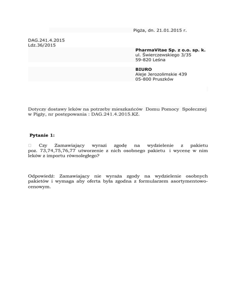 PigŜa, dn. 21.01.2015 r. DAG.241.4.2015 Ldz.36/2015 PharmaVitae Sp. z o.o. sp. k. ul. Świerczewskiego 3/35 59-820 Leśna BIURO Aleje Jerozolimskie 439 05-800 Pruszków Dotyczy dostawy leków na potrzeby mieszkańców Domu Pomocy Społecznej w PigŜy, nr postępowania : DAG.241.4.2015.KZ. Pytanie 1:  Czy Zamawiający wyrazi zgodę na wydzielenie z pakietu poz. 73,74,75,76,77 utworzenie z nich osobnego pakietu i wycenę w nim leków z importu równoległego? Odpowiedź: Zamawiający nie wyraŜa zgody na wydzielenie osobnych pakietów i wymaga aby oferta była zgodna z formularzem asortymentowocenowym.