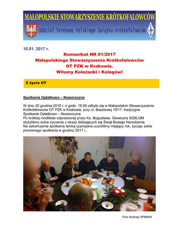 10.01. 2017 r. Komunikat NR 01/2017 Małopolskiego Stowarzyszenia Krótkofalowców OT PZK w Krakowie. Witamy Koleżanki i Kolegów! Z życia OT Spotkanie Opłatkowo – Noworoczne W dniu 20 grudnia 2016 r. o godz. 19.00 odbyło się w Małopolskim Stowarzyszeniu Krótkofalowców OT PZK w Krakowie, przy ul. Basztowej 15/17, tradycyjne Spotkanie Opłatkowo – Noworoczne. Po krótkiej modlitwie odprawionej przez Ks. Bogusława Seweryna SQ9LGM złożyliśmy sobie życzenia z okazji zbliżających się Świąt Bożego Narodzenia. Na zakończenie spotkania lamką szampana uczciliśmy mijający rok, życząc sobie ponownego spotkania w grudniu 2017 r.. Foto Andrzej SP9MAX Pożegnanie Był ratownikiem, przewodnikiem i krótkofalowcem. Ks. Szczepan Gacek spoczął na cmentarzu w Gliczarowie Górnym. Ratownicy i przewodniczy górscy towarzyszyli w ostatniej drodze ks. Gackowi, który należał do ich grona. Uroczystości pogrzebowe kapłana archidiecezji krakowskiej odbyły się 5 stycznia w Gliczarowie Górnym koło Bukowiny Tatrzańskiej. Przewodniczył im bp Jan Szkodoń wraz z ks. inf. Stanisławem Olszówkš. Uroczystości rozpoczęły się od Mszy w. W parafialnym kościele, w którym przez 25 lat duszpasterzował zmarły kapłan. Żegnał go m.in. kolega z roku ks. Józef Morawa. Słowo pożegnalne w imieniu przewodników i ratowników TOPR wygłosił także ratownik i przewodnik Apoloniusz Rajwa. - Twoich dokonań na niwie górskiej jest tak wiele, gdyż poza posługą kapłańską miałeś w życiu wiele pasji, z których prawie wszystkie wiązały się z górami - turystyka, przewodnictwo, ratownictwo, narciarstwo, krótkofalarstwo. Przez te pasje starałeś się trafić do każdego, by poprzez piękno gór i przyrody pokazać drogę wiodącą do Stwórcy - mówił. Przypomniał słowa ks. Gacka o górach, które wypowiedział przed laty: "Góry uczyły mnie pokory, precyzji w działaniu i odpowiedzialności. W górach zawsze czułem się wolny, oderwany od codziennych zmartwień. Chodziłem w nie nieraz samotnie, odprawiając swoiste rekolekcje i z gór wracałem pokrzepiony wewnętrznie. Ale w góry prowadziłem też młodzież - młodzi otwierają się w górach i uczą się wielu przydatnych rzeczy - o sobie, o życiu, o urodzie wiata, a nieraz odnajdują również drogę do Boga". Piotr Bak, starosta tatrzański obecny na uroczystościach pogrzebowych, przypomniał z kolei, że ks. Gacek przez wiele lat angażował się w akcje dostarczania w konspiracji materiałów religijnych do Czechosłowacji, które grupka górali nosiła przez tatrzańskie szlaki. W tym okresie kapłan był wikarym w zakopiańskiej parafii na Chramcówkach. Kapłana żegnali także krótkofalowcy w osobie ks.Tadeusza Bargiela SP9XWY,dla których ks. Gacek był kapelanem i organizował zjazdy w Gliczarowie. - Już nie usłyszymy na falach eteru SP9VRJ. Za każdym razem żegnałeś się z nami pozdrowieniem: "Szczęść, Boże!" . A. Rajwa przypominał również, że ks. Gacek był autorem wielu publikacji. Z tych naszych wieloletnich spotkań pozostaną wspomnienia, gdyż były one budujące, dające wiele otuchy i nadziei, oraz to, co zdążyłeś napisać mówił. Wśród ważnych tytułów autorstwa zmarłego kapłana znalazły się m.in. "Modlitewnik dla ratowników górskich" czy "Słowo Boże dla ludzi gór" oraz "Sacrum na szlakach tatrzańskich". A. Rajwa podziękował też ks. Gackowi za prowadzenie ostatniego pożegnania jego żony i syna. Do Gliczarowa Górnego przyjechało wielu ratowników tworzących Grupę Beskidzką GOPR ze Szczyrku i Bielska-Białej. To właśnie w Szczyrku, będąc tam na parafii, ks. Szczepan rozpoczął swoją przygodę z ratownictwem górskim i przewodnictwem. Jeden z ratowników odczytał okolicznościowy list burmistrza Szczyrku Adama Byrdy. Było też pożegnanie wypowiedziane w gwarze podhalańskiej przez jedną z gaździn z miejscowego oddziału Związku Podhalan. - Z całego serca i z wielkim smutkiem zegnome wos tu, na nasej skalnej glycarowskiej dziedzinie. Tu u stop granitowych Tater koncycie swoj lak ziemskich wędrówek - mówiła parafianka w stroju góralskim. W ostatnim pożegnaniu zmarłego kapłana wzięli udział bardzo licznie mieszkańcy Gliczarowa, obecny był wójt gminy Biały Dunajec, delegacje z pocztami sztandarowymi Związku Podhalan, OSP, GOPR, TOPR, szkół i innych organizacji, jednostek oraz instytucji. Zmarłego kapłana, oprócz rzeszy wiernych i najbliższej rodziny, na cmentarz odprowadzili bardzo liczni duchowni z dekanatu Białka Tatrzańska, reprezentujący parafie na Podhalu i inne wspólnoty. Dojechali także koledzy z roku seminaryjnego ks. Gacka. Ostatnią modlitwę na cmentarzu poprowadzili bp Szkodoń oraz ks. inf. Olszówka, wieloletni proboszcz parafii Najświętszej Rodziny w Zakopanem i dziekan zakopiański. Wierni przynieśli niezliczone wieńce i wiązanki kwiatów. Podczas ostatniej ziemskiej drogi ks. Szczepana przygrywała kapela góralska. Jeden z muzykantów przy trumnie z ciałem kapłana zagrał na cmentarzu również na trombicie. Poczty sztandarowe były przystrojone czarnym kirem, a w momencie złożenia ciała zmarłego duchownego do grobu zabrzmiały syreny z wozów strażackich. Wszystkim za obecność i gorliwą modlitwę podziękował ks. Andrzej Rafacz, obecny proboszcz parafii w Gliczarowie. Warto dodać, że Gliczarów żegnał ks. Szczepana opadami śniegu i prawdziwym zimowym krajobrazem. Z tej podhalańskiej miejscowości rozciąga się jedna z najpiękniejszych tatrzańskich panoram. Ks. Szczepan Gacek zmarł po długiej i ciężkiej chorobie w krakowskim Hospicjum w. Łazarza. Miał 69 lat. Urodził się w Rabce. Cześć Jego pamięci. Zaproszenie na XXIII Spotkanie Opłatkowe KLUB RABY SP9KDR oraz KLUB SP9KPK (Krakowsko-Podhalańska Grupa Krótkofalarska) Serdecznie zapraszają Szanowne Koleżanki i Kolegów Radioamatorów, ich Rodziny i Przyjaciół na XXIII Spotkanie Opłatkowe 28 stycznia 2017 w D