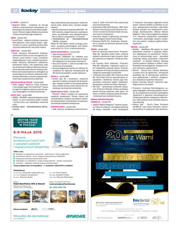 12 A1 DENTAL – stoisko P1 • Magnetic Mallet – urządzenie do chirurgii kostnej o wszechstronnym zastosowaniu, wykorzystujące do działania pole elektromagnetyczne. Podczas targów odbędzie się pierwsza w Polsce prezentacja tego urządzenia. ABOOK – stoisko D15 • Laurel Coats – rękawice nitrylowe z owsianym Beta-glukanem, który wpływa kojąco i regenerująco na suchą i podrażnioną skórę dłoni, utrzymuje właściwe pH i naturalnie nawilża. ANGER G&A – stoisko W52 • Skaler elastyczny Removelle-M metalowy: perforowana taśma ze stali chirurgicznej znakomicie usuwa kamień i osad z przestrzeni międzyzębowych, w tym z punktów stycznych. • Skaler elastyczny Removelle-P poliestrowy: perforowana taśma z folii poliestrowej może być stosowana do higieny codziennej przez pacjenta jako alternatywa dla nici dentystycznej. • Korony tymczasowe wykonane z poliwęglanu są bardzo odporne na ścieranie. Doskonale zabezpieczają odsłoniętą w procesie preparacji zębinę do czasu osadzenia korony właściwej. COLGATE-PALMOLIVE POLAND – stoisko W64 • Pasta Colgate® Maximum Cavity Protection z technologią Sugar Acid Neutraliser™ opartą na argininie i węglanie wapnia to nowa koncepcja w zapobieganiu chorobie próchnicowej. DENTAL PLUS – stoisko W60 • CREDIA – BELMONT, Japonia Następczyni znanej CLESTY: ta sama niezawodna jakość, trwałość i komfort pracy przy zaskakująco korzystnej cenie. • EXPRESS ORIGO – INSTRUMENTARIUM DENTAL, Finlandia. AD nowości targowe Nowy model skanera płyt obrazowych: cienkie elastyczne płytki, idealny obraz, intuicyjne oprogramowanie. • Bloczki cyrkonowe do systemów CAD/CAM – KEROX: naturalne, wstępnie barwione, wysokoprzezierne, do podbudów i prac pełnokonturowych, 95 mm, 98 mm, kompatybilne z 71’ Ceramill. • PANTOMOGRAF 3D – INSTRUMENTARIUM DENTAL, Finlandia. Model OP 300 Maxio: nowość znanego producenta i wynalazcy pantomografu, pole obrazowania aż do 13 x 15 cm, 5 warstw panoramy. DENTAL PROFESSIONALS – stoisko D28 • Zęby kompozytowe NFC+ • Artykulator CANDULOR 3.0: naśladuje przestrzenne ruchy żuchwy i współpracuje ze wszystkimi dostępnymi na rynku łukami twarzowymi. • Accu-Dent System 1: łyżki do wycisków anatomicznych przy bezzębiu. • Candulor Registration Set Set 10 i CRS Set 15: urządzenia do rejestracji wewnątrzustnej wg Mc Grane’a do bezzębia i szczęk uzębionych. DENTAL-S – stoisko W85 • Krzesło typu 3D z niezależnym, statycznym oparciem to idealne rozwiązanie dla stomatologów, mających problem ze złą pozycją podczas pracy, produkt wprawia ciało w zdrowy rytm, dopasowując się do potrzeb użytkownika. HANSEN DENTAL POLEN – stoisko D36 - Premise™ Indirect: kompozyt do wykonywania uzupełnień protetycznych. Premise Indirect jest nanohybrydowym, potrójnie utwardzalnym materiałem kompozytowym, przeznaczonym do wykonywania/licowania uzupełnień protetycznych. INTERTECH DENTAL – stoisko D43 • VDW. Reciproc (endodoncja jednoinstrumen- KRAKDENT® Kraków 2015 towa) to jeden instrument który opracowuje cały kanał korzeniowy. • Endomotory VDW. Gold Reciproc, VDW. Silver Reciproc minimalizują ryzyko złamania instrumentu w kanale korzeniowym dzięki precyzyjnym ruchom oscylacyjnym. • Endometry Raypex 6 gwarantują precyzyjny pomiar długości kanału korzeniowego. • Obturatory Beefill 2in1, Guttafusion, Guttamaster to systemy do termicznej obturacji kanału korzeniowego. JENERIX – stoisko W38 • Wosk do rejestracji zwarcia Denar. Producent: Whip Mix. Specjalny kształt płytki umożliwia dokładne odwzorowanie zgryzu pacjenta. Wosk jest plastyczny po rozgrzaniu i twardy po schłodzeniu. • Łuk twarzowy Denar Slidematic. Producent: Whip Mix. Najszybszy i najprostszy system, jakim kiedykolwiek pracowali lekarze. Konstrukcja urządzenia eliminuje potrzebę przenoszenia całego łuku twarzowego na artykulator. • Artykulator Denar Mark 320. Producent: Whip Mix. Denar Mark 320 jest półnastawialnym artykulatorem. Użytkownicy docenią jego funkcjonalność, nowoczesny wygląd i dokładność. Kompatybilny z łukiem twarzowym Slidematic. • TMJ Tutor – demonstrator problemów okluzyjnych. Producent: Whip Mix. W łatwy i przystępny sposób obrazuje pacjentowi wady zgryzu, ich wpływ na mięśnie i kondycję stawów skroniowo-żuchwowych oraz możliwości leczenia. MEDICAL MAESTRO MAGAZINE, SZUMSKA.PL – stoisko D21 • „Medical Maestro Magazine”, Wydanie specjalne: Prawo dla medycyny. Jest bogatą publikacją dla lekarzy, dentystów i kadry zarządzającej w medycynie, poruszającą najgorętsze tematy prawne. Autorami tekstów są adwokaci ze znanych i profesjonalnych kancelarii z całej Polski. Wydanie specjalne jest przedłużeniem prestiżowego dwumiesięcznika „Medical Maestro Magazine”, który omawia zagadnienia związane m.in. z ekonomią, zarządzaniem, marketingiem i wizerunkiem, psychologią, relacjami z pacjentami oraz prawem i medycyną ogólną/interdyscyplinarną. MEDILAB – stoisko D40 • Medilab – MediWipes DM: gotowe do użycia jednorazowe chusteczki o wyjątkowo delikatnym oddziaływaniu na powierzchnie. Przeznaczone do jednoczesnego mycia i dezynfekcji wszelkiego rodzaju wyposażenia i powierzchni wrażliwych na działanie alkoholu. Wykazują szerokie spektrum biobójcze w krótkim czasie. Przebadane dermatologicznie. Dostępne w różnych rozmiarach i opakowaniach. • Sterisol – Sterisol Preo: preparat alkoholowy w postaci płynu do higienicznej i chirurgicznej dezynfekcji rąk. W hermetycznych jednorazowych opakowaniach z unikalnym, zintegrowanym, bezpiecznym systemem dozowania • System zamknięty Sterisol”: skutecznie zapobiega szerzeniu się zakażeń. • Procedury i Instrukcje Stomatologiczne: wygodny segregator zawierający gotowe instrukcje do przygotowania procedur zapobiegania zakażeniom w gabinecie stomatologicznym. Ułatwia gromadzenie niezbędnych dokumentów, które podczas wiz
