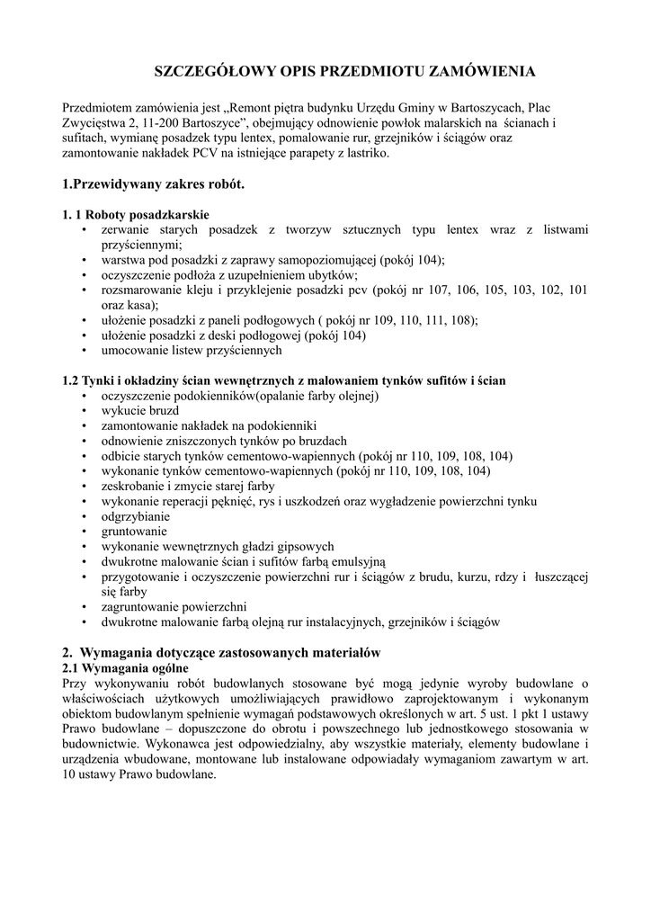 SZCZEGÓŁOWY OPIS PRZEDMIOTU ZAMÓWIENIA Przedmiotem zamówienia jest „Remont piętra budynku Urzędu Gminy w Bartoszycach, Plac Zwycięstwa 2, 11-200 Bartoszyce”, obejmujący odnowienie powłok malarskich na ścianach i sufitach, wymianę posadzek typu lentex, pomalowanie rur, grzejników i ściągów oraz zamontowanie nakładek PCV na istniejące parapety z lastriko. 1.Przewidywany zakres robót. 1. 1 Roboty posadzkarskie • zerwanie starych posadzek z tworzyw sztucznych typu lentex wraz z listwami przyściennymi; • warstwa pod posadzki z zaprawy samopoziomującej (pokój 104); • oczyszczenie podłoża z uzupełnieniem ubytków; • rozsmarowanie kleju i przyklejenie posadzki pcv (pokój nr 107, 106, 105, 103, 102, 101 oraz kasa); • ułożenie posadzki z paneli podłogowych ( pokój nr 109, 110, 111, 108); • ułożenie posadzki z deski podłogowej (pokój 104) • umocowanie listew przyściennych 1.2 Tynki i okładziny ścian wewnętrznych z malowaniem tynków sufitów i ścian • oczyszczenie podokienników(opalanie farby olejnej) • wykucie bruzd • zamontowanie nakładek na podokienniki • odnowienie zniszczonych tynków po bruzdach • odbicie starych tynków cementowo-wapiennych (pokój nr 110, 109, 108, 104) • wykonanie tynków cementowo-wapiennych (pokój nr 110, 109, 108, 104) • zeskrobanie i zmycie starej farby • wykonanie reperacji pęknięć, rys i uszkodzeń oraz wygładzenie powierzchni tynku • odgrzybianie • gruntowanie • wykonanie wewnętrznych gładzi gipsowych • dwukrotne malowanie ścian i sufitów farbą emulsyjną • przygotowanie i oczyszczenie powierzchni rur i ściągów z brudu, kurzu, rdzy i łuszczącej się farby • zagruntowanie powierzchni • dwukrotne malowanie farbą olejną rur instalacyjnych, grzejników i ściągów 2. Wymagania dotyczące zastosowanych materiałów 2.1 Wymagania ogólne Przy wykonywaniu robót budowlanych stosowane być mogą jedynie wyroby budowlane o właściwościach użytkowych umożliwiających prawidłowo zaprojektowanym i wykonanym obiektom budowlanym spełnienie wymagań podstawowych określonych w art. 5 ust. 1 pkt 1 ustawy Prawo budowlane – dopuszczone do obrotu i powszechnego lub jednostkowego stosowania w budownictwie. Wykonawca jest odpowiedzialny, aby wszystkie materiały, elementy budowlane i urządzenia wbudowane, montowane lub instalowane odpowiadały wymaganiom zawartym w art. 10 ustawy Prawo budowlane. 2.2 Szczegółowe właściwości zastosowanych materiałów: 2.2.1 roboty posadzkarskie kod (CPV 45 432111) a) elastyczna wykładzina podłogowa PCV • odporność na poślizg - PN-EN 14041 Klasa DS • grubość całkowita PN-EN 428 min. 2,0 mm • wgniecenie resztkowe PN-EN 433 0,03 mm • klasyfikacja w zakresie reakcji na ogień - PN-EN 13501-1 Bfl-s1 • kolor jasny brązowy b) sznur do spawania wykładziny • sznur spawalniczy z plastyfikowanego PCV w kolorze zbliżonym do wykładziny • średnica 4-6 mm c) roztwór do gruntowania • dyspersyjny środek gruntujący przeznaczony do przygotowania chłonnych, mineralnych podłoży przed zastosowaniem anhydrytowych i cementowych mas szpachlowych oraz cementowych zapraw klejących. Preparat stosuje się przed szpachlowaniem podłoża poprzedzającym klejenie wykładzin. d) masa wyrównująca • systemowa zaprawa pozwalająca na niwelowanie ubytków, zagłębień i innych nierówności podłoża o charakterze miejscowym e) klej do wykładzin • Klej dyspersyjny do wykładzin podłogowych z PCV i wykładzin tekstylnych układanych wewnątrz pomieszczeń. Klej do stosowania na mokro ze średnim czasem wstępnego odparowania, dobrą początkową siłą klejenia i wysoką wytrzymałością połączenia. Klej kontaktowy na bazie rozpuszczalników przeznaczony do klejenia cokołów, profili, listew i wykładzin z gładkim lub lekko ustrukturowanym spodem. f) Samopoziomująca masa cementowa przeznaczona do wyrównywania i wygładzania podłoży wewnątrz pomieszczeń. g) panele podłogowe • klasa ścieralności -EN 13329 AC5 • grubość całkowita 10-11 mm • kolor dekoru - jasny dąb • typ łączenia desek – click • grubość warstwy ścieralnej 0,6 mm • gwarancja 20 lat • podkład pod panele wykonany z włókna drzewnego tłumiący dźwięki uderzeniowe i posiadający właściwości izolacyjne h) • • • • deska podłogowa drewniana grubość warstwy użytkowej 0,6 mm Twardość w skali Brinella – 6 grubość całkowita 10-35 mm gwarancja 15 lat i) listwy wykończeniowe drewniane lite lub fornirowane do paneli i wykładziny PCV i desek podłogowych. 2.2.2 roboty tynkarskie kod (CPV 45410000 – 4) a) suche mieszanki tynkarskie przygotowane fabrycznie powinny odpowiadać wymaganiom normy PN-B-10109:1998 lub aprobat technicznych. b) masy tynkarskie do wypraw gipsowych powinny odpowiadać wymaganiom normy PN-B10106:1997 ,PN-92/B-01302 lub aprobat technicznych. c) zaprawy budowlane używane do przygotowania podłoża pod tynki powinny odpowiadać wymaganiom normy PN-90/B-14501 „Zaprawy budowlane zwykłe”. 2.2.3 roboty malarskie kod (CPV 45442100 - 8) a) • • • farba emulsyjna akrylowa (pomieszczenia) kolor jasny pastelowy (ściany) kolor biały (sufity) klasa farby – 1 b) farba emulsyjna lateksowa (korytarz) • kolor jasny pastelowy • klasa farby -1 c) farba olejna (grzejniki, rury instalacyjne, ściągi) • kolor biały 2.2.4 Roboty w zakresie stolarki budowlanej kod (CPV 45421000-4) a) nakładka PCV na parapety lastriko • • • wymiary przystosowane do parapetów wykonane z PCV kolor zbliżony do koloru posadzki