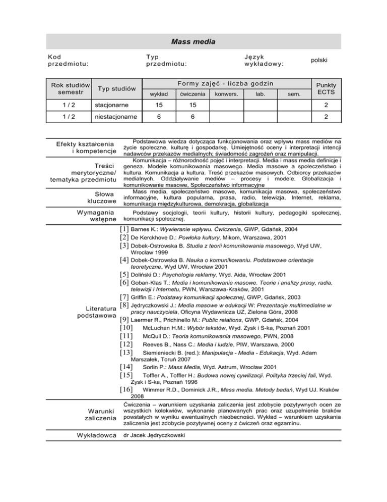 Mass media K od p rze d m iot u : Rok studiów semestr T yp p rze d m iot u : Typ studiów Ję zyk wykła d o wy: polski Fo rm y za ję ć - liczb a go d zin wykład ćwiczenia konwers. lab. sem. Punkty ECTS 1/2 stacjonarne 15 15 2 1/2 niestacjonarne 6 6 2 Słowa kluczowe Podstawowa wiedza dotycząca funkcjonowania oraz wpływu mass mediów na życie społeczne, kulturę i gospodarkę. Umiejętność oceny i interpretacji intencji nadawców przekazów medialnych; świadomość zagrożeń oraz manipulacji. Komunikacja – różnorodność pojęć i interpretacji. Media i mass media definicje i geneza. Modele komunikowania masowego. Media masowe a społeczeństwo i kultura. Komunikacja a kultura. Treść przekazów masowych. Odbiorcy przekazów medialnych. Oddziaływanie mediów – procesy i modele. Globalizacja i komunikowanie masowe, Społeczeństwo informacyjne Mass media, społeczeństwo masowe, komunikacja masowa, społeczeństwo informacyjne, kultura popularna, prasa, radio, telewizja, Internet, reklama, komunikacja międzykulturowa, demokracja, globalizacja Wymagania wstępne Podstawy socjologii, teorii kultury, historii kultury, pedagogiki społecznej, komunikacji społecznej. Efekty kształcenia i kompetencje Treści merytoryczne/ tematyka przedmiotu [1] Barnes K.: Wywieranie wpływu. Ćwiczenia, GWP, Gdańsk, 2004 [2] De Kerckhove D.: Powłoka kultury, Mikom, Warszawa, 2001 [3] Dobek-Ostrowska B. Studia z teorii komunikowania masowego, Wyd UW, [4] Wrocław 1999 Dobek-Ostrowska B. Nauka o komunikowaniu. Podstawowe orientacje teoretyczne, Wyd UW, Wrocław 2001 Doliński D.: Psychologia reklamy, Wyd. Aida, Wrocław 2001 [5] [6] Goban-Klas T.: Media i komunikowanie masowe. Teorie i analizy prasy, radia, telewizji i Internetu, PWN, Warszawa-Kraków, 2001 [7] Griffin E.: Podstawy komunikacji społecznej, GWP, Gdańsk, 2003 [8] Jędryczkowski J.: Media masowe w edukacji W: Prezentacje multimedialne w Literatura pracy nauczyciela, Oficyna Wydawnicza UZ, Zielona Góra, 2008 podstawowa [9] Laermer R., Prichinello M.: Public relations, GWP, Gdańsk, 2004 [10] McLuchan H.M.: Wybór tekstów, Wyd. Zysk i S-ka, Poznań 2001 [11] McQuil D.: Teoria komunikowania masowego, PWN, 2008 [12] Reeves B., Nass C.: Media i ludzie, PIW, Warszawa, 2000 [13] Siemieniecki B. (red.): Manipulacja - Media - Edukacja, Wyd. Adam Marszałek, Toruń 2007 Sorlin P.: Mass Media, Wyd. Astrum, Wrocław 2001 [14] [15] Toffler A., Toffler H.: Budowa nowej cywilizacji. Polityka trzeciej fali, Wyd. Zysk i S-ka, Poznań 1996 [16] Wimmer R.D., Dominick J.R., Mass media. Metody badań, Wyd UJ. Kraków 2008 Warunki zaliczenia Wykładowca Ćwiczenia – warunkiem uzyskania zaliczenia jest zdobycie pozytywnych ocen ze wszystkich kolokwiów, wykonanie planowanych prac oraz uzupełnienie braków powstałych w wyniku ewentualnych nieobecności. Wykład – warunkiem uzyskania zaliczenia jest zdobycie pozytywnej oceny z ćwiczeń oraz egzaminu. dr Jacek Jędryczkowski