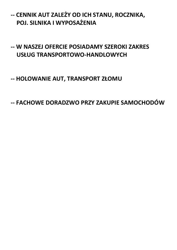 -- CENNIK AUT ZALEŻY OD ICH STANU, ROCZNIKA, POJ. SILNIKA I WYPOSAŻENIA -- W NASZEJ OFERCIE POSIADAMY SZEROKI ZAKRES USŁUG TRANSPORTOWO-HANDLOWYCH -- HOLOWANIE AUT, TRANSPORT ZŁOMU -- FACHOWE DORADZWO PRZY ZAKUPIE SAMOCHODÓW