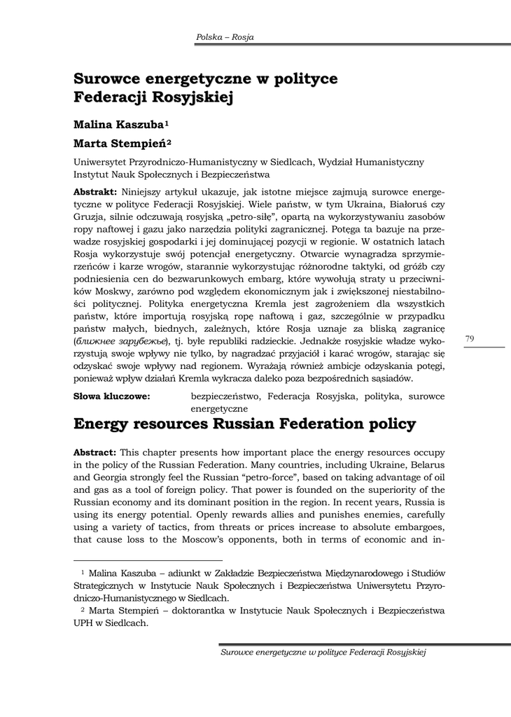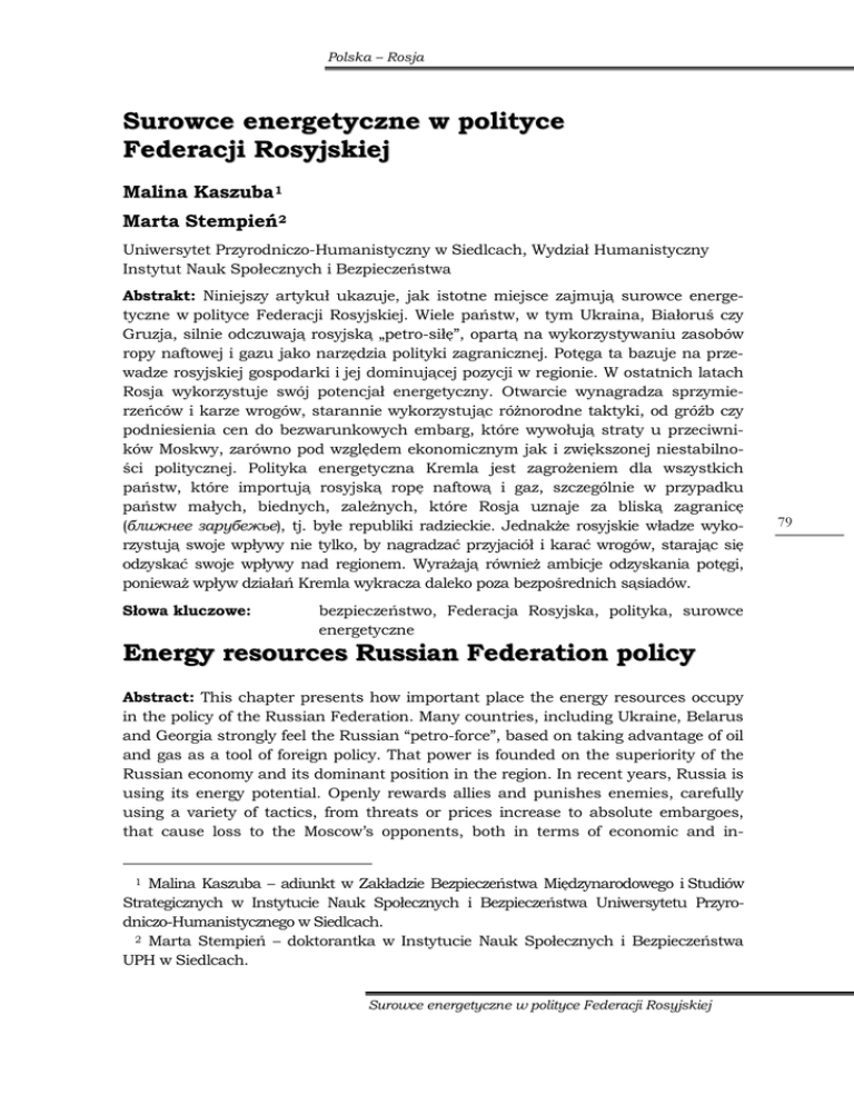 Polska – Rosja Surowce energetyczne w polityce Federacji Rosyjskiej Malina Kaszuba1 Marta Stempień 2 Uniwersytet Przyrodniczo-Humanistyczny w Siedlcach, Wydział Humanistyczny Instytut Nauk Społecznych i Bezpieczeństwa Abstrakt: Niniejszy artykuł ukazuje, jak istotne miejsce zajmują surowce energetyczne w polityce Federacji Rosyjskiej. Wiele państw, w tym Ukraina, Białoruś czy Gruzja, silnie odczuwają rosyjską „petro-siłę”, opartą na wykorzystywaniu zasobów ropy naftowej i gazu jako narzędzia polityki zagranicznej. Potęga ta bazuje na przewadze rosyjskiej gospodarki i jej dominującej pozycji w regionie. W ostatnich latach Rosja wykorzystuje swój potencjał energetyczny. Otwarcie wynagradza sprzymierzeńców i karze wrogów, starannie wykorzystując różnorodne taktyki, od gróźb czy podniesienia cen do bezwarunkowych embarg, które wywołują straty u przeciwników Moskwy, zarówno pod względem ekonomicznym jak i zwiększonej niestabilności politycznej. Polityka energetyczna Kremla jest zagrożeniem dla wszystkich państw, które importują rosyjską ropę naftową i gaz, szczególnie w przypadku państw małych, biednych, zależnych, które Rosja uznaje za bliską zagranicę (ближнее зарубежье), tj. byłe republiki radzieckie. Jednakże rosyjskie władze wykorzystują swoje wpływy nie tylko, by nagradzać przyjaciół i karać wrogów, starając się odzyskać swoje wpływy nad regionem. Wyrażają również ambicje odzyskania potęgi, ponieważ wpływ działań Kremla wykracza daleko poza bezpośrednich sąsiadów. Słowa kluczowe: bezpieczeństwo, Federacja Rosyjska, polityka, surowce energetyczne Energy resources Russian Federation policy Abstract: This chapter presents how important place the energy resources occupy in the policy of the Russian Federation. Many countries, including Ukraine, Belarus and Georgia strongly feel the Russian “petro-force”, based on taking advantage of oil and gas as a tool of foreign policy. That power is founded on the superiority of the Russian economy and its dominant position in the region. In recent years, Russia is using its energy potential. Openly rewards allies and punishes enemies, carefully using a variety of tactics, from threats or prices increase to absolute embargoes, that cause loss to the Moscow’s opponents, both in terms of economic and inMalina Kaszuba – adiunkt w Zakładzie Bezpieczeństwa Międzynarodowego i Studiów Strategicznych w Instytucie Nauk Społecznych i Bezpieczeństwa Uniwersytetu Przyrodniczo-Humanistycznego w Siedlcach. 2 Marta Stempień – doktorantka w Instytucie Nauk Społecznych i Bezpieczeństwa UPH w Siedlcach. 1 Surowce energetyczne w polityce Federacji Rosyjskiej 79 red. naukowa Malina Kaszuba, Mirosław Minkina creased political instability. Kremlin’s energy policy is a threat to all countries that import Russian oil and gas, especially in the case of small, poor, dependent states, which Russia considers to be near abroad (ближнее зарубежье) the former Soviet republics. However, the Russian authorities use their influence not only to reward friends and punish enemies, trying to regain its influence over the region. Also express the ambitions of regaining power, because the impact of the Kremlin goes far beyond the direct neighbors. Keywords: security, Russian Federation, politics, energy resources Wprowadzenie 80 Federacja Rosyjska (FR) powstała w wyniku rozpadu Związku Socjalistycznych Republik Radzieckich (ZSRR) w 1991 r. Pod względem wielkości terytorium (17 075,4 tys. km2) jest największym państwem na świecie. Liczba ludności szacowana na poziomie 143 mln sytuuje ją na piątej pozycji. Już za czasów ZSRR Kreml rozpoczął świadomie starania, aby rosyjskie surowce energetyczne stały się niezbędne w całej Europie Wschodniej i Zachodniej. W latach 70. radzieckie wpływy energetyczne były poważnym problemem dla Zachodu. Zmniejszyły się one przejściowo w latach 80. i 90., z powodu niskich cen ropy naftowej, chyleniu się ZSRR ku upadkowi i prywatyzacji wielu przedsiębiorstw naftowych. Jednak bogactwo w zasoby i rozległą sieć rurociągów zapewniło, że rosyjska „petro-siła” czekała w gotowości, aby się odrodzić3. Rosja, będąc sukcesorką ZSRR, stara się skutecznie odbudowywać swoją mocarstwową pozycję, „choć nie dorównuje mu ani potencjałem, ani możliwościami oddziaływania na środowisko międzynarodowe. Obecnie rola Rosji została zmarginalizowana do mocarstwa regionalnego”4. Rosyjska elita polityczna nie ustaje w wysiłkach zmierzających do ponownego włączenia Rosji do grona państw decydujących o globalnym ładzie międzynarodowym. Daje temu wyraz chociażby w koncepcji polityki zagranicznej, w której podkreślany jest wielkomocarstwowy charakter polityki rosyjskiej. Obecnie Rosja dąży do odzyskania potęgi, również przy pomocy prowadzonej polityki energetycznej. Ropa naftowa i gaz są surowcami, dla których bardzo trudno znaleźć substytuty, co nastręcza problemów państwom importującym, szczególnie tym, które nie poR. Newnham, Oil, carrots, and sticks: Russia’s energy resources as a foreign policy tool, „Journal of Eurasian Studies” 2011, 2, s. 135. 4 A. Czech, Międzynarodowa pozycja Federacji Rosyjskiej w układzie sił gospodarczych i politycznych we współczesnej gospodarce światowej, [w:] T. Sporka (red.), Pozycja wybranych krajów we współczesnej gospodarce światowej. Diagnoza i perspektywy, Katowice 2010, s. 87–88. 3 Malina Kaszuba, Marta Stempień Polska – Rosja. Polityka bezpieczeństwa Federacji Rosyjskiej… siadają zdywersyfikowanych źródeł energii. Dotyczy to również partnerów handlowych Rosji. Za czasów ZSRR celowo tworzono powiązania zarówno z republikami radzieckimi, jak i państwami satelickimi, aby doprowadzić do ich wielostronnego uzależnienia. Wszystkie rurociągi biegły z Rosji, a przemysł i transport byłego bloku sowiec