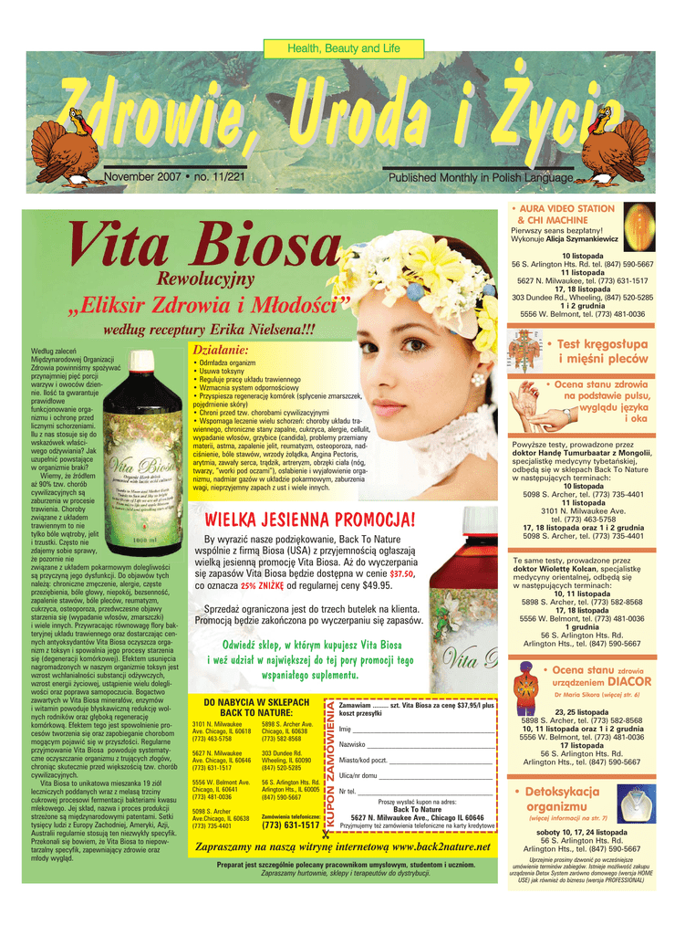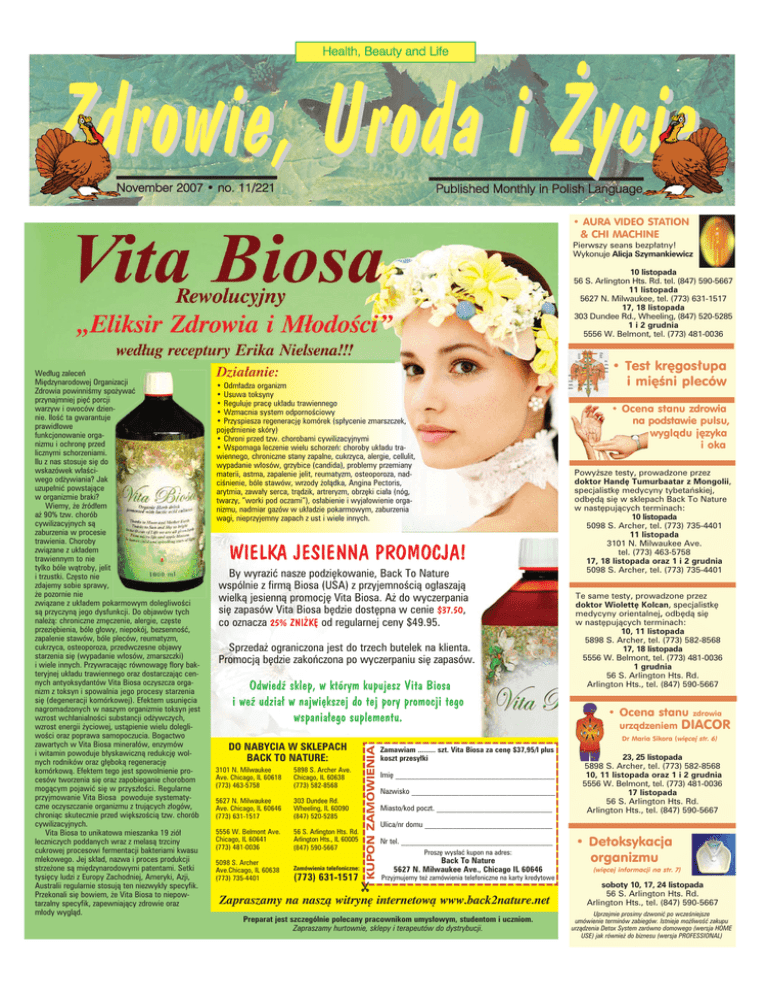 Health, Beauty and Life Zdrowie, Uroda i Życie November 2007 • no. 11/221 Published Monthly in Polish Language • AURA VIDEO STATION & CHI MACHINE Pierwszy seans bezpłatny! Wykonuje Alicja Szymankiewicz 10 listopada 56 S. Arlington Hts. Rd. tel. (847) 590-5667 11 listopada 5627 N. Milwaukee, tel. (773) 631-1517 17, 18 listopada 303 Dundee Rd., Wheeling, (847) 520-5285 1 i 2 grudnia 5556 W. Belmont, tel. (773) 481-0036 • Test kręgosłupa i mięśni pleców Działanie: • Odmładza organizm • Usuwa toksyny • Reguluje pracę układu trawiennego • Wzmacnia system odpornościowy • Przyspiesza regenerację komórek (spłycenie zmarszczek, pojędrnienie skóry) • Chroni przed tzw. chorobami cywilizacyjnymi • Wspomaga leczenie wielu schorzeń: choroby układu trawiennego, chroniczne stany zapalne, cukrzyca, alergie, cellulit, wypadanie włosów, grzybice (candida), problemy przemiany materii, astma, zapalenie jelit, reumatyzm, osteoporoza, nadciśnienie, bóle stawów, wrzody żołądka, Angina Pectoris, arytmia, zawały serca, trądzik, artreryzm, obrzęki ciała (nóg, twarzy, ”worki pod oczami”), osłabienie i wyjałowienie organizmu, nadmiar gazów w układzie pokarmowym, zaburzenia wagi, nieprzyjemny zapach z ust i wiele innych. • Ocena stanu zdrowia na podstawie pulsu, wyglądu języka i oka WIELKA JESIENNA PROMOCJA! By wyrazić nasze podziękowanie, Back To Nature wspólnie z firmą Biosa (USA) z przyjemnością ogłaszają wielką jesienną promocję Vita Biosa. Aż do wyczerpania się zapasów Vita Biosa będzie dostępna w cenie $37.50, co oznacza 25% ZNIŻKĘ od regularnej ceny $49.95. Sprzedaż ograniczona jest do trzech butelek na klienta. Promocją będzie zakończona po wyczerpaniu się zapasów. Odwiedź sklep, w którym kupujesz Vita Biosa i weź udział w największej do tej pory promocji tego wspaniałego suplementu. Powyższe testy, prowadzone przez doktor Handę Tumurbaatar z Mongolii, specjalistkę medycyny tybetańskiej, odbędą się w sklepach Back To Nature w następujących terminach: 10 listopada 5098 S. Archer, tel. (773) 735-4401 11 listopada 3101 N. Milwaukee Ave. tel. (773) 463-5758 17, 18 listopada oraz 1 i 2 grudnia 5098 S. Archer, tel. (773) 735-4401 Te same testy, prowadzone przez doktor Wiolettę Kolcan, specjalistkę medycyny orientalnej, odbędą się w następujących terminach: 10, 11 listopada 5898 S. Archer, tel. (773) 582-8568 17, 18 listopada 5556 W. Belmont, tel. (773) 481-0036 1 grudnia 56 S. Arlington Hts. Rd. Arlington Hts., tel. (847) 590-5667 • Ocena stanu urządzeniem zdrowia DIACOR DO NABYCIA W SKLEPACH BACK TO NATURE: 3101 N. Milwaukee Ave. Chicago, IL 60618 (773) 463-5758 5898 S. Archer Ave. Chicago, IL 60638 (773) 582-8568 5627 N. Milwaukee Ave. Chicago, IL 60646 (773) 631-1517 303 Dundee Rd. Wheeling, IL 60090 (847) 520-5285 5556 W. Belmont Ave. Chicago, IL 60641 (773) 481-0036 56 S. Arlington Hts. Rd. Arlington Hts., IL 60005 (847) 590-5667 5098 S. Archer Ave.Chicago, IL 60638 (773) 735-4401 Zamówienia telefoniczne: (773) 631-1517 KUPON ZAMÓWIENIA Dr Maria Sikora (więcej str. 6) I Według zaleceń Międzynarodowej Organizacji Zdrowia powinniśmy spożywać przynajmniej pięć porcji warzyw i owoców dziennie. Ilość ta gwarantuje prawidłowe funkcjonowanie organizmu i ochronę przed licznymi schorzeniami. Ilu z nas stosuje się do wskazówek właściwego odżywiania? Jak uzupełnić powstające w organizmie braki? Wiemy, że źródłem aż 90% tzw. chorób cywilizacyjnych są zaburzenia w procesie trawienia. Choroby związane z układem trawiennym to nie tylko bóle wątroby, jelit i trzustki. Często nie zdajemy sobie sprawy, że pozornie nie związane z układem pokarmowym dolegliwości są przyczyną jego dysfunkcji. Do objawów tych należą: chroniczne zmęczenie, alergie, częste przeziębienia, bóle głowy, niepokój, bezsenność, zapalenie stawów, bóle pleców, reumatyzm, cukrzyca, osteoporoza, przedwczesne objawy starzenia się (wypadanie włosów, zmarszczki) i wiele innych. Przywracając równowagę flory bakteryjnej układu trawiennego oraz dostarczając cennych antyoksydantów Vita Biosa oczyszcza organizm z toksyn i spowalnia jego procesy starzenia się (degeneracji komórkowej). Efektem usunięcia nagromadzonych w naszym organizmie toksyn jest wzrost wchłanialności substancji odżywczych, wzrost energii życiowej, ustąpienie wielu dolegliwości oraz poprawa samopoczucia. Bogactwo zawartych w Vita Biosa minerałów, enzymów i witamin powoduje błyskawiczną redukcję wolnych rodników oraz głęboką regenerację komórkową. Efektem tego jest spowolnienie procesów tworzenia się oraz zapobieganie chorobom mogącym pojawić się w przyszłości. Regularne przyjmowanie Vita Biosa powoduje systematyczne oczyszczanie organizmu z trujących złogów, chroniąc skutecznie przed większością tzw. chorób cywilizacyjnych. Vita Biosa to unikatowa mieszanka 19 ziół leczniczych poddanych wraz z melasą trzciny cukrowej procesowi fermentacji bakteriami kwasu mlekowego. Jej skład, nazwa i proces produkcji strzeżone są międzynarodowymi patentami. Setki tysięcy ludzi z Europy Zachodniej, Ameryki, Azji, Australii regularnie stosują ten niezwykły specyfik. Przekonali się bowiem, że Vita Biosa to niepowtarzalny specyfik, zapewniający zdrowie oraz młody wygląd. Zamawiam ......... szt. Vita Biosa za cenę $37,95/l plus koszt przesyłki Imię ________________________________________ Nazwisko ____________________________________ Miasto/kod poczt. _____________________________ 23, 25 listopada 5898 S. Archer, tel. (773) 582-8568 10, 11 listopada oraz 1 i 2 grudnia 5556 W. Belmont, tel. (773) 481-0036 17 listopada 56 S. Arlington Hts. Rd. Arlington Hts., tel. (847) 590-5667 Ulica/nr domu ________________________________ Nr tel. ______________________________________ Proszę wysłać kupon na adres: Back To Nature 5627 N. Milwaukee Ave., Chicago IL 60646 • Detoksykacja organizmu (więcej i