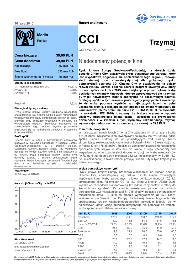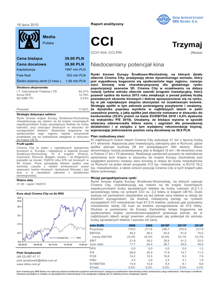 Agora BRE Bank Securities BRE Bank Securities Raport analityczny 16 lipca 2010 Media CCI Polska Trzymaj CCIY.WA; CCI.PW Cena bieŜąca 39,00 PLN Cena docelowa 39,90 PLN Kapitalizacja 1997 mln PLN Free float 352 mln PLN Średni dzienny obrót (3 mies.) 1,56 mln PLN Struktura akcjonariatu I.T. International Theatres LTD Aviva OFE BZ WBK TFI 64,37% 12,78% 5,23% Pozostali 17,62% (Nowa) Niedoceniany potencjał kina Rynki kinowe Europy Środkowo-Wschodniej, na których działa obecnie Cinema City, przeŜywają okres dynamicznego wzrostu, który jest wypadkową bogacenia się społeczeństw tego regionu, rozwoju sieci kinowej oraz charakterystycznej dla globalnego rynku popularyzacji seansów 3D. Cinema City w oczekiwaniu na dalszy rozwój rynków wdraŜa obecnie szeroki program inwestycyjny, który pozwoli spółce do końca 2013 roku zwiększyć o ponad połowę liczbę posiadanych ekranów kinowych i dobrze spozycjonować się na rynku, by w jak największym stopniu skorzystać na oczekiwanym boomie. Strategię spółki w tym zakresie postrzegamy pozytywnie i uwaŜamy, Ŝe dynamika poprawy wyników w najbliŜszych latach w pełni uzasadnia premię, z jaką spółka jest obecnie notowana w stosunku do konkurentów (35,6% premii na bazie EV/EBITDA 2010 i 0,9% dyskonta na wskaźniku P/E 2010). UwaŜamy, Ŝe bieŜąca wycena w sposób właściwy odzwierciedla bilans szans i zagroŜeń dla prowadzonej działalności i w związku z tym wydajemy rekomendację trzymaj, wyznaczając jednocześnie poziom ceny docelowej na 39,9 PLN. Strategia dotycząca sektora Rynki kinowe krajów Europy Środkowo-Wschodniej charakteryzują się niskimi na tle krajów rozwiniętych współczynnikami liczby sprzedanych biletów do liczby ludności, przy znacząco droŜszych w stosunku do wynagrodzeń biletach. Stopniowe bogacenie się społeczeństw tego regionu będzie pozytywnie przekładać się na nadrabianie zaległości w stosunku Plan rozbudowy sieci do krajów UE15. W najbliŜszych trzech latach Cinema City wybuduje 41 kin z łączną liczbą 411 ekranów. Najszerzej plan inwestycyjny zakrojony jest w Rumunii, gdzie Profil spółki Cinema City to jeden z największych operatorów spółka planuje budowę 28 kin posiadających 264 ekrany. Nieco kinowych w Europie i największy w regionie Europy skromniejszy rozwój przewidywany jest w Bułgarii (5 kin i 46 ekranów) oraz Środkowo-Wschodniej. W 6 krajach (Polsce, w Polsce (7 kin i 75 ekranów). Realizacja zamierzeń pozwoli na nadrobienie Czechach, Rumunii, Bułgarii, Izraelu i na Węgrzech) opóźnienia tych krajów w stosunku do krajów Europy Zachodniej pod posiadał na koniec 1Q2010 roku 676 sal kinowych w względem poziomu rozwoju sieci kinowej w relacji do liczby mieszkańców 69 kinach. Poza sprzedaŜą biletów spółka swe (w Rumunii na jeden ekran przypada 312 tys. mieszkańców, w EU15 16,2 dochody czerpie z reklam emitowanych przed tys. mieszkańców), a takŜe umocni pozycję Cinema City w tych krajach jako seansami, barów kinowych, dystrybucji filmowej i płyt dvd, a w niewielkim zakresie z działalności lidera rynkowego. deweloperskiej . WciąŜ perspektywiczne rynki Rynki kinowe krajów Europy Środkowo-Wschodniej, na których operuje Cinema City, charakteryzują się niskimi na tle krajów rozwiniętych współczynnikami liczby sprzedanych biletów do liczby ludności (0,2-1,3 sprzedanego biletu na rynkach CCI vs. 2,2 biletu w krajach UE15). DuŜo wyŜsze od zachodnich standardów są teŜ jednak ceny biletów w relacji do średnich wynagrodzeń. Za średnią miesięczną pensję na rynkach europejskich CCI mieszkaniec kupi 81-215 biletów, podczas gdy przeciętny mieszkaniec starej UE kupi za średnie wynagrodzenie aŜ 472 bilety. WyŜsze w porównaniu do Europy Zachodniej tempo bogacenia się społeczeństw krajów wschodnioeuropejskich powoduje jednak, Ŝe w najbliŜszych latach wciąŜ powinien utrzymywać się potencjał do wzrostu liczby sprzedanych biletów i wzrostu ich ceny. WaŜne daty 31.08 - raport 1H2010 Kurs akcji Cinema City na tle WIG 40.5 PLN 36.3 32.1 27.9 23.7 Cinema City 19.5 09-06-29 09-09-29 09-12-29 Piotr Grzybowski (48 22) 697 47 17 [email protected] www.dibre.com.pl 10-03-29 WIG 10-06-29 (mln EUR) Przychody EBITDA marŜa EBITDA EBIT Zysk netto DPS P/E P/CE P/BV EV/EBITDA DYield 2008 179,0 40,2 22,5% 21,8 17,7 2009 211,6 46,5 22,0% 30,2 24,4 2010P 238,7 54,5 22,8% 35,6 28,7 2011P 270,9 61,6 22,7% 41,2 35,0 2012P 317,9 75,5 23,7% 53,3 45,5 0,0 28,9 14,2 3,3 14,9 0,0% 0,0 20,9 12,5 2,8 12,8 0,0% 0,0 17,9 10,8 2,4 9,4 0,0% 0,0 14,7 9,3 2,1 8,1 0,0% 1,3 11,3 7,6 1,9 6,6 3,4% Dom Inwestycyjny 16 lipca 2010 BRE Banku nie wyklucza złoŜenia emitentowi papierów wartościowych, będących przedmiotem rekomendacji oferty świadczenia usług maklerskich. Informacje o konflikcie interesów powstałym w związku ze sporządzeniem rekomendacji (o ile występuje) znajdują się na ostatniej stronie niniejszego raportu. Cinema City International BRE Bank Securities Charakterystyka Cinema City International Otoczenie rynkowe Profil spółki Cinema City jest piątym co do wielkości w Europie i największym w regionie Europy Środkowo-Wschodniej operatorem kinowym. Swoją działalność prowadzi obecnie na terytorium 6 państw: Polski, Izraela, Czech, Węgier, Bułgarii i Rumunii. Łącznie posiada 69 kin z 676 ekranami kinowymi. Większość swoich przychodów spółka czerpie właśnie z działalności kinowej (w 2009 roku było to 81,5% sprzedaŜy), na którą składa się sprzedaŜ biletów (53,1% przychodów 2009 roku), wpływy reklamowe (11,5% zeszłorocznych przychodów) oraz dochody z działalności gastronomicznej prowadzonej na terenie kin (16,9% obrotów wygenerowanych w ubiegłym roku). Wpływy spółka uzyskuje równieŜ z działalności dystrybucyjnej, która obejmuje dystrybucję kinową (Cinema City ma m.in. wyłączność na dystrybucję filmów Disneya w 5 krajach, w których operuje) oraz dystrybucję kaset wideo i D