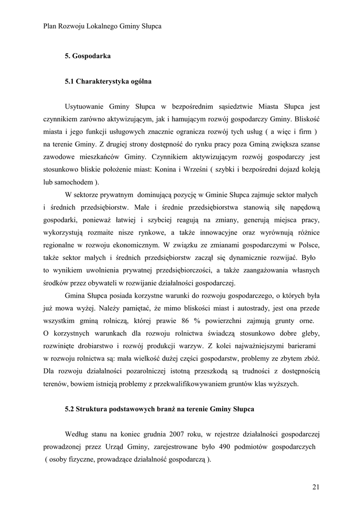 Plan Rozwoju Lokalnego Gminy Słupca 5. Gospodarka 5.1 Charakterystyka ogólna Usytuowanie Gminy Słupca w bezpośrednim sąsiedztwie Miasta Słupca jest czynnikiem zarówno aktywizującym, jak i hamującym rozwój gospodarczy Gminy. Bliskość miasta i jego funkcji usługowych znacznie ogranicza rozwój tych usług ( a więc i firm ) na terenie Gminy. Z drugiej strony dostępność do rynku pracy poza Gminą zwiększa szanse zawodowe mieszkańców Gminy. Czynnikiem aktywizującym rozwój gospodarczy jest stosunkowo bliskie położenie miast: Konina i Wrześni ( szybki i bezpośredni dojazd koleją lub samochodem ). W sektorze prywatnym dominującą pozycję w Gminie Słupca zajmuje sektor małych i średnich przedsiębiorstw. Małe i średnie przedsiębiorstwa stanowią siłę napędową gospodarki, ponieważ łatwiej i szybciej reagują na zmiany, generują miejsca pracy, wykorzystują rozmaite nisze rynkowe, a także innowacyjne oraz wyrównują różnice regionalne w rozwoju ekonomicznym. W związku ze zmianami gospodarczymi w Polsce, także sektor małych i średnich przedsiębiorstw zaczął się dynamicznie rozwijać. Było to wynikiem uwolnienia prywatnej przedsiębiorczości, a także zaangażowania własnych środków przez obywateli w rozwijanie działalności gospodarczej. Gmina Słupca posiada korzystne warunki do rozwoju gospodarczego, o których była już mowa wyżej. Należy pamiętać, że mimo bliskości miast i autostrady, jest ona przede wszystkim gminą rolniczą, której prawie 86 % powierzchni zajmują grunty orne. O korzystnych warunkach dla rozwoju rolnictwa świadczą stosunkowo dobre gleby, rozwinięte drobiarstwo i rozwój produkcji warzyw. Z kolei najważniejszymi barierami w rozwoju rolnictwa są: mała wielkość dużej części gospodarstw, problemy ze zbytem zbóż. Dla rozwoju działalności pozarolniczej istotną przeszkodą są trudności z dostępnością terenów, bowiem istnieją problemy z przekwalifikowywaniem gruntów klas wyższych. 5.2 Struktura podstawowych branż na terenie Gminy Słupca Według stanu na koniec grudnia 2007 roku, w rejestrze działalności gospodarczej prowadzonej przez Urząd Gminy, zarejestrowane było 490 podmiotów gospodarczych ( osoby fizyczne, prowadzące działalność gospodarczą ). 21 Plan Rozwoju Lokalnego Gminy Słupca Głównymi kierunkami działalności gospodarczej w Gminie Słupca są handel, handel detaliczny i naprawy. Uwagę zwraca duży udział podmiotów w dziale budownictwa. W formie graficznej struktura podmiotów gospodarczych przedstawia się następująco: Wykres nr 2 Struktura podmiotów gospodarczych według branż 1% 2% 22% przemysł i wytwórstwo rolnictwo, leśnictwo, rybołóstwo 42% handel, handel detaliczny, naprawy budownictwo 14% transpor, komunikacja inne usługi 19% Największymi zakładami pracy na terenie Gminy Słupca są: 1. Stolarstwo Meblowe, Piotrowice – 3 zakłady, 2. Firma Handlowo – Usługowa – art. Przemysłowe, usługi transportowe, auto – złom, Cienin Zaborny, 3. Spółka „Kartal” – działalność gastronomiczna i hotelarska, Gościniec u Kmiecia, Wilczna, 4. Zakład Produkcji Makaronu „Słowianka”, Wierzbocice, 5. Zakład Przetwórstwa Cebuli VAN DEN DOEL Poland Spółka z o.o., Kowalewo Opactwo, 6. Zakład Przetwórstwa Warzywnego – Kwaszarnia, Młodojewo, 7. Skup ziemiopłodów, Przetwórstwo owocowo – warzywne i spożywcze, Kotunia, 8. Zakład Pokryć Galwanicznych, Bielawy, 9. Spółdzielnia Inwalidów „Przyjaźń” w Słupcy, Stolarnia w Piotrowicach. 5.3. Gospodarka – identyfikacja problemów 22 Plan Rozwoju Lokalnego Gminy Słupca Tabela nr 5 Rozwój gospodarczy – braki i problemy Braki i problemy hamujące rozwój gospodarczy Gminy Słupca 1. Brak dużych inwestorów zewnętrznych i lokalnych MSP, 2. Brak kapitału inwestycyjnego , 3. Brak zachęt dla lokalnych i zewnętrznych inwestorów do rozwijania przedsiębiorczości, 4. Mała integracja i kooperacja wewnętrzna i zewnętrzna MSP, 5. Brak przedsiębiorstw „wysokiej techniki”, 6. Wysokie koszty własne i niska rentowność firm, 7. Niski poziom usług doradczych dla firm, 8. Niski poziom informatyzacji. 9. Wysokie ( ale niewiele rosnące ) bezrobocie, 10. Małe gospodarstwa rolne ( do 5 ha ) – ponad połowa ogólnej liczby, 11. Problemy ze zbytem zbóż, 12. Niska lesistość Gminy 13. Problemy z przekwalifikowywaniem gruntów klas wyższych 6. Sfera społeczna 6.1. Sytuacja demograficzna i społeczna Gminy Słupca Gminę Słupca zamieszkuje 9275 mieszkańców. Ludność zamieszkuje 58 miejscowości w Gminie w ramach 30 sołectw. Największe wsie to Cienin Kościelny, Kotunia, Młodojewo, Wierzbocice, Kąty, Cienin Zaborny – Parcele, Cienin Zaborny . Tabelka nr 6 Wykaz największych miejscowości w Gminie Słupca LP. NAZWA MIEJSCOWOŚCI LICZBA LUDNOŚCI 23 Plan Rozwoju Lokalnego Gminy Słupca 1 2 3 4 5 6 7 8 9 10 Cienin Kościelny Kotunia Młodojewo Wierzbocice Kąty Cienin – Zaborny Parcele Cienin Zaborny Wilczna Rozalin Piotrowice 516 472 477 421 398 423 389 382 380 420 Struktura ludności według wieku produkcyjnego przedstawia się następująco: 1. Przedprodukcyjny ( do 18 lat ) – 2487 2. Produkcyjny (od 18 do 65 lat ) – 5439 3. Poprodukcyjny ( powyżej 65 lat ) – 1248 Wykres nr 3 Wiek przedprodukcyjny, produkcyjny i poprodukcyjny 14% 27% prze dproduk cyjny produk cyjny poproduk cyjny 59% Tabela nr 7 Struktura ludności według grup wiekowych z podziałem na mężczyzn i kobiety 24 Plan Rozwoju Lokalnego Gminy Słupca Grupy wiekowe Ogółem 0–2 3–6 7 – 16 17 – 19 20 – 24 25 – 39 40 – 59 60 – 64 65 – 69 70 – 79 80 i pow. Ogółem Osoby Struktura 9275 100,0 % 293 3,19 456 4,97 1445 15,68 462 4,87 741 7,75 2054 22,17 2247 24,16 267 2,91 347 3,78 710 7,73 253 2,75 Mężczyźni Osoby Struktura 4642 100,0 % 132 2,95 235 5,11 756 16,38 231 4,87 381 7,96 1084 23,36 1179 25,32 124 2,69 156 3,39 285 6,2 79 1,71 Kobiety Osoby Struktura 4633 100,0 % 15