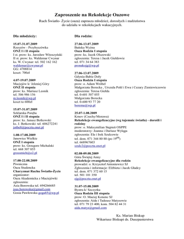 Zaproszenie na Rekolekcje Oazowe Ruch Światło- Życie (oaza) zaprasza młodzież, dorosłych i małżeństwa do udziału w rekolekcjach wakacyjnych. Dla młodzieży: Dla rodzin: 15.07-31.07.2009 Rzeszów - Przybyszówka ONŻ I i II stopnia I st. prow: ks. Jarosław Witoszyński II st. prow: ks. Waldemar Cwynar ks. W. Cwynar: tel. 502 162 162 [email protected] GG: 4708814 koszt: 700zł 27.06-13.07.2009 Bańska Wyżna Oaza Rodzin I stopnia prow: ks. Jacek Olszewski zgłoszenia: Teresa i Jacek Giełdowie tel. 071 34 64 383 [email protected] 4.07-19.07.2009 Maciejów k/ Jeleniej Góry ONŻ II stopnia prow: ks. Mariusz Leonik tel. 506 986 156 [email protected] koszt to 600zł 15.07-31.07.2009 Szklarska Poręba ONŻ I i II stopnia prow: ks. Janusz Betkowski ks. J. Betkowski: tel. 606272241 [email protected] 1.08-17.08.2009 Janowice Wielkie ONŻ I stopnia prow: ks. Grzegorz Michalski tel. 668 307 855 [email protected] 17.08-22.08.2009 Piwniczna Oaza Studencka Charyzmat Ruchu Światło-Życie organizator: Oaza Akademicka z Maciejówki zgłoszenia: Asia Borowska tel. 694266685 [email protected] Gosia Pawłowska [email protected] 27.06-13.07.2009 Gdynia-Babie Doły Oaza Rodzin I stopnia prow: o. Adam Wróbel Małgorzata Borecka , Urszula Pohl i Ewa i Cezary Zieniewiczowie zgłoszenia: Teresa Giełda tel. 0-601 507 055 Małgorzata Borecka tel. 0-600 93 77 20 [email protected] 25.07-1.08.2009 Krnov (Czechy/Morawa) Rekolekcje ewangelizacyjne (wg tajemnic światła) - dorośli i rodziny prow: o. Maksymilian Stępień OSPPE moderatorzy: Joanna i Dariusz Wylęga zgłoszenia: Ela i Irek Szulcowie tel. dom. 071 344 80 88 (po 1900) tel. 668967603 [email protected] 02.08-09.08.2009 Góra Świętej Anny Rekolekcje ewangelizacyjne dla rodzin prowadzi: o. Krzysztof Antoniewicz SJ Zgłoszenia i informacje: Elżbieta i Jacek Gładcy tel. dom. 071 372 60 15 tel. 501 101 350 [email protected] 31.07-15.08.2009 Bystra k/ Szczyrku Oaza Rodzin III stopnia prow: O. Maciej Konenc SJ zgłoszenia: Aida i Tadeusz Matysowie tel. 071 79 23 400, kom. 504 82 44 31 [email protected] Ks. Marian Biskup Wikariusz Biskupi ds. Duszpasterstwa