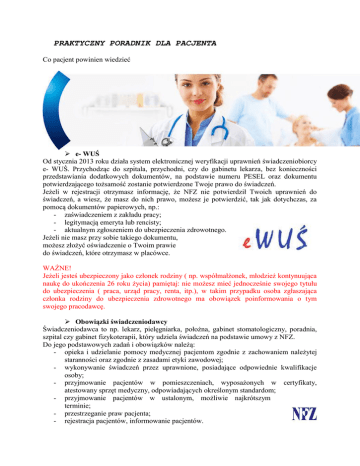 PRAKTYCZNY PORADNIK DLA PACJENTA Co pacjent powinien wiedzieć e- WUŚ Od stycznia 2013 roku działa system elektronicznej weryfikacji uprawnień świadczeniobiorcy e- WUŚ. Przychodząc do szpitala, przychodni, czy do gabinetu lekarza, bez konieczności przedstawiania dodatkowych dokumentów, na podstawie numeru PESEL oraz dokumentu potwierdzającego tożsamość zostanie potwierdzone Twoje prawo do świadczeń. Jeżeli w rejestracji otrzymasz informację, że NFZ nie potwierdził Twoich uprawnień do świadczeń, a wiesz, że masz do nich prawo, możesz je potwierdzić, tak jak dotychczas, za pomocą dokumentów papierowych, np.: - zaświadczeniem z zakładu pracy; - legitymacją emeryta lub rencisty; - aktualnym zgłoszeniem do ubezpieczenia zdrowotnego. Jeżeli nie masz przy sobie takiego dokumentu, możesz złożyć oświadczenie o Twoim prawie do świadczeń, które otrzymasz w placówce. WAŻNE! Jeżeli jesteś ubezpieczony jako członek rodziny ( np. współmałżonek, młodzież kontynuująca naukę do ukończenia 26 roku życia) pamiętaj: nie możesz mieć jednocześnie swojego tytułu do ubezpieczenia ( praca, urząd pracy, renta, itp.), w takim przypadku osoba zgłaszająca członka rodziny do ubezpieczenia zdrowotnego ma obowiązek poinformowania o tym swojego pracodawcę. Obowiązki świadczeniodawcy Świadczeniodawca to np. lekarz, pielęgniarka, położna, gabinet stomatologiczny, poradnia, szpital czy gabinet fizykoterapii, który udziela świadczeń na podstawie umowy z NFZ. Do jego podstawowych zadań i obowiązków należą: - opieka i udzielanie pomocy medycznej pacjentom zgodnie z zachowaniem należytej staranności oraz zgodnie z zasadami etyki zawodowej; - wykonywanie świadczeń przez uprawnione, posiadające odpowiednie kwalifikacje osoby; - przyjmowanie pacjentów w pomieszczeniach, wyposażonych w certyfikaty, atestowany sprzęt medyczny, odpowiadających określonym standardom; - przyjmowanie pacjentów w ustalonym, możliwie najkrótszym terminie; - przestrzeganie praw pacjenta; - rejestracja pacjentów, informowanie pacjentów. WAŻNE! Lekarz udzielający świadczeń w ramach umowy z NFZ nie może w godzinach wykazanych w harmonogramie pracy udzielać świadczeń odpłatnie ( komercyjnie). Rejestracja Punkt rejestracji jest miejscem, w którym dochodzi do pierwszego spotkania pacjenta(świadczeniobiorcy) ze świadczeniodawcą. W punkcie rejestracji, poza możliwością zapisania się do lekarza, pacjent powinien uzyskać kompletną informację dotyczącą: - świadczeń dostępnych w placówce, - czasu oczekiwania, - form i terminów zapisu do lekarza, - wymaganych dokumentów i skierowań potrzebnych do przyjęcia, - wyników badań niezbędnych podczas wizyty, - miejsca wykonania zleconych przez lekarza badań diagnostycznych ( USG, RTG, badań laboratoryjnych lub innych), - zasad udostępniania dokumentacji medycznej, - organizacji pracy przychodni. WAŻNE! Na wizytę u lekarza pacjent ma prawo zapisać się każdego dnia, gdy poradnia jest czynna. Wyznaczanie przez świadczeniodawcę dni do zapisywania się np. raz w miesiącu jest niezgodne z przepisami. Aby zarejestrować się do lekarza pacjent może zgłosić się do rejestracji: - osobiście, - telefonicznie, - za pośrednictwem osoby trzeciej, - jeżeli placówka dysponuje odpowiednim oprogramowaniem, również drogą elektroniczną. WAŻNE! Podczas rejestracji pacjent powinien otrzymać informację o dacie i godzinie wizyty. Przy zapisywaniu zgłaszających się pacjentów pamiętać należy, że: - świadczenia powinny być udzielane w możliwie najkrótszym terminie; - świadczeniodawca jest zobowiązany do przyjęcia pacjenta w ustalonym terminie. Jeżeli wskazany pacjentowi termin wizyty np. W poradni specjalistycznej jest odległy, pacjent powinien uzyskać informację o możliwości skorzystania z porady specjalisty w innych placówkach mających umowę z NFZ. W miarę możliwości należy wskazać adres miejsca, gdzie kolejka do danego specjalisty jest krótsza. Gdy pacjent jest objęty stałym leczeniem specjalistycznym z przyczyny określonej w skierowaniu, termin wizyty kontrolnej powinien zostać ustalony podczas bieżącej wizyty u lekarza. Pozwoli to na zachowanie ciągłości opieki medycznej. Realizacja tej wizyty i kolejnych, odbywa się zawsze na podstawie skierowania, które stanowiło podstawę pierwszorazowej porady specjalistycznej. Dotyczy to wszystkich kolejnych porad specjalistycznych udzielonych pacjentowi z przyczyny wskazanej w skierowaniu, zarówno w danym roku kalendarzowym jak i latach następnych. W przypadku nieobecności lekarza, pacjent powinien zostać poinformowany o sposobie zorganizowania opieki w tym okresie. Informacja taka powinna zostać udostępniona w miejscu udzielania świadczeń oraz w siedzibie świadczeniodawcy. WAŻNE! W razie wystąpienia okoliczności, których nie można było przewidzieć w chwili ustalania terminu udzielenia świadczenia, a które uniemożliwiają jego dotrzymywanie, należy poinformować pacjenta w każdy dostępny sposób( np. telefonicznie lub sms-em) o zmianie tego terminu. Skierowanie Zgłaszając się do wybranego świadczenidawcy pacjent powinien przedstawić- oprócz potwierdzenia prawa do świadczeń- ważne skierowanie. Jest ono dokumentem wymaganym przy dostępie do badań diagnostycznych oraz świadczeń realizowanych w ramach: - ambulatoryjnej opieki specjalistycznej, - leczenia szpitalnego, - leczenia uzdrowiskowego, - rehabilitacji leczniczej, - opieki nad przewlekle chorymi. WAŻNE! Skierowanie nie jest wymagane w stanach nagłego zagrożenia zdrowia lub życia! Skierowaniem do lekarza specjalisty nie jest karta informacyjna z leczenia szpitalnego, izby przyjęć, czy szpitalnego oddziału ratunkowego. Jeżeli w karcie informacyjnej wskazana jest kontynuacja leczenia, skierowanie powinien wystawić lekarz prowadzący leczenie pacjenta w szpitalu. Na podstawie jednego skierowania pacjent może się zarejestrow