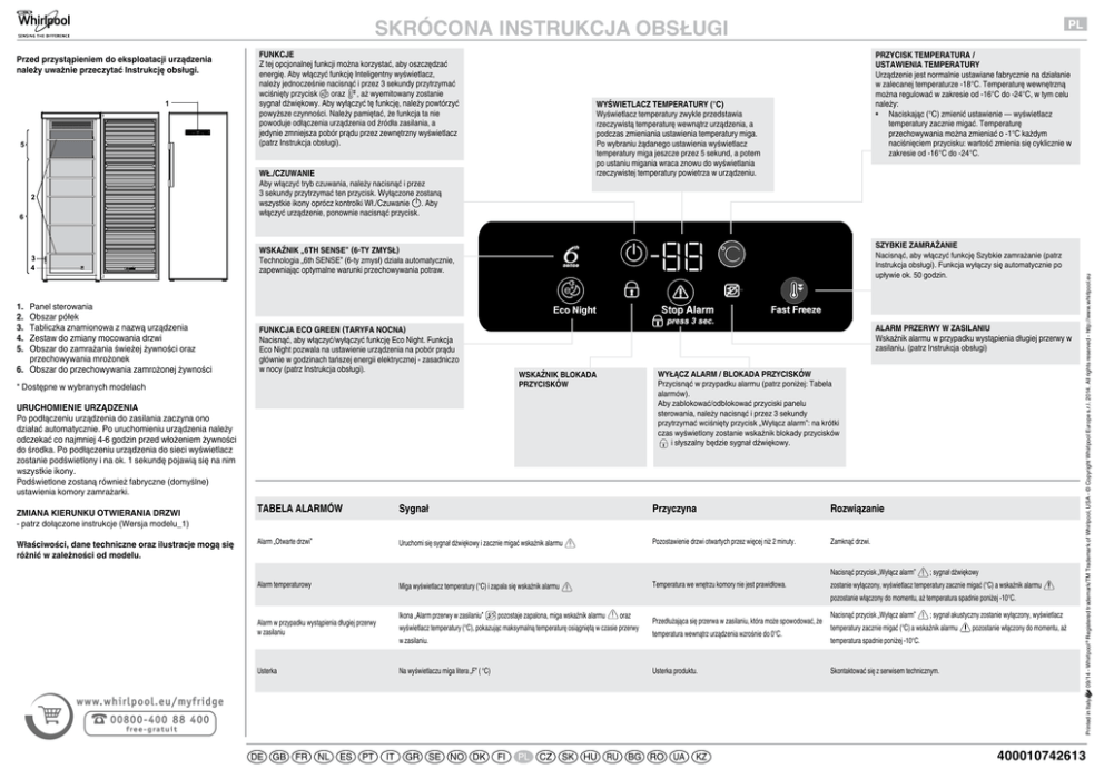 SKRÓCONA INSTRUKCJA OBSŁUGI 6 WŁ./CZUWANIE Aby włączyć tryb czuwania, należy nacisnąć i przez 3 sekundy przytrzymać ten przycisk. Wyłączone zostaną wszystkie ikony oprócz kontrolki Wł./Czuwanie . Aby włączyć urządzenie, ponownie nacisnąć przycisk. 1 2 3 4 Panel sterowania Obszar półek Tabliczka znamionowa z nazwą urządzenia Zestaw do zmiany mocowania drzwi Obszar do zamrażania świeżej żywności oraz przechowywania mrożonek 6. Obszar do przechowywania zamrożonej żywności 1. 2. 3. 4. 5. Wyświetlacz temperatury (°C) Wyświetlacz temperatury zwykle przedstawia rzeczywistą temperaturę wewnątrz urządzenia, a podczas zmieniania ustawienia temperatury miga. Po wybraniu żądanego ustawienia wyświetlacz temperatury miga jeszcze przez 5 sekund, a potem po ustaniu migania wraca znowu do wyświetlania rzeczywistej temperatury powietrza w urządzeniu. SZYBKIE ZAMRAŻANIE Nacisnąć, aby włączyć funkcję Szybkie zamrażanie (patrz Instrukcja obsługi). Funkcja wyłączy się automatycznie po upływie ok. 50 godzin. Wskaźnik „6th SENSE” (6-ty zmysł) Technologia „6th SENSE” (6-ty zmysł) działa automatycznie, zapewniając optymalne warunki przechowywania potraw. ALARM PRZERWY W ZASILANIU Wskaźnik alarmu w przypadku wystąpienia długiej przerwy w zasilaniu. (patrz Instrukcja obsługi) FUNKCJA ECO GREEN (TARYFA NOCNA) Nacisnąć, aby włączyć/wyłączyć funkcję Eco Night. Funkcja Eco Night pozwala na ustawienie urządzenia na pobór prądu głównie w godzinach tańszej energii elektrycznej - zasadniczo w nocy (patrz Instrukcja obsługi). ZMIANA KIERUNKU OTWIERANIA DRZWI - patrz dołączone instrukcje (Wersja modelu_1) Właściwości, dane techniczne oraz ilustracje mogą się różnić w zależności od modelu. WYŁĄCZ ALARM / BLOKADA PRZYCISKÓW Przycisnąć w przypadku alarmu (patrz poniżej: Tabela alarmów). Aby zablokować/odblokować przyciski panelu sterowania, należy nacisnąć i przez 3 sekundy przytrzymać wciśnięty przycisk „Wyłącz alarm”: na krótki czas wyświetlony zostanie wskaźnik blokady przycisków i słyszalny będzie sygnał dźwiękowy. Wskaźnik BLOKADA PRZYCISKÓW * Dostępne w wybranych modelach URUCHOMIENIE URZĄDZENIA Po podłączeniu urządzenia do zasilania zaczyna ono działać automatycznie. Po uruchomieniu urządzenia należy odczekać co najmniej 4-6 godzin przed włożeniem żywności do środka. Po podłączeniu urządzenia do sieci wyświetlacz zostanie podświetlony i na ok. 1 sekundę pojawią się na nim wszystkie ikony. Podświetlone zostaną również fabryczne (domyślne) ustawienia komory zamrażarki. Przycisk TEMPERATURA / USTAWIENIA TEMPERATURY Urządzenie jest normalnie ustawiane fabrycznie na działanie w zalecanej temperaturze -18°C. Temperaturę wewnętrzną można regulować w zakresie od -16°C do -24°C, w tym celu należy: • Naciskając (°C) zmienić ustawienie — wyświetlacz temperatury zacznie migać. Temperaturę przechowywania można zmieniać o -1°C każdym naciśnięciem przycisku: wartość zmienia się cyklicznie w zakresie od -16°C do -24°C. TABELA ALARMÓW Sygnał Przyczyna Rozwiązanie Alarm „Otwarte drzwi” Uruchomi się sygnał dźwiękowy i zacznie migać wskaźnik alarmu Pozostawienie drzwi otwartych przez więcej niż 2 minuty. Zamknąć drzwi. Alarm temperaturowy Miga wyświetlacz temperatury (°C) i zapala się wskaźnik alarmu Temperatura we wnętrzu komory nie jest prawidłowa. Alarm w przypadku wystąpienia długiej przerwy w zasilaniu wyświetlacz temperatury (°C), pokazując maksymalną temperaturę osiągniętą w czasie przerwy Usterka Na wyświetlaczu miga litera „F” ( °C) DE GB FR NL ES PT Ikona „Alarm przerwy w zasilaniu” pozostaje zapalona, miga wskaźnik alarmu oraz w zasilaniu. IT GR SE NO DK Przedłużająca się przerwa w zasilaniu, która może spowodować, że temperatura wewnątrz urządzenia wzrośnie do 0°C. Usterka produktu. FI PL CZ SK HU RU BG RO UA KZ Nacisnąć przycisk „Wyłącz alarm” ; sygnał dźwiękowy zostanie wyłączony, wyświetlacz temperatury zacznie migać (°C) a wskaźnik alarmu pozostanie włączony do momentu, aż temperatura spadnie poniżej -10°C. Nacisnąć przycisk „Wyłącz alarm” ; sygnał akustyczny zostanie wyłączony, wyświetlacz temperatury zacznie migać (°C) a wskaźnik alarmu temperatura spadnie poniżej -10°C. Skontaktować się z serwisem technicznym. pozostanie włączony do momentu, aż Printed in Italy 09/14 - Whirlpool® Registered trademark/TM Trademark of Whirlpool, USA - © Copyright Whirlpool Europe s.r.l. 2014. All rights reserved - http://www.whirlpool.eu 5 Funkcje Z tej opcjonalnej funkcji można korzystać, aby oszczędzać energię. Aby włączyć funkcję Inteligentny wyświetlacz, należy jednocześnie nacisnąć i przez 3 sekundy przytrzymać wciśnięty przycisk oraz , aż wyemitowany zostanie sygnał dźwiękowy. Aby wyłączyć tę funkcję, należy powtórzyć powyższe czynności. Należy pamiętać, że funkcja ta nie powoduje odłączenia urządzenia od źródła zasilania, a jedynie zmniejsza pobór prądu przez zewnętrzny wyświetlacz (patrz Instrukcja obsługi). Przed przystąpieniem do eksploatacji urządzenia należy uważnie przeczytać Instrukcję obsługi. PL 400010742613