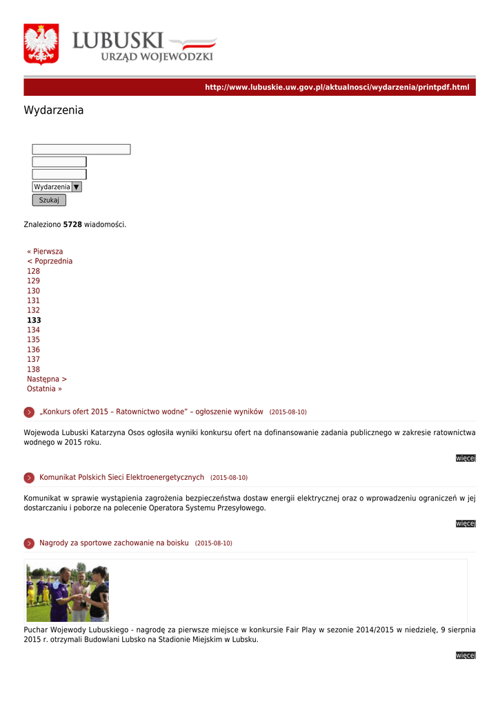 http://www.lubuskie.uw.gov.pl/aktualnosci/wydarzenia/printpdf.html Wydarzenia Wydarzenia ▼ Szukaj Znaleziono 5728 wiadomości. « Pierwsza < Poprzednia 128 129 130 131 132 133 134 135 136 137 138 Następna > Ostatnia » „Konkurs ofert 2015 – Ratownictwo wodne” – ogłoszenie wyników (2015-08-10) Wojewoda Lubuski Katarzyna Osos ogłosiła wyniki konkursu ofert na dofinansowanie zadania publicznego w zakresie ratownictwa wodnego w 2015 roku. więcej Komunikat Polskich Sieci Elektroenergetycznych (2015-08-10) Komunikat w sprawie wystąpienia zagrożenia bezpieczeństwa dostaw energii elektrycznej oraz o wprowadzeniu ograniczeń w jej dostarczaniu i poborze na polecenie Operatora Systemu Przesyłowego. więcej Nagrody za sportowe zachowanie na boisku (2015-08-10) Puchar Wojewody Lubuskiego - nagrodę za pierwsze miejsce w konkursie Fair Play w sezonie 2014/2015 w niedzielę, 9 sierpnia 2015 r. otrzymali Budowlani Lubsko na Stadionie Miejskim w Lubsku. więcej Zakaz kąpieli w jeziorze Głębokie (2015-08-07) Państwowy Powiatowy Inspektor Sanitarny w Międzyrzeczu 7 sierpnia uznał, że woda z kąpieliska Ośrodka Wypoczynkowego Głębokie nie spełnia jakościowych warunków przydatności do kąpieli. więcej W przyszłym roku bezpłatna pomoc prawna (2015-08-07) Od 1 stycznia 2016 r. w całej Polsce powstaną 1524 punkty, w których będzie świadczona bezpłatna pomoc prawna. Sejm przyjął poprawki do ustawy w tej sprawie. więcej Potrzebni nauczyciele (2015-08-07) Można zgłaszać kandydatów na członków Komisji Dyscyplinarnej dla Nauczycieli przy Wojewodzie Lubuskim. W listopadzie upływa kadencja komisji. więcej Wojewoda Lubuski zleciła zadania do realizacji i sprawdza stan działań (2015-08-06) Wojewoda Lubuski Katarzyna Osos, wraz z zespołem powołanym ds. zwalczania inwazji insektów w Dąbrówce Wlkp., na miejscu sprawdziła aktualny stan działań. Ustalono, że w przyszłym tygodniu właściciel składowiska odpadów przedstawi strategię, która po akceptacji będzie realizowana i monitorowana przez zespół. Do 20 sierpnia potrwają kontrole wszystkich wysypisk w regionie. więcej Lubuscy zawodnicy Polskiej Reprezentacji Olimpiad Specjalnych z medalami (2015-08-06) Wojewoda Lubuski Katarzyna Osos gratuluje zawodnikom, którzy z sukcesami wrócili z XIV Światowych Letnich Igrzysk Olimpiad Specjalnych w Los Angeles. więcej Na czas remontu przeprowadzka z Gorzowa Wlkp. do Zielonej Góry (2015-08-06) W związku z trwającymi pracami budowlanymi w budynku LUW w Gorzowie Wlkp. nastąpi zmiana lokalizacji Centrum Powiadamiania Ratunkowego. więcej Trzy dzienne domy opieki Senior-Wigor w Lubuskiem (2015-08-06) Premier RP Ewa Kopacz i Minister Pracy i Polityki Społecznej wręczyli w środę promesy samorządom, które otrzymały dofinansowanie na tworzenie dziennych domów opieki Senior-Wigor. więcej « Pierwsza < Poprzednia 128 129 130 131 132 133 134 135 136 137 138 Następna > Ostatnia »