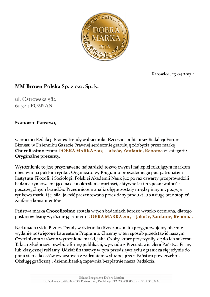 Katowice, 23.04.2013 r. MM Brown Polska Sp. z o.o. Sp. k. ul. Ostrowska 582 61-324 POZNAŃ Szanowni Państwo, w imieniu Redakcji Biznes Trendy w dzienniku Rzeczpospolita oraz Redakcji Forum Biznesu w Dzienniku Gazecie Prawnej serdecznie gratuluję zdobycia przez markę Chocolissimo tytułu DOBRA MARKA 2013 – Jakość, Zaufanie, Renoma w kategorii: Oryginalne prezenty. Wyróżnienie to jest przyznawane najbardziej rozwojowym i najlepiej rokującym markom obecnym na polskim rynku. Organizatorzy Programu prowadzonego pod patronatem Instytutu Filozofii i Socjologii Polskiej Akademii Nauk już po raz czwarty przeprowadzili badania rynkowe mające na celu określenie wartości, aktywności i rozpoznawalności poszczególnych brandów. Przedmiotem analiz objęte zostały między innymi: pozycja rynkowa marki i jej siła, jakość prezentowana przez dany produkt lub usługę oraz stopień zaufania konsumentów. Państwa marka Chocolissimo została w tych badaniach bardzo wysoko oceniona, dlatego postanowiliśmy wyróżnić ją tytułem DOBRA MARKA 2013 – Jakość, Zaufanie, Renoma. Na łamach cyklu Biznes Trendy w dzienniku Rzeczpospolita przygotowujemy obecnie wydanie poświęcone Laureatom Programu. Chcemy w ten sposób przedstawić naszym Czytelnikom zarówno wyróżnione marki, jak i Osoby, które przyczyniły się do ich sukcesu. Taki artykuł może przybrać formę publikacji, wywiadu z Przedstawicielem Państwa Firmy lub klasycznej reklamy. Udział finansowy w tym przedsięwzięciu ogranicza się jedynie do poniesienia kosztów związanych z zadrukiem wybranej przez Państwa powierzchni. Obsługę graficzną i dziennikarską zapewnia bezpłatnie nasza Redakcja. Wszystkie Firmy, które zdecydują się na tego typu prezentację otrzymają dodatkowo, w formie bonusu elektroniczne godło Dobrej Marki 2013, które może być przez Państwa bezpłatnie i bezterminowo wykorzystywane na wszystkich polach komunikacji marketingowej /opakowania, materiały reklamowe, strona internetowa itp./. Godło jest doskonałą formą podkreślenia statusu marki będącej liderem w swojej branży, potwierdza najwyższą jakość produktu lub usługi, a także świadczy o zaufaniu odbiorców i renomie brandu. Pozdrawiam serdecznie i jeszcze raz gratuluję zdobycia tak prestiżowego wyróżnienia, Agnieszka Kluska tel.: 32 200 09 95 fax: 32 350 10 40 tel. kom.: 512 088 968 e-mail: [email protected] Redakcja Biznes Trendy w dzienniku Rzeczpospolita Dodatek do dziennika: Dodatek do dziennika: