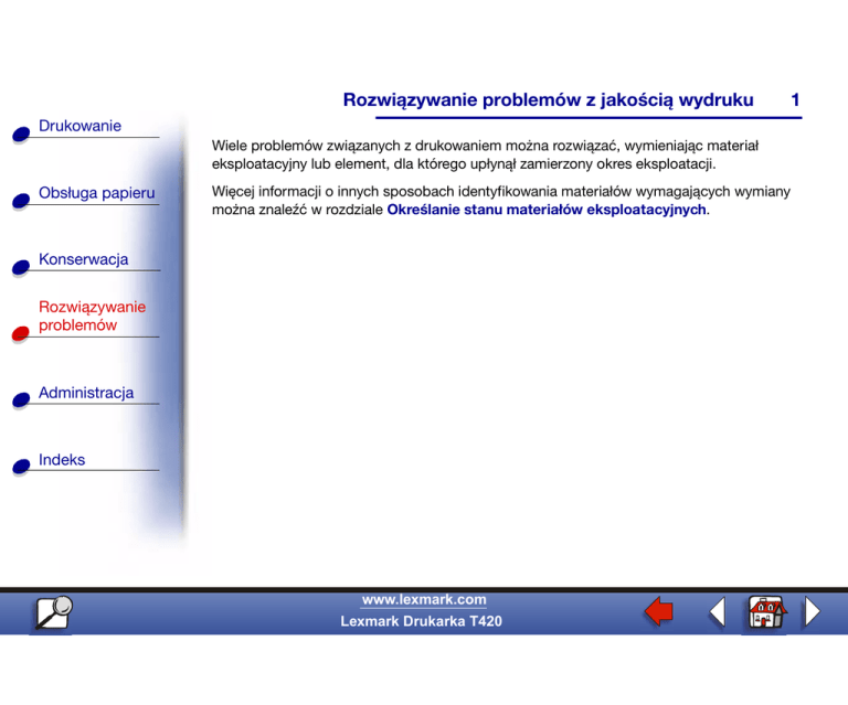 Rozwiązywanie problemów z jakością wydruku Drukowanie Wiele problemów związanych z drukowaniem można rozwiązać, wymieniając materiał eksploatacyjny lub element, dla którego upłynął zamierzony okres eksploatacji. Obsługa papieru Więcej informacji o innych sposobach identyfikowania materiałów wymagających wymiany można znaleźć w rozdziale Określanie stanu materiałów eksploatacyjnych. Konserwacja Rozwiązywanie problemów Administracja Indeks www.lexmark.com Lexmark Drukarka T420 1 Rozwiązywanie problemów z jakością wydruku 2 Drukowanie Tabele poniżej mogą być pomocne w szukaniu rozwiązań problemów związanych z jakością wydruku. Jeśli nie uda się rozwiązać określonego problemu, należy skontaktować się z punktem sprzedaży, w którym zakupiono tę drukarkę. Obsługa papieru Problem Rozwiązanie Znaki są blade lub rozmazane. Konserwacja Rozwiązywanie problemów Administracja Indeks • Jeśli świeci się lampka Mało toneru, należy wyjąć kasetę drukującą. Aby wykorzystać toner w kasecie do końca, należy delikatnie potrząsnąć kasetą, a następnie zainstalować ją z powrotem w drukarce. Sposób potrząsania kasetą drukującą został przedstawiony na ilustracji na str. 6 w rozdziale Wymiana kasety drukującej. • W Narzędziu do konfiguracji drukarki lokalnej należy wybrać dla ustawienia Intensyw. toneru wartość większą niż 8. • W przypadku drukowania na foliach, kartach lub etykietach należy upewnić się, że w sterowniku drukarki lub Narzędziu do konfiguracji drukarki lokalnej został wybrany prawidłowy typ papieru. Uwaga: Dalsze informacje można znaleźć w rozdziale Korzystanie z programu Narzędzie do konfiguracji drukarki lokalnej. • Jeśli powierzchnia papieru użytego do wykonania wydruku jest nierówna, należy odpowiednio dostosować ustawienia Gramatura papieru i Tekstura papieru. • Należy stosować zalecany papier i inne nośniki. Szczegółowe informacje na ten temat można znaleźć w dziale Card Stock & Label Guide - podręcznik w witrynie internetowej firmy Lexmark pod adresem www.lexmark.com. • Drukarka wykryła błąd dotyczący kasety drukującej. Należy wymienić kasetę. • Należy upewnić się, że nośnik ładowany do źródła nośnika nie jest wilgotny. www.lexmark.com Lexmark Drukarka T420 Rozwiązywanie problemów z jakością wydruku 3 Drukowanie Problem Obsługa papieru Konserwacja Rozwiązywanie problemów Rozwiązanie Na wierzchu lub spodzie arkusza występują plamy toneru. • Należy upewnić się, że nośnik jest płaski i niepomarszczony. • Wymień zużytą kasetę drukującą na nową. • Na wałku przenoszącym znajduje się toner. Aby tego uniknąć, nie należy ładować nośnika o rozmiarach mniejszych niż drukowana strona. Należy określić prawidłowy rozmiar arkusza w sterowniku drukarki lub w Narzędziu do konfiguracji drukarki lokalnej. Dalsze informacje można znaleźć w rozdziale Korzystanie z programu Narzędzie do konfiguracji drukarki lokalnej. • Aby oczyścić wałek przenoszący, należy otworzyć, a następnie zamknąć górne przednie drzwiczki drukarki. Drukarka przejdzie automatycznie przez cykl konfiguracyjny. Administracja Indeks www.lexmark.com Lexmark Drukarka T420 Rozwiązywanie problemów z jakością wydruku 4 Drukowanie Problem Obsługa papieru Konserwacja Rozwiązywanie problemów Administracja Indeks Rozwiązanie Toner rozmazuje się lub ściera się z arkusza. • Można spróbować wybrać dla ustawienia Gramatura nośnika większą wartość, a dla ustawienia Tekstura nośnika — większą szorstkość. Aby zmienić te ustawienia, należy użyć Narzędzia do konfiguracji drukarki lokalnej, dostępnego w witrynie internetowej firmy Lexmark pod adresem www.lexmark.com. To narzędzie może również znajdować się na dysku Drivers CD dla danej drukarki. Informacje na ten temat można znaleźć w broszurze Drivers CD. Dalsze informacje można znaleźć w rozdziale Korzystanie z programu Narzędzie do konfiguracji drukarki lokalnej. • Jeśli powierzchnia papieru użytego do wykonania wydruku jest nierówna, należy odpowiednio zmienić ustawienia Tekstura papieru i Gramatura papieru. • Należy sprawdzić, czy nośnik spełnia wymagania określone dla tej drukarki. (Aby uzyskać dalsze informacje na ten temat, patrz Źródła i parametry nośników wydruku). Jeśli problemu nie uda się rozwiązać, można skontaktować się z Centrum obsługi klienta firmy Lexmark pod numerem telefonu 1-859-232-3000 lub adresem http://support.lexmark.com. • W przypadku drukowania na foliach, kartach lub etykietach należy upewnić się, że w sterowniku drukarki lub Narzędziu do konfiguracji drukarki lokalnej został wybrany prawidłowy typ papieru. Dalsze informacje można znaleźć w rozdziale Korzystanie z programu Narzędzie do konfiguracji drukarki lokalnej. • Można spróbować użyć papieru innego rodzaju. Najlepszą jakość wydruku uzyskuje się na papierze przeznaczonym dla kopiarek. www.lexmark.com Lexmark Drukarka T420 Rozwiązywanie problemów z jakością wydruku 5 Drukowanie Problem Obsługa papieru Konserwacja Rozwiązywanie problemów Rozwiązanie Na arkuszu występują pionowe lub poziome smugi. • Toner może się kończyć. Wyjmij kasetę drukującą. Aby wykorzystać toner w kasecie do końca, należy delikatnie potrząsnąć kasetą, a następnie zainstalować ją z powrotem w drukarce. Sposób potrząsania kasetą drukującą został przedstawiony na ilustracji na str. 6 w rozdziale Wymiana kasety drukującej. • W przypadku korzystania z formularzy z nadrukiem należy upewnić się, że farba drukarska jest odporna na temperatury rzędu 200°C. • Należy oczyścić soczewkę głowicy drukującej. Aby uzyskać instrukcje, zobacz rozdział Czyszczenie soczewki głowicy drukującej. Administracja Indeks www.lexmark.com Lexmark Drukarka T420 Rozwiązywanie problemów z jakością wydruku Drukowanie Obsługa papie