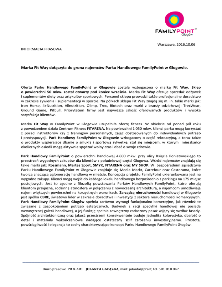 Warszawa, 2016.10.06 INFORMACJA PRASOWA Marka Fit Way dołączyła do grona najemców Parku Handlowego FamilyPoint w Głogowie. Oferta Parku Handlowego FamilyPoint w Głogowie została wzbogacona o markę Fit Way. Sklep o powierzchni 50 mkw. został otwarty pod koniec września. Marka Fit Way oferuje sprzedaż odżywek i suplementów diety oraz artykułów sportowych. Personel sklepu prowadzi także profesjonalne doradztwo w zakresie żywienia i suplementacji w sporcie. Na półkach sklepu Fit Way znajdą się m. in. takie marki jak: Iron Horse, 4+Nutrition, Allnutrition, Olimp, Trec, Biotech oraz marki z branży odzieżowej: TrecWear, Ground Game, Pitbull. Priorytetem firmy jest najwyższa jakość oferowanych produktów i wysoka satysfakcja klientów. Marka Fit Way w FamilyPoint w Głogowie uzupełniła ofertę fitness. W obiekcie od ponad pół roku z powodzeniem działa Centrum Fitness FITARENA. Na powierzchni 1 050 mkw. klienci parku mogą korzystać z porad instruktorów czy z treningów personalnych, zajęć dostosowanych do indywidualnych potrzeb i predyspozycji. Park Handlowy FamilyPoint w Głogowie wzbogacony o część rekreacyjną, a teraz także o produkty wspierające dbanie o smukłą i sportową sylwetkę, stał się miejscem, w którym mieszkańcy okolicznych osiedli mogą aktywnie spędzać wolny czas i dbać o swoje zdrowie. Park Handlowy FamilyPoint o powierzchni handlowej 4 600 mkw. przy ulicy Księcia Poniatowskiego to przestrzeń wygodnych zakupów dla klientów z południowej części Głogowa. Wśród najemców znajdują się takie marki jak: Rossmann, Martes Sport, SMYK, FITARENA oraz MY SHOP. W bezpośrednim sąsiedztwie Parku Handlowego FamilyPoint w Głogowie znajduje się Media Markt, Carrefour oraz Castorama, które tworzą znaczącą aglomerację handlową w mieście. Koncepcja projektu FamilyPoint ukierunkowana jest na wygodne zakupy. Klienci mogą wejść do każdego lokalu handlowego bezpośrednio z parkingu na 175 miejsc postojowych. Jest to zgodne z filozofią powstawania Parków Handlowych FamilyPoint, które oferują klientom przyjazną, rodzinną atmosferę w połączeniu z nowoczesną architekturą, a najemcom umożliwiają najem większych powierzchni na korzystnych warunkach. Zarządcą nieruchomości handlowej w Głogowie jest spółka CBRE, światowy lider w zakresie doradztwa i inwestycji z sektora nieruchomości komercyjnych. Park Handlowy FamilyPoint Głogów spełnia zarówno wymogi funkcjonalno-komercyjne, jak również te związane z zaspokojeniem potrzeb estetycznych. Budynek z racji specyfiki handlowej nie posiada wewnętrznej galerii handlowej, a jej funkcję spełnia zewnętrzny zadaszony pasaż wijący się wzdłuż fasady. Spójność architektoniczną oraz jakość przestrzeni konsekwentnie buduje jednolita kolorystyka, dbałość o detal i materiały wykończeniowe nadające ostateczny szlif założeniu inwestycyjnemu. Prostota, powściągliwość i elegancja to cechy charakteryzujące koncept Parku Handlowego FamilyPoint Głogów. _______________________________________________________________________________________________________________________ Biuro prasowe PR & ART JOLANTA GAŁĄZKA, mail: jolanta@prart, tel. 501 018 847