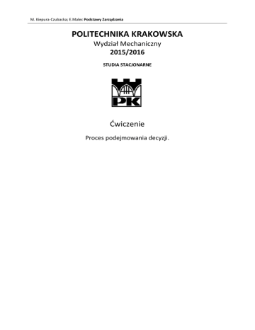 M. Kiepura-Czubacka; E.Malec Podstawy Zarządzania POLITECHNIKA KRAKOWSKA Wydział Mechaniczny 2015/2016 STUDIA STACJONARNE Ćwiczenie Proces podejmowania decyzji. M. Kiepura-Czubacka; E.Malec Podstawy Zarządzania Ćwiczenie: Proces podejmowania decyzji. Pytania wprowadzające: 1. 2. 3. 4. 5. 6. Jaka jest istota podejmowania decyzji? Wymień typy decyzji; Wymień warunki podejmowania decyzji; Omów racjonalne spojrzenie na podejmowanie decyzji; Wymień i omów etapy podejmowania decyzji; Omów behawioralny charakter podejmowania decyzji; Zadania do wykonania : 1. Zdefiniuj 2 sytuacje decyzyjne w Twojej firmie. 2. Dla każdej z nich rozpisz etapy wg racjonalnego podejścia do podejmowania decyzji. 3. Oceń warianty wg poznanych kryteriów. Literatura: 1. Griffin R.W. „Podstawy zarządzania organizacjami” PWN Warszawa 2. Koźmiński A., Piotrowski W. „Zarządzanie teoria i praktyka” PWN Warszawa M. Kiepura-Czubacka; E.Malec Podstawy Zarządzania PRZYKŁADY I WSKAZÓWKI PODEJMOWANIE DECYZJI - akt wyboru jednej możliwości spośród ich zestawu PROCES PODEJMOWANIA DECYZJI- rozpoznanie i zdefiniowanie istoty sytuacji decyzyjnej, zidentyfikowanie alternatywnych możliwości, wybór najlepszej z nich i wprowadzenie jej w życie Słowo najlepsza sugeruje skuteczność, skuteczna decyzja to ta, która optymalizuje np. zyski, sprzedaż, dobrobyt pracowników, udział w rynku, lub też minimalizuje np. straty, koszty, fluktuację personelu; może to dotyczyć najlepszej metody wycofania się z rynku, zwolnienia pracowników lub wypowiedzenia umowy. TYPY DECYZJI: zaprogramowane: decyzje mające kompletną strukturę lub powtarzające się z pewną częstotliwością (albo jedno i drugie); np. menedżer wie, że musi utrzymać 30-dniowy zapas danego produktu, inny menedżer zobowiązał się do dorocznego sponsorowania drużyny piłkarskiej; niezaprogramowane: decyzje o niezbyt wyraźnej strukturze, podejmowane znacznie rzadziej niż decyzje zaprogramowane; np.. decyzja o budowie nowego zakładu, o wymianie między przedsiębiorstwami określonych jednostek produkcyjnych, dotyczące nowych produktów, umów zbiorowych i problemów prawnych; wymagają wiele czasu, energii, zasobów, oparte są o intuicję i doświadczenie. WARUNKI PODEJMOWANIA DECYZJI: podejmowanie decyzji w warunkach pewności: sytuacja, w której podejmujący decyzję zna z rozsądnym zakresem pewności dostępne warianty wyboru oraz ich warunki; np. decyzja o wyborze dostawcy; w rzeczywistości występują niezmiernie rzadko; podejmowanie decyzji w warunkach ryzyka: sytuacja, w której dostępność poszczególnych możliwości i związane z każdą z nich potencjalne korzyści i koszty są znane z pewnym szacunkowym prawdopodobieństwem; np. żądania związku zawodowego grożącego strajkiem: decyzja musi być podjęta na podstawie doświadczeń z przeszłości, bieżących informacji, opinii innych i własnej intuicji; wymaga to trafnego określenia prawdopodobieństwa; podejmowanie decyzji w warunkach niepewności: sytuacja, w której podejmujący decyzję nie zna wszystkich możliwości wyboru, ryzyka związanego z każdą z nich, ani ich możliwych konsekwencji; aby podejmować możliwie skuteczne decyzje menedżerowie muszą pozyskać możliwie dużo informacji i podchodzić do sprawy w sposób logiczny i racjonalny; ważną rolę odgrywa intuicja, trafność osądu oraz doświadczenie; RACJONALNE SPOJRZENIE NA PODEJMOWANIE DECYZJI KLASYCZNY MODEL PODEJMOWANIA DECYZJI: Normatywne podejście do podejmowania decyzji, określające sposób, w jaki menedżerowie powinni podejmować decyzje; zakłada on logiczną i racjonalną naturę menedżerów oraz przyjmuje, że ich decyzje najlepiej służą interesom organizacji. Klasyczny model podejmowania decyzji zakłada: 1. podejmujący decyzje mają pełną informację o sytuacji decyzyjnej i możliwych wariantach; 2. są w stanie skutecznie usunąć niepewność, by podjąć decyzję w warunkach pewności; 3. umieją racjonalnie i logicznie oceniać wszelkie aspekty sytuacji decyzyjnej; Wobec sytuacji wymagającej decyzji menedżer powinien ... uzyskać pełną i doskonałą informację; wyeliminować niepewność; ocenić wszystko racjonalnie i logicznie; ... i podjąć w końcu decyzję najlepiej służącą interesom organizacji M. Kiepura-Czubacka; E.Malec Podstawy Zarządzania ETAPY RACJONALEGO PODEJMOWANIA DECYZJI KROK 1. Rozeznanie i zdefiniowanie sytuacji decyzyjnej; 2. Identyfikacja alternatywnych możliwości; 3. Ocena wariantów; SZCZEGÓŁY Jakiś bodziec wskazuje na konieczność podjęcia decyzji. Bodziec ten może być pozytywny lub negatywny. Pożądane są zarówno możliwości oczywiste, jak i twórcze. Ogólnie rzecz biorąc, im ważniejsza decyzja, tym więcej wariantów należy podać. Każdy wariant podlega ocenie z punktu widzenia wykonalności, wystarczalności i następstw. 4. Wybór najlepszego wariantu; Po dokonaniu oceny wszystkich wariantów należy wybrać ten, który najlepiej pasuje do sytuacji. 5. Wdrożenie wybranego wariantu; Wybrany wariant zostaje wdrożony w systemie organizacji. 6. Obserwacja wyników i ocena; Menedżer powinien ocenić zakres, w jakim wariant wybrany w kroku 4 i wdrożony w kroku 5 sprawdza się w praktyce. PRZYKŁAD Kierownik zakładu zauważa 5% wzrost fluktuacji załogi. Kierownik zakładu może zwiększyć płace, premie lub zmienić normy rekrutacji. Może się okazać, że wzrost premii jest niemożliwy. Wzrost płac i zmiana norm rekrutacji mogą spełnić wszystkie warunki. Zmiana norm rekrutacji może dopiero po dłuższym czasie wpłynąć na zmniejszenie fluktuacji, trzeba więc podnieść płace. Kierownik zakładu może potrzebować zezwolenia centrali firmy. Dział kadr ustala nową strukturę płac. Kierownik zakładu zauważa, że po sześciu miesiącach nastąpił spadek fluktuacji załogi do poprzedniego poziomu. OCENA ALTERNATYWNYCH WARIANTÓW W PROCESIE PODEJMOWANIA DECYZJI Czy jest wykonalny? NIE
