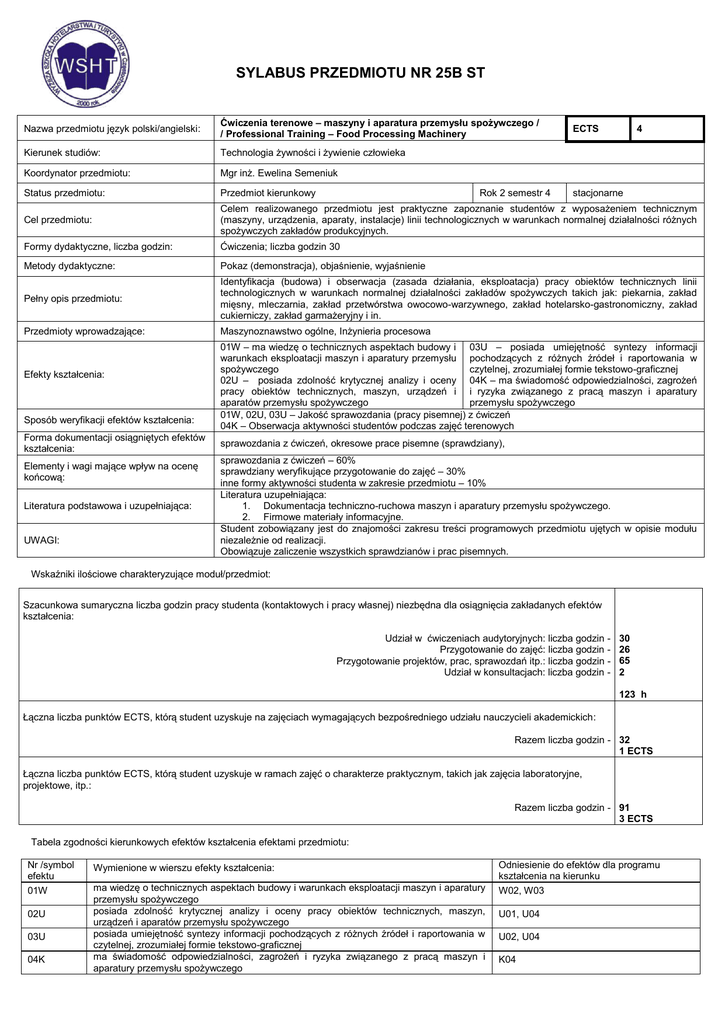 SYLABUS PRZEDMIOTU NR 25B ST Nazwa przedmiotu język polski/angielski: Ćwiczenia terenowe – maszyny i aparatura przemysłu spożywczego / / Professional Training – Food Processing Machinery Kierunek studiów: Technologia żywności i żywienie człowieka Koordynator przedmiotu: Mgr inż. Ewelina Semeniuk Status przedmiotu: Przedmiot kierunkowy Cel przedmiotu: Celem realizowanego przedmiotu jest praktyczne zapoznanie studentów z wyposażeniem technicznym (maszyny, urządzenia, aparaty, instalacje) linii technologicznych w warunkach normalnej działalności różnych spożywczych zakładów produkcyjnych. Formy dydaktyczne, liczba godzin: Ćwiczenia; liczba godzin 30 Metody dydaktyczne: Pokaz (demonstracja), objaśnienie, wyjaśnienie Pełny opis przedmiotu: Identyfikacja (budowa) i obserwacja (zasada działania, eksploatacja) pracy obiektów technicznych linii technologicznych w warunkach normalnej działalności zakładów spożywczych takich jak: piekarnia, zakład mięsny, mleczarnia, zakład przetwórstwa owocowo-warzywnego, zakład hotelarsko-gastronomiczny, zakład cukierniczy, zakład garmażeryjny i in. Przedmioty wprowadzające: Maszynoznawstwo ogólne, Inżynieria procesowa Efekty kształcenia: Sposób weryfikacji efektów kształcenia: Forma dokumentacji osiągniętych efektów kształcenia: Elementy i wagi mające wpływ na ocenę końcową: Literatura podstawowa i uzupełniająca: UWAGI: Rok 2 semestr 4 ECTS 4 stacjonarne 01W – ma wiedzę o technicznych aspektach budowy i 03U – posiada umiejętność syntezy informacji warunkach eksploatacji maszyn i aparatury przemysłu pochodzących z różnych źródeł i raportowania w spożywczego czytelnej, zrozumiałej formie tekstowo-graficznej 02U – posiada zdolność krytycznej analizy i oceny 04K – ma świadomość odpowiedzialności, zagrożeń pracy obiektów technicznych, maszyn, urządzeń i i ryzyka związanego z pracą maszyn i aparatury aparatów przemysłu spożywczego przemysłu spożywczego 01W, 02U, 03U – Jakość sprawozdania (pracy pisemnej) z ćwiczeń 04K – Obserwacja aktywności studentów podczas zajęć terenowych sprawozdania z ćwiczeń, okresowe prace pisemne (sprawdziany), sprawozdania z ćwiczeń – 60% sprawdziany weryfikujące przygotowanie do zajęć – 30% inne formy aktywności studenta w zakresie przedmiotu – 10% Literatura uzupełniająca: 1. Dokumentacja techniczno-ruchowa maszyn i aparatury przemysłu spożywczego. 2. Firmowe materiały informacyjne. Student zobowiązany jest do znajomości zakresu treści programowych przedmiotu ujętych w opisie modułu niezależnie od realizacji. Obowiązuje zaliczenie wszystkich sprawdzianów i prac pisemnych. Wskaźniki ilościowe charakteryzujące moduł/przedmiot: Szacunkowa sumaryczna liczba godzin pracy studenta (kontaktowych i pracy własnej) niezbędna dla osiągnięcia zakładanych efektów kształcenia: Udział w ćwiczeniach audytoryjnych: liczba godzin Przygotowanie do zajęć: liczba godzin Przygotowanie projektów, prac, sprawozdań itp.: liczba godzin Udział w konsultacjach: liczba godzin - 30 26 65 2 123 h Łączna liczba punktów ECTS, którą student uzyskuje na zajęciach wymagających bezpośredniego udziału nauczycieli akademickich: Razem liczba godzin - 32 1 ECTS Łączna liczba punktów ECTS, którą student uzyskuje w ramach zajęć o charakterze praktycznym, takich jak zajęcia laboratoryjne, projektowe, itp.: Razem liczba godzin - 91 3 ECTS Tabela zgodności kierunkowych efektów kształcenia efektami przedmiotu: Nr /symbol efektu 01W 02U 03U 04K Wymienione w wierszu efekty kształcenia: ma wiedzę o technicznych aspektach budowy i warunkach eksploatacji maszyn i aparatury przemysłu spożywczego posiada zdolność krytycznej analizy i oceny pracy obiektów technicznych, maszyn, urządzeń i aparatów przemysłu spożywczego posiada umiejętność syntezy informacji pochodzących z różnych źródeł i raportowania w czytelnej, zrozumiałej formie tekstowo-graficznej ma świadomość odpowiedzialności, zagrożeń i ryzyka związanego z pracą maszyn i aparatury przemysłu spożywczego Odniesienie do efektów dla programu kształcenia na kierunku W02, W03 U01, U04 U02, U04 K04