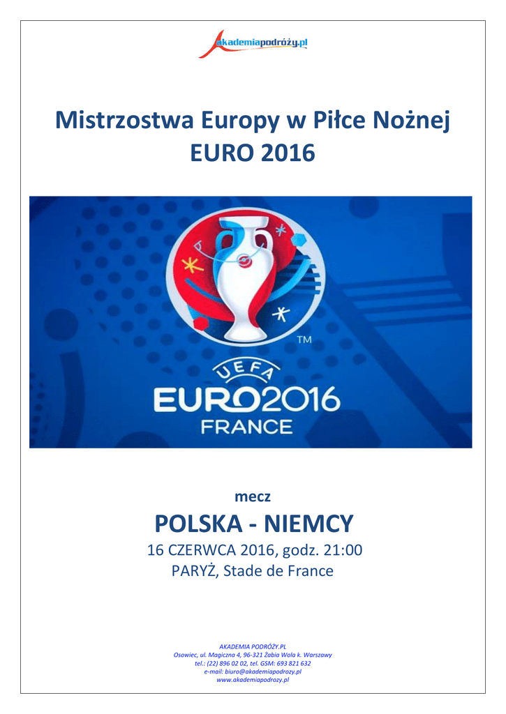 Mistrzostwa Europy w Piłce Nożnej EURO 2016 mecz POLSKA - NIEMCY 16 CZERWCA 2016, godz. 21:00 PARYŻ, Stade de France AKADEMIA PODRÓŻY.PL Osowiec, ul. Magiczna 4, 96-321 Żabia Wola k. Warszawy tel.: (22) 896 02 02, tel. GSM: 693 821 632 e-mail: [email protected] www.akademiapodrozy.pl PAKIET BRĄZOWY w cenie 395,00 EURO netto zawiera: bilet na mecz 3 kategorii ubezpieczenie VIP na cały pobyt pakiet Kibica Reprezentacji Polski (kolekcjonerski szalik, chorągiewka, przewodnik turystyczny) PAKIET SREBRNY w cenie 795,00 EURO netto zawiera: bilet na mecz 3 kategorii ubezpieczenie VIP na cały pobyt pakiet Kibica Reprezentacji Polski (kolekcjonerski szalik, chorągiewka, przewodnik turystyczny) 2 noclegi ze śniadaniami w hotelu kategorii 4* w pokoju 2 osobowym PAKIET ZŁOTY w cenie 1 195,00 EURO netto zawiera: bilet na mecz 3 kategorii ubezpieczenie VIP na cały pobyt pakiet Kibica Reprezentacji Polski (kolekcjonerski szalik, chorągiewka, przewodnik turystyczny) 2 noclegi ze śniadaniami w hotelu kategorii 4* w pokoju 2 osobowym bilet lotniczy z dowolnego lotniska w Polsce do Paryża AKADEMIA PODRÓŻY.PL Osowiec, ul. Magiczna 4, 96-321 Żabia Wola k. Warszawy tel.: (22) 896 02 02, tel. GSM: 693 821 632 e-mail: [email protected] www.akademiapodrozy.pl