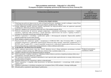 Opis przedmiotu zamówienia – Załącznik Nr 1 (P4) SIWZ Wymagania szczegółowe motopompy pożarniczej dla Państwowej Straży Pożarnej (P4) 1 L.P 2 WYMAGANIA ZAMAWIAJĄCEGO 3 UWAGI ZAMAWIAJACEGO dot. określenia sposobu spełniania wymagań wskazanych w kolumnie 2 I. WYMAGANIA PODSTAWOWE 1.1 Homologowane podwozie dopuszczone do ruchu na drogach publicznych. Spełniający warunki wynikające z ustawy Prawo o ruchu drogowym pozwalające na poruszanie się po drogach z prędkością min. 70km./h. 1.2 Zmiany adaptacyjne pojazdu, dotyczące montażu wyposażenia, nie mogą powodować utraty ani ograniczać uprawnień wynikających z fabrycznej gwarancji mechanicznej. 1.3 Podwozie i zabudowa oraz wyposażenie fabrycznie nowe. Rok produkcji pojazdu 2015r. 1.4 Podwozie przystosowane do przewozu agregatu pompowego i wyposażenia pożarniczego wyposażona w hamulec najazdowy, regulowane kółko pomocnicze z przodu ułatwiające manewrowanie oraz dyszel z regulacją wysokości z zaczepem do samochodu pożarniczego średniego lub ciężkiego 1.5 Podwozie wyposażone w oświetlenie i oznakowanie zgodne z obowiązującymi przepisami. Dopuszczalna prędkość agregatu pompowego na przyczepie 80 km/h. 1.6 Kolor zabudowy pojazdu czerwony RAL 3000. 1.7 Pojazd powinien być oznakowany zgodnie z zarządzeniem nr 8/2008 KG PSP z dnia 10 kwietnia 2008 r. w sprawie gospodarki transportowej w jednostkach organizacyjnych Państwowej Straży Pożarnej, zmienionym zarządzeniem nr 13 KG PSP z dnia 27 grudnia 2012 r. w sprawie gospodarki transportowej w jednostkach organizacyjnych Państwowej Straży Pożarnej Dane dotyczące oznakowania zostaną przekazane w trakcie realizacji zamówienia. II. PARAMETRY TECHNICZNO-UŻYTKOWE 2.1 Silnik z zapłonem samoczynnym o mocy min. 150 kW, chłodzony cieczą w obiegu zamkniętym, gwarantujący uzyskanie Wydajność potwierdzona certyfikatem CNBOP wymaganej wydajności pompy min. 8000 l/min przy ciśnieniu 8 bar i wysokości ssania 1,5 m. 2.2 Chłodnica zabezpieczona przed zabrudzeniem podczas transportu. 2.3 Silnik wyposażony w kolektor wydechowy z tłumikiem, kolektor dolotowy powietrza, kompletną instalację elektryczną z akumulatorem, rozrusznik elektryczny, alternator. 2.4 Moc alternatora samochodu i pojemność akumulatorów musi zapewnić pełne zapotrzebowanie na energię elektryczną przy jej maksymalnym obciążeniu. 2.5 Instalacja elektryczna 24V wyposażona w główny wyłącznik prądu. 2.6 Pojazd wyposażony w integralny układ prostowniczy do ładowania akumulatorów z zewnętrznego źródła zasilania o napięciu 230 V. 2.7 Zabudowa wyposażona w oświetlenie zewnętrzne oraz wewnętrzne (listwy LED) zasilanie z własnego źródła prądu. 2.8 Zbiornik paliwa o pojemności zapewniającej 6 godzin pracy. Strona 1 z 3 Opis przedmiotu zamówienia – Załącznik Nr 1 (P4) SIWZ Wymagania szczegółowe motopompy pożarniczej dla Państwowej Straży Pożarnej (P4) 2.9 Układ elektrycznego podgrzewania płynu chłodniczego podczas garażowania. 2.10 Pulpit sterowniczy obejmujący panel sterowania silnikiem (przyciskiem awaryjnego wyłączenia silnika) i pracą pompy z manometrem ciśnienia środka gaśniczego na kolektorze, manowakuometr, panel sterowania dozownikiem środka pianotwórczego. 2.11 Pompa połączona bezprzekładniowo z silnikiem za pomocą sprzęgła wyposażona w urządzenie odpowietrzające. 2.12 Zawory umożliwiające łatwe całkowite odwodnienie korpusu pompy, kolektora tłocznego i ssawnego. 2.13 Kolektor ssawny min 2 nasady Storz (150 lub 110) z pokrywami. Podać ilość nasad 110 i nasad 75 2.14 Kolektor tłoczny min. 6 nasad (110 i 75) Storz z zaworami i pokrywami. 2.15 Nasada 52 Storz do zasysania środka pianotwórczego. Wąż o dł. min. 3m do zasysania środka pianotwórczego obustronnie z nasadami 52 Storz. 2.16 Dozownik środka pianotwórczego automatycznie dopasowujący ilość dozowanego środka do ilości przepływającej wody umożliwiający dozowanie środka pianotwórczego w zakresie: 1 %-9,9% z płynną regulacją umożliwiający ręczne sterowanie dozowaniem środka pianotwórczego w przypadku awarii sterowania automatycznego. 2.17 Odczyt: aktualnego, procentowego ustawienia dozownika, aktualnego pomiaru przepływającej wody w l/min, całkowitej ilości podanej wody, całkowitej ilości zużytego środka pianotwórczego 2.18 Konstrukcja zabudowy wykonana z materiałów odpornych na działanie czynników atmosferycznych. 2.19 Ze względu na działanie motopompy na terenie Terminala LNG z bezpośrednim dostępem do Morza Bałtyckiego elementy Należy podać dokładny opis zastosowanych rozwiązań i układu wodno-pianowego powinny być odporne na działanie wody morskiej. zastosowanych materiałów III. Schowki na wyposażenie pożarnicze i wszystkie przedziały zamykane (jeden klucz pasujący do wszystkich) żaluzjami w sposób chroniący je przed działaniem czynników atmosferycznych. 2.18 WYPOSAŻENIE 2.19 Wąż ssawny 110 lub 150 (w zależności od nasad ssawnych) z łącznikami Storz, dł. 2500mm – po 3 szt na każdą nasadę ssawną 2.20 Smok ssawny prosty 110 lub 150 Storz (w zależności od nasad ssawnych) z koszem - po 1 szt na każdą nasadę ssawną. 2.21 2.22 2.23 2.24 2.25 2.26 2.27 2.28 2.29 Linka linii ssawnej 10m po 1 szt na każdą nasadę ssawną ale nie mniej niż 4 szt. Pływak po 1 szt na każdą nasadę ssawną. Wąż tłoczny W110-20m z łącznikami Storz – min. 10 szt Redukcja 110/75 Storz – 4 szt. Klucz do łączników – 4 szt. Pełnowymiarowe koło zapasowe Klucz do kół kliny pod koła – min 2 szt. Pojazd i sprzęt podlegający dopuszczeniu (certyfikacji), będący na wyposażeniu pojazdu, musi posiadać świadectwo dopuszczenia wydane przez CNBOP lub odpowiadający mu dokument wymagany obowiązującym prawem, świadectwo Strona 2 z 3 Opis przedmiotu zamówienia – Załącznik Nr 1 (P4) SIWZ Wymagania szczegółowe motopompy pożarniczej dla Państwowej Straży Pożarnej (P4) dopuszcz
