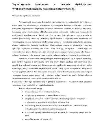 Wykorzystanie komputera w procesie dydaktyczno- wychowawczym uczniów nauczania zintegrowanego. Opracowała: mgr Hanna Kasperska Powszechność stosowania komputera spowodowała, że umiejętność korzystania z niego stała się nieodzownym elementem wykształcenia każdego człowieka. Natomiast nauczanie wspomagane komputerem stworzyło znakomite warunki dla rozwoju myślowotwórczego uczących się dzieci, oddziaływania na ich osobowość i nabywania różnorodnych umiejętności dydaktycznych. Kształcenie zintegrowane, jako pierwszy etap nauczania w szkole podstawowej stało się podstawą wprowadzenia i wykorzystania komputera do wspomagania procesu nabywania wiedzy przez uczniów i rozwijania umiejętności czytania, pisania (ortografia), liczenia, rysowania. Multimedialne programy edukacyjne, wybrane aplikacje użytkowe stanowią dla dzieci dużą atrakcję, zachęcając i mobilizując do systematycznej pracy. Komputer służy również jako narzędzie terapeutyczne dla dzieci z zaburzeniami mowy, słuchu oraz koordynacji wzrokowo-ruchowej i orientacji przestrzennej. Komputer w nauczaniu zintegrowanym powinien pojawiać się w sposób naturalny, jako bardzo wygodne i nowoczesne narzędzie pracy. Treści edukacji informatycznej oraz sposób ich realizacji muszą być dostosowane do możliwości percepcyjnych dzieci wieku młodszego. Służy temu dobór odpowiednich metod, który będzie uwzględniał zdobywanie wiedzy poprzez zabawę. Jest narzędziem służącym indywidualizacji nauczania zarówno pod względem tempa, czasu pracy, jak i stopnia wykonywanych ćwiczeń. Dzięki takiemu zróżnicowaniu zadań każde dziecko może odnieść sukces. Stosowanie technologii informacyjnej w procesie dydaktyczno – wychowawczym znacznie wspomaga pracę z dziećmi w I etapie kształcenia. Przeszkodę stanowić mogą: brak dostępu do pracowni komputerowej, ubogie oprogramowanie pracowni komputerowej, obojętność nauczycieli wobec wartości, jakie może przynieść nauczanie i wychowanie wspomagane technologią informacyjną, brak wiedzy o możliwościach wykorzystania komputera i odpowiedniego wykształcenia w tym kierunku przez nauczycieli. w przypadku przygotowania własnych prezentacji – czas przygotowywania do zajęć specyfika środowisk klasowych Wykorzystując komputer w nauczaniu, dzieci uczą się formułowania problemu i analizowania możliwości uzyskania jego optymalnego rozwiązania. Wypracowane przez dzieci wnioski wyrabiają u nich nawyki myślenia twórczego i pojęciowego. Jest zatem realizowany cel procesu nauczania i uczenia się poprzez przyswajanie wiadomości, umiejętności i wartości oraz monitorowany jest proces dydaktyczno-wychowawczy. Poprzez korzystanie ze sprzętu informatycznego wyrabiany jest nawyk do skoncentrowania się i dobrego zorganizowania swej pracy. Wykorzystanie środka informatyki do opracowania nowego materiału, bądź samodzielnego wykonywania zadań przez uczniów przyczynia się do powstania pozytywnej motywacji w czasie nauki. Taka motywacja powinna być podtrzymywana w każdym momencie procesu dydaktyczno- wychowawczego. Rozbudza ona także aktywność poznawczą uczniów i umiejętność rozwiązywania przez nich sytuacji zadaniowych i problemów. Możliwości praktycznego wykorzystania komputera w kształceniu zintegrowanym są bardzo duże w każdej płaszczyźnie integracji. Edukacja polonistyczna: ćwiczenia w czytaniu i pisaniu, czytanie ze zrozumieniem, poznanie i utrwalanie zasad ortografii, swobodne pisanie tekstów, pisanie i przesyłanie poczty elektronicznej z zastosowaniem form obowiązujących w korespondencji, sięganie do różnych źródeł informacji Edukacja matematyczna: wykonywanie prostych operacji matematycznych w ramach rachunku pamięciowego, porządkowanie i klasyfikowanie, algorytmy działań pisemnych, rozwiązywanie zadań wymagających logicznego myślenia, rozpoznawanie, porządkowanie figur geometrycznych. Edukacja plastyczno - techniczna: tworzenie form plastycznych w edytorze graficznym, projektowanie z wykorzystaniem dostępnych narzędzi graficznych, operowanie kolorem i teksturą, tworzenie graficznych form użytkowych, poznanie różnych urządzeń, ich działania oraz zasad bezpieczeństwa. Edukacja muzyczna: poznanie różnych instrumentów muzycznych i ich brzmienia, graficzne przedstawianie melodii z wykorzystaniem wszystkich znaków muzycznych, budowanie schematów rytmicznych, układanie własnych kompozycji z możliwością ich odsłuchania. Edukacja przyrodnicza: wykorzystanie rysunków, zdjęć, filmów i animacji komputerowych do: poznania różnych okazów przyrodniczych, ukazanie warunków ich życia, rozwoju, budowy zewnętrznej i wewnętrznej, obrazowego przedstawienia zależności występujących w przyrodzie, poznania mechanizmów zjawisk w zakresie przyrody nieożywionej, obrazowego przedstawienia prostych praw fizycznych i ich wykorzystania w różnych urządzeniach. Dla uczniów klas młodszych sam kontakt z komputerem jest wspaniałym ćwiczeniem umiejętności czytania i pisania, tym bardziej, że dziecko wykonując te czynności nie utożsamia ich z nauką, ale wynikają one przede wszystkim z potrzeby dokonania konkretnej operacji programowej. Zastosowanie komputera w nauczaniu zintegrowanym stwarza też wiele możliwości w zakresie właściwych oddziaływań wychowawczych. Umiejętnie zorganizowana praca z komputerem: wyrabia u ucznia umiejętność prawidłowej organizacji i planowania pracy, kształtuje poczucie odpowiedzialności za własną pracę, wyrabia nawyk koncentracji uwagi podczas pracy, kształtuje właściwe postawy koleżeńskie, wdraża do dokładności i cierpliwości podczas wykonywanej pracy, rozbudza zainteresowania i działalność poznawczą oraz aktywność twórczą, wdraża do samokształcenia i samokontroli. Współczesna nauka potwierdza, że dzieci uczą się szybciej i chętniej, gdy nauka połączona jest z zabawą. Wiele programów realizuje 