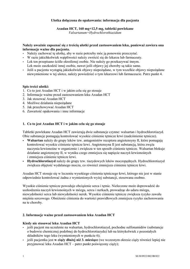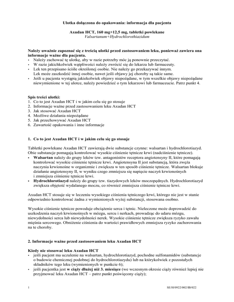 Ulotka dołączona do opakowania: informacja dla pacjenta Axudan HCT, 160 mg+12,5 mg, tabletki powlekane Valsartanum+Hydrochlorothiazidum Należy uważnie zapoznać się z treścią ulotki przed zastosowaniem leku, ponieważ zawiera ona informacje ważne dla pacjenta. Należy zachować tę ulotkę, aby w razie potrzeby móc ją ponownie przeczytać. W razie jakichkolwiek wątpliwości należy zwrócić się do lekarza lub farmaceuty. Lek ten przepisano ściśle określonej osobie. Nie należy go przekazywać innym. Lek może zaszkodzić innej osobie, nawet jeśli objawy jej choroby są takie same. Jeśli u pacjenta wystąpią jakiekolwiek objawy niepożądane, w tym wszelkie objawy niepożądane niewymienione w tej ulotce, należy powiedzieć o tym lekarzowi lub farmaceucie. Patrz punkt 4. Spis treści ulotki: 1. Co to jest Axudan HCT i w jakim celu się go stosuje 2. Informacje ważne przed zastosowaniem leku Axudan HCT 3. Jak stosować Axudan HCT 4. Możliwe działania niepożądane 5. Jak przechowywać Axudan HCT 6. Zawartość opakowania i inne informacje 1. Co to jest Axudan HCT i w jakim celu się go stosuje Tabletki powlekane Axudan HCT zawierają dwie substancje czynne: walsartan i hydrochlorotiazyd. Obie substancje pomagają kontrolować wysokie ciśnienie tętnicze krwi (nadciśnienie tętnicze). Walsartan należy do grupy leków tzw. antagonistów receptora angiotensyny II, które pomagają kontrolować wysokie ciśnienie tętnicze krwi. Angiotensyna II jest substancją, która zwęża naczynia krwionośne w organizmie i zwiększa w ten sposób ciśnienie tętnicze. Walsartan blokuje działanie angiotensyny II, w wyniku czego zmniejsza się napięcie naczyń krwionośnych i zmniejsza ciśnienie tętnicze krwi. Hydrochlorotiazyd należy do grupy tzw. tiazydowych leków moczopędnych. Hydrochlorotiazyd zwiększa objętość wydalanego moczu, co również zmniejsza ciśnienie tętnicze krwi. Axudan HCT stosuje się w leczeniu wysokiego ciśnienia tętniczego krwi, którego nie jest w stanie odpowiednio kontrolować żadna z wymienionych wyżej substancji, stosowana osobno. Wysokie ciśnienie tętnicze powoduje obciążenie serca i tętnic. Nieleczone może doprowadzić do uszkodzenia naczyń krwionośnych w mózgu, sercu i nerkach, prowadząc do udaru mózgu, niewydolności serca lub niewydolności nerek. Wysokie ciśnienie tętnicze zwiększa ryzyko zawału mięśnia sercowego. Obniżenie ciśnienia do wartości prawidłowych zmniejsza ryzyko zachorowania na te choroby. 2. Informacje ważne przed zastosowaniem leku Axudan HCT Kiedy nie stosować leku Axudan HCT jeśli pacjent ma uczulenie na walsartan, hydrochlorotiazyd, pochodne sulfonamidów (substancje o budowie chemicznej podobnej do hydrochlorotiazydu) lub na którykolwiek z pozostałych składników tego leku (wymienionych w punkcie 6); jeśli pacjentka jest w ciąży dłużej niż 3. miesiące (we wczesnym okresie ciąży również lepiej nie przyjmować leku Axudan HCT – patrz punkt poświęcony ciąży); 1 SE/H/0922/002/IB/022 jeśli pacjent ma ciężką chorobę wątroby, uszkodzenie małych przewodów żółciowych w wątrobie (marskość), prowadzące do zastoju żółci; jeśli pacjent ma ciężką chorobę nerek; jeśli organizm pacjenta nie wytwarza moczu (bezmocz); jeśli pacjent jest poddawany dializie („sztuczna nerka”); jeśli mimo leczenia stężenie potasu lub sodu we krwi pacjenta jest mniejsze od prawidłowego lub jeśli stężenie wapnia we krwi jest większe od prawidłowego; jeśli pacjent ma dnę moczanową; jeśli pacjent choruje na cukrzycę lub ma zaburzenia czynności nerek i otrzymuje lek obniżający ciśnienie tętnicze krwi zawierający aliskiren. Jeśli którakolwiek z powyższych sytuacji dotyczy pacjenta, nie należy przyjmować leku, lecz należy skontaktować się z lekarzem. Ostrzeżenia i środki ostrożności Przed rozpoczęciem przyjmowania leku Axudan HCT należy omówić to z lekarzem, jeśli: pacjent przyjmuje leki oszczędzające potas, suplementy potasu, zamienniki soli kuchennej zawierające potas lub inne leki, które zwiększają ilość potasu we krwi (takie jak heparyna), konieczna może być regularna kontrola stężenia potasu we krwi przez lekarza. u pacjenta stwierdzono małe stężenie potasu we krwi. pacjent ma biegunkę lub ciężkie wymioty. pacjent przyjmuje duże dawki leków moczopędnych. pacjent ma ciężką chorobę serca. pacjent ma niewydolność serca lub przebył zawał mięśnia sercowego; należy ściśle przestrzegać zaleconej przez lekarza dawki początkowej. Lekarz może również skontrolować czynność nerek pacjenta. pacjent ma zwężenie tętnicy nerkowej. pacjent otrzymał niedawno nową nerkę (przebył zabieg przeszczepienia nerki). u pacjenta stwierdzono hiperaldosteronizm – chorobę, w której nadnercza wytwarzają zbyt dużo hormonu aldosteronu; w takim przypadku stosowanie walsartanu z hydrochlorotiazydem nie jest zalecane. pacjent ma chorobę wątroby lub nerek. kiedykolwiek podczas stosowania innych leków (w tym inhibitorów ACE) wystąpił u pacjenta obrzęk języka i twarzy (tzw. obrzęk naczynioruchowy) na skutek reakcji alergicznej. Jeśli takie objawy wystąpią podczas stosowania leku Axudan HCT, należy natychmiast przerwać jego przyjmowanie i już nigdy więcej go nie stosować. Patrz także punkt 4 „Możliwe działania niepożądane”. pacjent ma gorączkę, wysypkę i bóle stawów, które mogą być objawami układowego tocznia rumieniowatego (tzw. choroby autoimmunologicznej). pacjent ma cukrzycę, dnę, duże stężenie cholesterolu lub triglicerydów we krwi. u pacjenta wystąpiły w przeszłości reakcje alergiczne po zastosowaniu innych leków zmniejszających ciśnienie tętnicze krwi, należących do tej samej grupy (antagonistów receptora angiotensyny II) lub jeśli u pacjenta stwierdzono alergię lub astmę oskrzelową. u pacjenta nastąpiło pogorszenie widzenia lub odczuwa ból oka. Mogą to być objawy