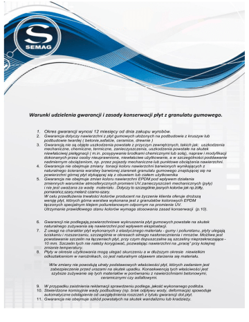 Warunki udzielenia gwarancji i zasady konserwacji płyt z granulatu gumowego. 1. Okres gwarancji wynosi 12 miesięcy od dnia zakupu wyrobów. 2. Gwarancja dotyczy nawierzchni z płyt gumowych ułożonych na podbudowie z kruszyw lub podbudowie twardej ( betonie,asfalcie, ceramice, drewnie ) 3. Gwarancją nie są objęte uszkodzenia powstałe z przyczyn zewnętrznych, takich jak: uszkodzenia mechaniczne, chemiczne, termiczne, zanieczyszczenia, uszkodzenia powstałe na skutek niewłaściwej pielęgnacji ( m.in. posypywanie środkami chemicznymi lub solą), napraw i modyfikacji dokonanych przez osoby nieuprawnione, niewłaściwe użytkowanie, a w szczególności poddawanie nadmiernym obciążeniom, np. przez pojazdy mechaniczne lub punktowe obciążenia nawierzchni. 4. Gwarancja nie obejmuje zmiany tonacji koloru nawierzchni barwionych wynikających z naturalnego ścierania warstwy barwionej ziarenek granulatu gumowego znajdującej się na powierzchni górnej płyt stykającej się z obuwiem lub ciałem użytkownika 5. Gwarancja nie obejmuje zmian koloru nawierzchni EPDM pod wpływem działania zmiennych warunków atmosferycznych promieni UV,zanieczyszczeń mechanicznych (pyły) i nie jest uważana za wadę materiału . Dotyczy to szczególnie jasnych kolorów jak np.żółty, pomarańcz,szary,melanż czarno-szary. W celu przedłużenia trwałości kolorów producent na życzenie klienta oferuje droższą wersję płyt, których górna warstwa wykonana jest z granulatów kolorowych EPDM łączonych specjalnym klejem poliuretanowym odpornym na promienie UV. Utrzymanie prawidłowego stanu kolorów wymaga stosowania zasad konserwacji (p.10). 6. Gwarancji nie podlegają powierzchniowe wykruszenia płyt gumowych powstałe na skutek naturalnego zużywania się nawierzchni pod wpływem eksploatacji. 7. Z uwagi na charakter płyt wykonanych z elastycznego materiału - gumy i poliuretanu, płyty ulegają ściskaniu i rozszerzaniu, szczególnie w okresach silnego nasłonecznienia i mrozów. Możliwe jest powstawanie szczelin na łączeniach płyt, przy czym dopuszczalne są szczeliny nieprzekraczające 10 mm. Szczelin tych nie należy korygować, pozwalając nawierzchni na „pracę” przy kolejnej zmianie temperatury. 8. Płyty w okresie użytkowania mogą ulegać skurczeniu a w dłuższym okresie niewielkim odkształceniom w narożnikach, co jest naturalnym objawem starzenia się materiału. W/w zmiany nie powodują utraty podstawowych właściwości płyt, których zadaniem jest zabezpieczenie przed urazami na skutek upadku. Konsekwencją tych właściwości jest szybsze zużywanie się tych materiałów w porównaniu z nawierzchniami betonowymi, ceramicznymi czy asfaltowymi. 9. W przypadku zaistnienia reklamacji sprawdzeniu podlega, jakość wykonanego podłoża. 10. Stwierdzone komisyjnie wady podbudowy (np. brak odpływu wody, deformacja) spowoduje automatyczne odstąpienie od uwzględnienia roszczeń z tytułu gwarancji dot.płyt. 11. Gwarancja nie obejmuje szkód powstałych na skutek wandalizmu lub kradzieży. Zasady konserwacji płyt. 1. Nawierzchnię z płyt gumowych należy ułożyć na podbudowie z kruszyw lub betonie. 2. Ze względu na właściwości materiału, z jakiego wykonane są maty i krawężniki gumowe oraz ze względu na sposób montażu nawierzchni na betonie lub podbudowie z kruszyw niepowiązanych ze sobą w sposób trwały, dopuszczalne są nierówności w poziomie pomiędzy poszczególnymi matami dochodzące do kilku mm oraz nierówności na płaszczyźnie podbudowy nieprzekraczające 5-mm na odcinku o dł. 2, m. Pochylenie powierzchni min.0, 5%.W przypadku podłoża utwardzanego w miejscach uniemożliwiających wyrównanie zagęszczarką należy dążyć do takiego ułożenia płyt przy pomocy ręcznego zagęszczenia gruntu, aby na połączeniach płyt różnica wysokości pomiędzy krawędziami nie przekraczała 5 mm z uwagi na możliwość potknięcia. 3. Płyty nie powinny być układane w temperaturze powyżej 25 °C i poniżej 5°C. 4. Płyty należy przechowywać na paletach i chronić przed deszczem i słońcem. 5. Składowanie płyt na dłuższy okres czasu jest możliwe tylko w pomieszczeniach zamkniętych, niezawilgoconych, oraz na paletach po zdjęciu folii opakowaniowej w celu zapewnienia przepływu powietrza. Zbyt długi czas magazynowania może spowodować odbarwienia na powierzchniach styku płyt ułożonych na paletach. 6. Nie należy stosować twardych narzędzi do oczyszczania powierzchni, ponieważ mogą one spowodować mechaniczne uszkodzenia materiału. 7. W ramach regularnej kontroli przez oględziny należy: - sprawdzać uszkodzenia mechaniczne nawierzchni. - sprawdzać zabrudzenia nawierzchni, szczególnie zatłuszczenia smarów, olejów. 8. W ramach kontroli funkcjonalnej (co 1 do 3 miesięcy) należy: - wykonać czynności sprawdzające szerokości szczelin pomiędzy płytami. 9. - dokonać oględzin wybrzuszeń i odkształceń nawierzchni przy pomocy łaty pomiarowej. 10. - 2 razy w roku płyty należy myć i czyścić mechanicznie pod ciśnieniem przy użyciu środków myjących co jest warunkiem utrzymania gwarancji producenta granulatu. 11. W ramach corocznej kontroli podstawowej należy: - wykonać czynności sprawdzające w ramach kontroli regularnej. - wykonać czynności sprawdzające w ramach kontroli funkcjonalnej. - dokonać kontroli drenażu (odpływu wody) strumieniem wody, podbudowa powinna odbierać wodę. - dokonać kontroli wykruszania się krawędzi płyt i odkształceń płyt. W przypadku braku systematycznego mycia nawierzchni, mogą powstać trwałe odbarwienia, które można poddać renowacji koloru, polegającej na pokryciu powierzchni warstwą ochronną sportowego lakieru w kolorze nawierzchni. W celu odświeżenia koloru SEMAG może wykonać odpłatnie usługę malowania.
