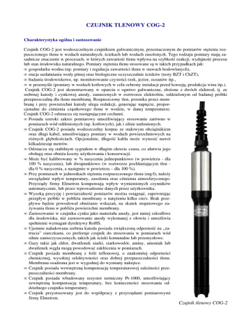 CZUJNIK TLENOWY COG-2 Charakterystyka ogólna i zastosowanie Czujnik COG-2 jest wodoszczelnym czujnikiem galwanicznym, przeznaczonym do pomiarów stężenia rozpuszczonego tlenu w wodach naturalnych, ściekach lub wodach zasolonych. Tego rodzaju pomiary mają zasadnicze znaczenie w procesach, w których zawartość tlenu wpływa na szybkość reakcji, wydajność procesu lub stan środowiska naturalnego. Pomiary stężenia tlenu stosowane są w takich przypadkach jak: • gospodarka wodna (np. pomiary i regulacja zawartości tlenu w stawach hodowlanych), • stacje uzdatniania wody pitnej oraz biologiczne oczyszczalnie ścieków (testy BZT i ChZT), • badania środowiskowe, np. monitorowanie czystości rzek, jezior, oceanów itp., • w przemyśle (pomiary w wodach kotłowych w celu ochrony instalacji przed korozją, produkcja wina itp.). Czujnik COG-2 jest skonstruowany w oparciu o ogniwo galwaniczne, złożone z dwóch elektrod, tj. ze srebrnej katody i cynkowej anody, zanurzonych w roztworze elektrolitu, oddzielonym od badanej próbki przepuszczalną dla tlenu membraną. Rozpuszczony tlen, przenika przez membranę i przy powierzchni katody ulega redukcji, generując napięcie, proporcjonalne do ciśnienia cząstkowego tlenu w wodzie, w danej temperaturze. Czujnik COG-2 odznacza się następującymi cechami. • Posiada szeroki zakres pomiarowy umożliwiający stosowanie zarówno w pomiarach wód odtlenionych (np. kotłowych), jak i silnie natlenionych. • Czujnik COG-2 posiada wodoszczelny korpus ze stalowym obciążnikiem oraz długi kabel, umożliwiający pomiary w wodach powierzchniowych na różnych głębokościach. Opcjonalnie, długość kabla może wynosić nawet kilkadziesiąt metrów. • Odznacza się stabilnym sygnałem w długim okresie czasu, co ułatwia jego obsługę oraz obniża koszty użytkowania i konserwacji. • Może być kalibrowany w % nasycenia jednopunktowo (w powietrzu - dla 100 % nasycenia), lub dwupunktowo (w roztworze pochłaniającym tlen dla 0 % nasycenia, a następnie w powietrzu – dla 100 %). • Przy pomiarach w jednostkach stężenia rozpuszczonego tlenu (mg/l), należy uwzględnić wpływ temperatury, zasolenia oraz ciśnienia atmosferycznego. Przyrządy firmy Elmetron kompensują wpływ wymienionych czynników automatycznie, lub przez wprowadzenie danych przez użytkownika. • Wysoką precyzję i powtarzalność pomiarów można osiągnąć, zapewniając przepływ próbki w pobliżu membrany o natężeniu kilku cm/s. Brak przepływu będzie powodował obniżanie wskazań, na skutek stopniowego zużywania tlenu w pobliżu powierzchni membrany. • Zastosowanie w czujniku cynku jako materiału anody, jest mniej szkodliwe dla środowiska, niż zastosowanie anody wykonanej z ołowiu i umożliwia spełnienie wymagań dyrektywy RoHS. • Ujemnie naładowana srebrna katoda posiada zwiększoną odporność na „zatrucia” siarczkami, co preferuje czujnik do stosowania w pomiarach wód silnie zanieczyszczonych, takich jak ścieki komunalne lub przemysłowe. • Gazy takie jak chlor, dwutlenek siarki, siarkowodór, aminy, amoniak lub dwutlenek węgla mogą powodować zakłócenia w pomiarach. • Czujnik posiada membranę z folii teflonowej, o znakomitej odporności chemicznej, wysokiej selektywności oraz dobrej przepuszczalności tlenu. Membrana osadzona jest w wygodnej do wymiany nakrętce. • Czujnik posiada wewnętrzną kompensację temperaturowej zależności przepuszczalności membrany. • Czujnik posiada wbudowany rezystor termiczny Pt-1000, umożliwiający zewnętrzną kompensację temperatury, bez konieczności stosowania oddzielnego czujnika temperatury. • Czujnik przystosowany jest do współpracy z przyrządami pomiarowymi firmy Elmetron. Czujnik tlenowy COG-2 Dane techniczne Zakres pomiarowy Dokładność Zakres temperatur stosowania Zakres kompensacji temperatury Sygnał dla 100 % nasycenia O2 Sygnał dla 0 % nasycenia O2 Dryft sygnału Czas reakcji t90 Kompensacja wewnętrzna Kompensacja zewnętrzna Materiał katody Materiał anody Materiał membrany Materiał korpusu i nasadki membranowej Materiał obciążnika Elektrolit wewnętrzny Długość korpusu (do oprawki) Średnica korpusu Długość przewodu Wtyczka czujnika tlenowego Wtyczka czujnika temperatury 0...60 mg/l (0...400 %) ± 0,1 mg/l (± 1 %) 0...40ºC 0...40ºC 20...25 mV maksymalnie 0,3 mV 1 %/24 godziny poniżej 2 minut tak (termistor) tak (termorezystor Pt-1000) srebro cynk folia teflonowa PCW stal nierdzewna KCl 0,5 mol/l 120 ± 5 mm 18,0 ± 0,5 mm standardowo 4 m BNC RCA Nakrętka membranowa Zapasowe materiały Czujnik tlenowy COG-2 uzupełniony jest o zestaw materiałów eksploatacyjnych, i dostarczany w plastikowym pojemniku, w którym zapewniono również miejsce dla przyrządu serii 400. W skład zestawu wchodzą następujące materiały: − czujnik tlenowy COG-2, − zapasowe nakrętki membranowe, 2 szt., − elektrolit do napełniania czujnika, 30 ml, − siarczyn sodu do przygotowania roztworu kalibracyjnego o zerowej zawartości tlenu, 50 g. Zestaw materiałów eksploatacyjnych Producent ELMETRON Sp.j., 41-814 Zabrze, ul. W. Witosa 10. Sprzedawca HYDROMET S.C. Justyna Krakowczyk i Adam Krakowczyk 44-100 Gliwice, ul. Karola Miarki 12 tel./fax +48 32 2345537 www.hydromet.com.pl e-mail: [email protected]