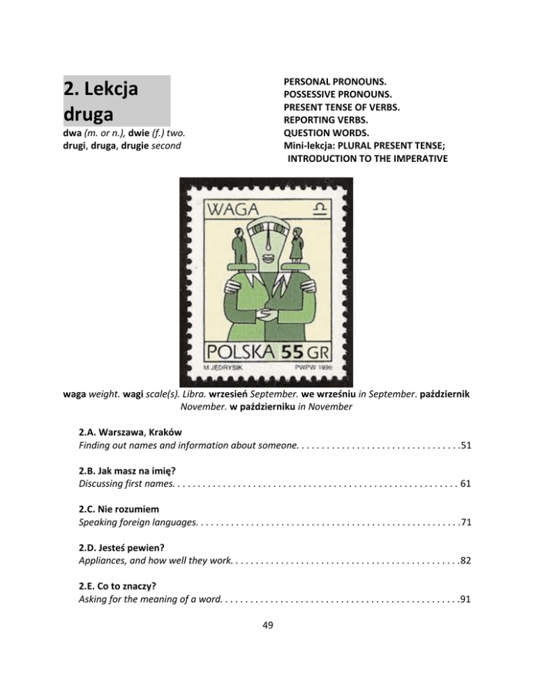 PERSONAL PRONOUNS. POSSESSIVE PRONOUNS. PRESENT TENSE OF VERBS. REPORTING VERBS. QUESTION WORDS. Mini-lekcja: PLURAL PRESENT TENSE; INTRODUCTION TO THE IMPERATIVE 2. Lekcja druga dwa (m. or n.), dwie (f.) two. drugi, druga, drugie second waga weight. wagi scale(s). Libra. wrzesień September. we wrześniu in September. październik November. w październiku in November 2.A. Warszawa, Kraków Finding out names and information about someone. . . . . . . . . . . . . . . . . . . . . . . . . . . . . . . . .51 2.B. Jak masz na imię? Discussing first names. . . . . . . . . . . . . . . . . . . . . . . . . . . . . . . . . . . . . . . . . . . . . . . . . . . . . . . . . 61 2.C. Nie rozumiem Speaking foreign languages. . . . . . . . . . . . . . . . . . . . . . . . . . . . . . . . . . . . . . . . . . . . . . . . . . . . .71 2.D. Jesteś pewien? Appliances, and how well they work. . . . . . . . . . . . . . . . . . . . . . . . . . . . . . . . . . . . . . . . . . . . . .82 2.E. Co to znaczy? Asking for the meaning of a word. . . . . . . . . . . . . . . . . . . . . . . . . . . . . . . . . . . . . . . . . . . . . . . .91 49 2. LEKCJA DRUGA Warszawa: Pałac Kultury i Nauki Warsaw: Palace of Culture and Science. Pałac Kultury i Nauki w Warszawie (The Palace of Culture and Science in Warsaw, PKiN). Originally named after Soviet leader Joseph Stalin, at 42 stories and 231 meters high, it is still the tallest building in Poland. An observation point on the 30 th floor provides a fine view of the city. The PKiN was built on the cleared-out ruins of bombed-out downtown Warsaw in 19521955 by Soviet architects and some 3500 Russian laborers, the “gift of the Soviet people" to the people of Poland. It is an example of the Soviet Gothic style (reaching for the sky), and its exterior boasts monumental examples of socialist-realist sculpture. The building houses theaters, cinemas, restaurants, bookstores, restaurants, public institutions, and many private offices. Older Poles resent the building as a reminder of past Soviet oppression, while it finds more acceptance among the younger generation who grew up with it. 50 2. LEKCJA DRUGA 2.A. Warszawa, Kraków. W pociągu. In a train. Formal style. Trying to find out information about someone. Thanks for the pleasant company. I likewise thank you. Pan X: -Dziękuję za miłe towarzystwo. Pani Y: -Ja również dziękuję. Pan X: Czy pani mieszka w Warszawie? Pani Y: Nie, mieszkam i studiuję <pracuję> w Krakowie. Pan X: A jak się pani nazywa? Pani Y: Nazywam się Maria Zielińska. Dlaczego pan pyta? Pan X: Po prostu jestem ciekawy. Czy pani jest zamężna? Pani Y: To jest tylko moja sprawa, proszę pana. Pan X: Czy mogę poprosić o pani adres <numer telefonu, adres emailowy>? Pani Y: Raczej nie. Do you live in Warsaw? No, I live and study <work> in Kraków. And what's your name? My name is Maria Zielińska. Why do you ask? I'm simply curious. Are you married? That is only my business, sir. May I ask for your address <phone number, email address>? Rather not. 51 2. LEKCJA DRUGA Do zapamiętania: Czy mogę prosić o pani (pana) adres? Czy pan jest żonaty? Czy pani jest zamężna? Dlaczego pan(i) pyta? Dziękuję za miłe towarzystwo. Gdzie pan(i) mieszka? Ja również dziękuję. Jak się pan(i) nazywa? Mieszkam w Warszawie. Nazywam się Maria Zielińska (Marian Zieliński). Po prostu jestem ciekawy (ciekawa). Pracuję i studiuję w Krakowie. Raczej nie. To jest tylko moja sprawa. Uwagi byłeś (byłaś) you were, you have been (past tense of być) Kraków Cracow. w Krakowie in Kraków mieszkać -am -asz live, reside może maybe, perhaps myśleć -lę, -lisz think. jak myślisz what do you think? najpierw av first nazywać się –am –asz be called, call oneself. The verb implies both first and last name. pan X "pan iks", pani Y "pani igrek" po prostu simply, merely. From prosty simple. pociąg mi train. w pociągu in/on a train podróź f journey pracować -cuję -cujesz work proszę pana if you please, sir. proszę pani if you please, madam przyjemny aj pleasant pytać -am -asz ask (a question). o+A ask about studiować -diuję, -diujesz study (as a main subject) Warszawa Warsaw. w Warszawie in Warsaw widziałeś (widziałaś) you saw, you have seen (past tense of widzieć see) zamężna aj married (of a woman) żonaty asj married (of a man) Pytania Answer questions beginning with dlaczego why with bo because or, more formally, with dlatego, że for the reason that or ponieważ since. Dlaczego on pyta? Why does he ask? Bo on jest ciekawy (bo ona jest ciekawa). Because he (she) is curious. For some questions, you may want to answer nie wiem I don't know. or nie wiemy we don't know. 52 2. LEKCJA DRUGA 1. Gdzie jest pociąg? Kto jest w pociągu? 2. O co najpierw* (first) pyta ten pan? 3. Gdzie mieszka ta pani? Czy ona tam pracuje? Czy ona tam studiuje? Co ona studiuje? 4. Dlaczego ta pani jedzie (is travelling) do Warszawy? 5. Jak ta pani się nazywa? Dlaczego ten pan pyta? 6. Dlaczego on pyta, czy ona jest zamężna? 7. Czy ta pani jest zamężna? Jak myślisz, czy ten pan jest żonaty? 8. Dlaczego ta pani mówi „raczej nie”, kiedy on pyta o jej adres i numer telefonu? 9. A ty jak się nazywasz? Czy studiujesz? Co? Gdzie? Czy pracujesz? Gdzie? Co robisz? 10. Czy jesteś żonaty? (zamężna?) Czy myślisz, że to jest tylko twoja sprawa? 11. Byłeś (byłaś) w Warszawie? W Krakowie? [Nie, nie byłem (byłam) tam]. Widziałeś (widziałaś) Pałac Kultury w Warszawie? Kościół Mariacki w Krakowie? [Nie, nie widziałem (widziałam)].** * Adverbs of sequence (for use in narration): najpierw first. potem then, after that. następnie next, subsequently. przedtem before that. w końcu finally. **For the time being, negative responses will occasionally be suggested following yes-no questions. Negative responses containing direct objects require the Genitive case on the object (Mini-Lesson 5 and Lesson 9). For the time being, give negative responses simply by negati