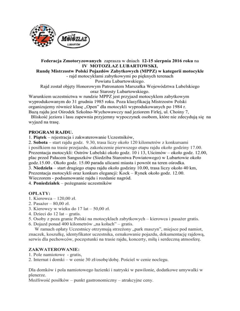 Federacja Zmotoryzowanych zaprasza w dniach 12-15 sierpnia 2016 roku na IV MOTOZŁAZ LUBARTOWSKI, Rundę Mistrzostw Polski Pojazdów Zabytkowych (MPPZ) w kategorii motocykle - rajd motocyklami zabytkowymi po pięknych terenach Powiatu Lubartowskiego. Rajd został objęty Honorowym Patronatem Marszałka Województwa Lubelskiego oraz Starosty Lubartowskiego. Warunkiem uczestnictwa w rundzie MPPZ jest przyjazd motocyklem zabytkowym wyprodukowanym do 31 grudnia 1985 roku. Poza klasyfikacją Mistrzostw Polski organizujemy również klasę „Open” dla motocykli wyprodukowanych po 1984 r. Bazą rajdu jest Ośrodek Szkolno-Wychowawczy nad jeziorem Firlej, ul. Choiny 7, Bliskość jeziora i lasu zapewnia przyjemny wypoczynek osobom, które nie zdecydują się na wyjazd na trasę. PROGRAM RAJDU. 1. Piątek – rejestracja i zakwaterowanie Uczestników, 2. Sobota – start rajdu godz. 9.30, trasa liczy około 120 kilometrów z konkursami i posiłkiem na trasie przejazdu, zakończenie pierwszego etapu rajdu około godziny 17.00. Prezentacja motocykli: Ostrów Lubelski około godz. 10 i 13, Uścimów – około godz. 12.00, plac przed Pałacem Sanguszków (Siedziba Starostwa Powiatowego) w Lubartowie około godz.15.00 . Około godz. 15.00 parada ulicami miasta i powrót na teren ośrodka. 3. Niedziela – start drugiego etapu rajdu około godziny 10.00, trasa liczy około 40 km, Prezentacja motocykli oraz konkurs elegancji: Kock – Rynek około godz. 12.00. Wieczorem - podsumowanie rajdu i rozdanie nagród. 4. Poniedziałek – pożegnanie uczestników OPŁATY: 1. Kierowca – 120,00 zł. 2. Pasażer – 80,00 zł. 3. Kierowcy w wieku do 17 lat – 50,00 zł. 4. Dzieci do 12 lat – gratis. 5. Osoby z poza granic Polski na motocyklach zabytkowych – kierowca i pasażer gratis. 6. Dojazd ponad 400 kilometrów „na kołach” – gratis. W ramach opłaty Uczestnicy otrzymują strzeżony „park maszyn”, miejsce pod namiot, znaczek, koszulkę, identyfikator uczestnika, oznakowanie pojazdu, dokumentację rajdową, serwis dla pechowców, poczęstunki na trasie rajdu, koncerty, miłą i serdeczną atmosferę. ZAKWATEROWANIE: 1. Pole namiotowe - gratis, 2. Internat i domki – w cenie 30 zł/osobę/dobę. Pościel w cenie noclegu. Dla domków i pola namiotowego łazienki i natryski w pawilonie, dodatkowe umywalki w plenerze. Możliwość posiłków – punkt gastronomiczny – atrakcyjne ceny. KONTAKT I REZERWACJA NOCLEGÓW: Robert, tel. 602 445 954, e-mail: [email protected] Waldek, tel. 604 402 608, e-mail: [email protected] Federacja Zmotoryzowanych, e-mail: [email protected], www. federacjazmotoryzowanych.pl O zakwaterowaniu Uczestników decyduje pierwszeństwo dokonanej rezerwacji. Wolne miejsca noclegowe będą uzupełniane przez Organizatora losowo. RAJD WSPÓŁFINANSUJE POWIAT LUBARTOWSKI. UWAGA!!! 1. Rajd organizowany jest wg Regulaminu Mistrzostw Polski Pojazdów Zabytkowych Kategoria Motocykle 2015 (MPPZ) http://www.pzm.pl/pojazdy-zabytkowe/regulaminy 2. Wszyscy uczestnicy rajdu MUSZĄ mieć ze sobą przygotowane karty zgłoszenia uczestnictwa zgodne z wymogami PZM. 3. Uczestnik Rajdu zobowiązany jest do przestrzegania Przepisów Ruchu Drogowego. 4. Uczestnicy Rajdu ponoszą pełną odpowiedzialność za swój udział w Rajdzie oraz odpowiedzialność odszkodowawczą wobec osób trzecich, w tym w szczególności wobec innych Uczestników Rajdu, Organizatora, podmiotu prowadzącego ośrodek stanowiący Bazę Rajdu, a także wobec innych uczestników ruchu drogowego. Organizator: Federacja Zmotoryzowanych