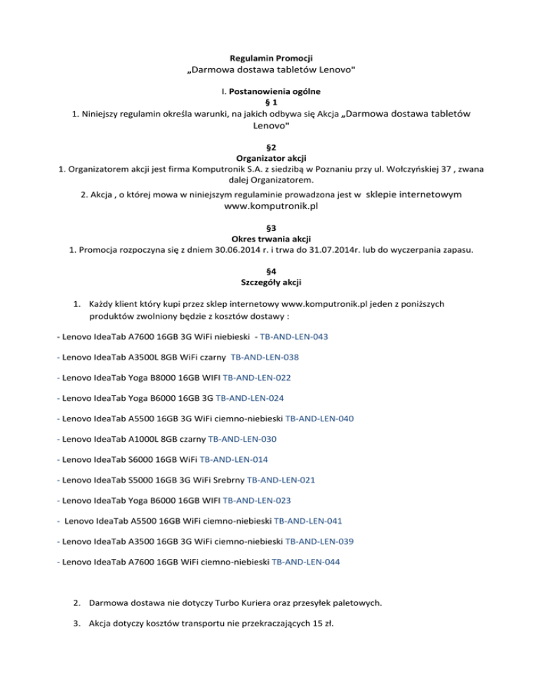 Regulamin Promocji „Darmowa dostawa tabletów Lenovo" I. Postanowienia ogólne §1 1. Niniejszy regulamin określa warunki, na jakich odbywa się Akcja „Darmowa dostawa tabletów Lenovo" §2 Organizator akcji 1. Organizatorem akcji jest firma Komputronik S.A. z siedzibą w Poznaniu przy ul. Wołczyńskiej 37 , zwana dalej Organizatorem. 2. Akcja , o której mowa w niniejszym regulaminie prowadzona jest w sklepie internetowym www.komputronik.pl §3 Okres trwania akcji 1. Promocja rozpoczyna się z dniem 30.06.2014 r. i trwa do 31.07.2014r. lub do wyczerpania zapasu. §4 Szczegóły akcji 1. Każdy klient który kupi przez sklep internetowy www.komputronik.pl jeden z poniższych produktów zwolniony będzie z kosztów dostawy : - Lenovo IdeaTab A7600 16GB 3G WiFi niebieski - TB-AND-LEN-043 - Lenovo IdeaTab A3500L 8GB WiFi czarny TB-AND-LEN-038 - Lenovo IdeaTab Yoga B8000 16GB WIFI TB-AND-LEN-022 - Lenovo IdeaTab Yoga B6000 16GB 3G TB-AND-LEN-024 - Lenovo IdeaTab A5500 16GB 3G WiFi ciemno-niebieski TB-AND-LEN-040 - Lenovo IdeaTab A1000L 8GB czarny TB-AND-LEN-030 - Lenovo IdeaTab S6000 16GB WiFi TB-AND-LEN-014 - Lenovo IdeaTab S5000 16GB 3G WiFi Srebrny TB-AND-LEN-021 - Lenovo IdeaTab Yoga B6000 16GB WIFI TB-AND-LEN-023 - Lenovo IdeaTab A5500 16GB WiFi ciemno-niebieski TB-AND-LEN-041 - Lenovo IdeaTab A3500 16GB 3G WiFi ciemno-niebieski TB-AND-LEN-039 - Lenovo IdeaTab A7600 16GB WiFi ciemno-niebieski TB-AND-LEN-044 2. Darmowa dostawa nie dotyczy Turbo Kuriera oraz przesyłek paletowych. 3. Akcja dotyczy kosztów transportu nie przekraczających 15 zł. §5 Postanowienia końcowe 1. Treść niniejszego regulaminu znajduje się: a. w siedzibie Komputronik b. na stronie internetowej http://www.komputronik.pl 2. W sprawach nieuregulowanych niniejszym regulaminem zastosowanie mają przepisy kodeksu cywilnego.