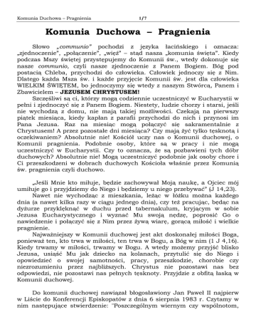 Komunia Duchowa – Pragnienia 1/7 Komunia Duchowa – Pragnienia Słowo „communio” pochodzi z języka łacińskiego i oznacza: „zjednoczenie”, „połączenie”, „więź” – stąd nasza „komunia święta”. Kiedy podczas Mszy świętej przystępujemy do Komunii św., wtedy dokonuje się nasze communio, czyli nasze zjednoczenie z Panem Bogiem. Bóg pod postacią Chleba, przychodzi do człowieka. Człowiek jednoczy się z Nim. Dlatego każda Msza św. i każde przyjęcie Komunii św. jest dla człowieka WIELKIM ŚWIĘTEM, bo jednoczymy się wtedy z naszym Stwórcą, Panem i Zbawicielem – JEZUSEM CHRYSTUSEM! Szczęśliwi są ci, którzy mogą codziennie uczestniczyć w Eucharystii w pełni i zjednoczyć się z Panem Bogiem. Niestety, ludzie chorzy i starsi, jeśli nie wychodzą z domu, nie mają takiej możliwości. Czekają na pierwszy piątek miesiąca, kiedy kapłan z parafii przychodzi do nich i przynosi im Pana Jezusa. Raz na miesiąc mogą połączyć się sakramentalnie z Chrystusem! A przez pozostałe dni miesiąca? Czy mają żyć tylko tęsknotą i oczekiwaniem? Absolutnie nie! Kościół uczy nas o Komunii duchowej, o Komunii pragnienia. Podobnie osoby, które są w pracy i nie mogą uczestniczyć w Eucharystii. Czy to oznacza, że są pozbawieni tych dóbr duchowych? Absolutnie nie! Mogą uczestniczyć podobnie jak osoby chore i Ci przeszkodzeni w dobrach duchowych Kościoła właśnie przez Komunią św. pragnienia czyli duchowo. „Jeśli Mnie kto miłuje, będzie zachowywał Moją naukę, a Ojciec mój umiłuje go i przyjdziemy do Niego i będziemy u niego przebywać” (J 14,23). Nawet nie wychodząc z mieszkania, leżąc w łóżku można każdego dnia (a nawet kilka razy w ciągu jednego dnia), czy też pracując, będąc na dyżurze przyklęknąć w duchu przed tabernakulum, kryjącym w sobie Jezusa Eucharystycznego i wyznać Mu swoją nędzę, poprosić Go o nawiedzenie i połączyć się z Nim przez żywą wiarę, gorącą miłość i wielkie pragnienie. Najważniejszy w Komunii duchowej jest akt doskonałej miłości Boga, ponieważ ten, kto trwa w miłości, ten trwa w Bogu, a Bóg w nim (1 J 4,16). Kiedy trwamy w miłości, trwamy w Bogu. A wtedy możemy przyjść blisko Jezusa, usiąść Mu jak dziecko na kolanach, przytulić się do Niego i opowiedzieć o swojej samotności, pracy, przeszkodzie, chorobie czy niezrozumieniu przez najbliższych. Chrystus nie pozostawi nas bez odpowiedzi, nie pozostawi nas pełnych tęsknoty. Przyjdzie z obfitą łaską w Komunii duchowej. Do komunii duchowej nawiązał błogosławiony Jan Paweł II najpierw w Liście do Konferencji Episkopatów z dnia 6 sierpnia 1983 r. Czytamy w nim następujące stwierdzenie: "Poszczególnym wiernym czy wspólnotom, Komunia Duchowa – Pragnienia 2/7 którzy z powodu prześladowań lub braku kapłanów są pozbawieni, przez dłuższy czy krótszy czas, możliwości celebrowania świętej Eucharystii, nie brakuje jednak łaski Odkupiciela. Jeśli ożywiani wewnętrznie pragnieniem sakramentu i zjednoczeni w modlitwie z całym Kościołem wzywają Pana i wznoszą do Niego swoje serca, w mocy Ducha Świętego żyją w komunii z Kościołem, żywym Ciałem Chrystusa, i z samym Panem. Chociaż, zjednoczeni z Kościołem za pośrednictwem pragnienia sakramentu, wydawaliby się zewnętrznie dalecy od Niego, to wewnętrznie i rzeczywiście są w komunii z Nim i dzięki temu otrzymują owoce sakramentu". O komunii duchowej błogosławiony Jan Paweł II. przypomniał także w encyklice poświęconej tajemnicy Eucharystii w numerze 34: "W Eucharystii znajduje swój kres wszelkie ludzkie pragnienie, ponieważ tu otrzymujemy Boga i Bóg wchodzi w doskonałe zjednoczenie z nami. Właśnie dlatego warto pielęgnować w duszy stałe pragnienie Sakramentu Eucharystii. Tak narodziła się praktyka "komunii duchowej", szczęśliwie zakorzeniona od wieków w Kościele i zalecana przez świętych mistrzów życia duchowego. Św. Teresa od Jezusa pisała: "Kiedy nie przystępujecie do komunii i nie uczestniczycie we mszy świętej, najbardziej korzystną rzeczą jest praktyka komunii duchowej… Dzięki niej obficie jesteście naznaczeni miłością naszego Pana". Błogosławione jest to pragnienie zbliżenia się do tego Świętego Ognia, który napełnia Bożą miłością! Pisał o tym nasz papież w numerze 25 i dał takie świadectwo: "Pięknie jest zatrzymać się z Nim i jak umiłowany Uczeń oprzeć głowę na Jego piersi (por. J 13,25), poczuć dotknięcie nieskończoną miłością Jego Serca. Jeżeli chrześcijaństwo ma się wyróżniać w naszych czasach przede wszystkim "sztuką modlitwy", jak nie odczuwać odnowionej potrzeby dłuższego zatrzymania się przed Chrystusem obecnym w Najświętszym Sakramencie na duchowej rozmowie, na cichej adoracji w postawie pełnej miłości? Ileż to razy, moi drodzy Bracia i Siostry, przeżywałem to doświadczenie i otrzymałem dzięki niemu siłę, pociechę i wsparcie!" Wydaje się, że skoro Ojciec Święty wspomina taki rodzaj Komunii św., i polecając ją, moglibyśmy taką praktykę stosować w naszym życiu duchowym, oczywiście pamiętając, że na pierwszym miejscu ma być Komunia sakramentalna. Komunia duchowa to łączność człowieka z Jezusem eucharystycznym. Realizuje się przez pragnienie przyjęcia Komunii sakramentalnej. Przyjmować komunię duchową to jednoczyć się z Jezusem eucharystycznym obecnym w Eucharystii. Jednocześnie to pragnienie – jak pisze św. Paweł w liście do Galatów – posiada swój fundament w wierze Komunia Duchowa – Pragnienia 3/7 ożywionej przez miłość (Gal 5,6). Jak przyjąć komunię duchową? Po prostu pragnieniem, dlatego nazywamy ją również komunią pragnienia. Wyraźmy taką prośbę serdeczną, żeby Pan Jezus raczył przyjść do mnie i być ze mną, chociaż nie mogę Go przyjąć sakramentalnie, można kierować do Niego to pragnienie, słuchając radiowej, telewizyjnej czy nadawa
