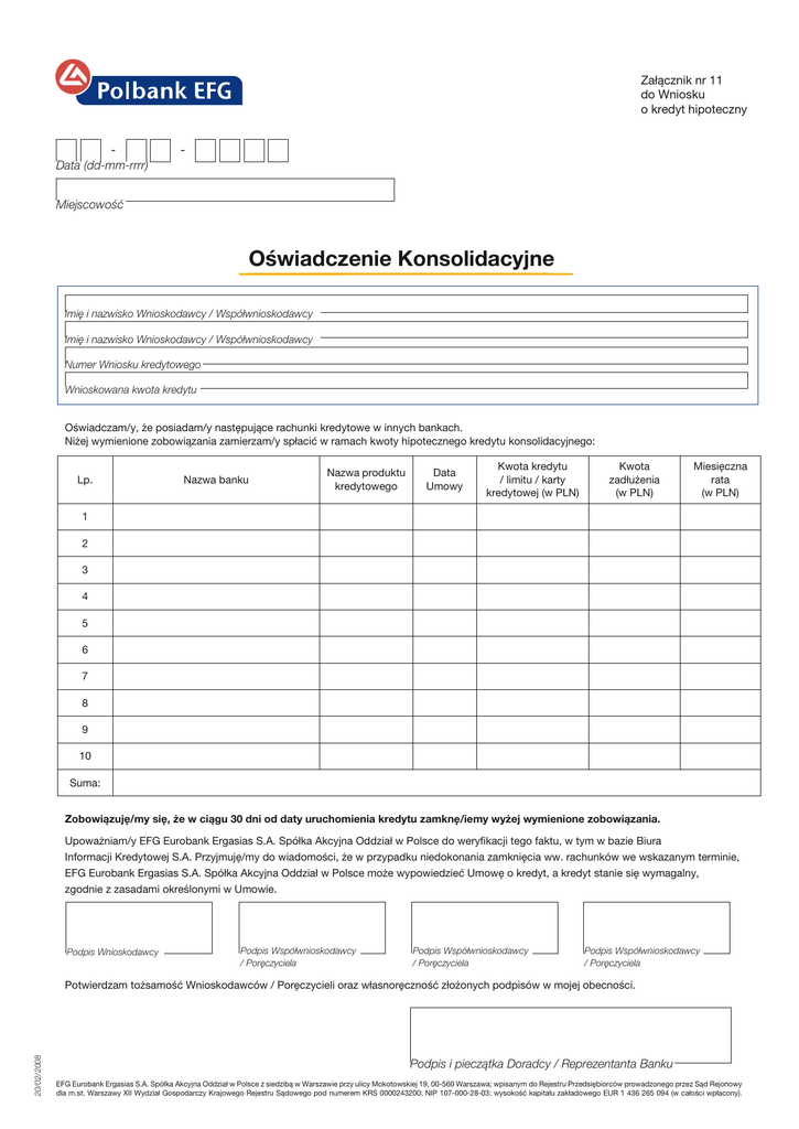 Załącznik nr 11 do Wniosku o kredyt hipoteczny Data (dd-mm-rrrr) - Miejscowość Oświadczenie Konsolidacyjne Imię i nazwisko Wnioskodawcy / Współwnioskodawcy Imię i nazwisko Wnioskodawcy / Współwnioskodawcy Numer Wniosku kredytowego Wnioskowana kwota kredytu Oświadczam/y, że posiadam/y następujące rachunki kredytowe w innych bankach. Niżej wymienione zobowiązania zamierzam/y spłacić w ramach kwoty hipotecznego kredytu konsolidacyjnego: Lp. Nazwa banku Nazwa produktu kredytowego Data Umowy Kwota kredytu / limitu / karty kredytowej (w PLN) Kwota zadłużenia (w PLN) Miesięczna rata (w PLN) 1 2 3 4 5 6 7 8 9 10 Suma: Zobowiązuję/my się, że w ciągu 30 dni od daty uruchomienia kredytu zamknę/iemy wyżej wymienione zobowiązania. Upoważniam/y EFG Eurobank Ergasias S.A. Spółka Akcyjna Oddział w Polsce do weryfikacji tego faktu, w tym w bazie Biura Informacji Kredytowej S.A. Przyjmuję/my do wiadomości, że w przypadku niedokonania zamknięcia ww. rachunków we wskazanym terminie, EFG Eurobank Ergasias S.A. Spółka Akcyjna Oddział w Polsce może wypowiedzieć Umowę o kredyt, a kredyt stanie się wymagalny, zgodnie z zasadami określonymi w Umowie. Podpis Wnioskodawcy Podpis Współwnioskodawcy / Poręczyciela Podpis Współwnioskodawcy / Poręczyciela Podpis Współwnioskodawcy / Poręczyciela Potwierdzam tożsamość Wnioskodawców / Poręczycieli oraz własnoręczność złożonych podpisów w mojej obecności. 20/02/2008 Podpis i pieczątka Doradcy / Reprezentanta Banku EFG Eurobank Ergasias S.A. Spółka Akcyjna Oddział w Polsce z siedzibą w Warszawie przy ulicy Mokotowskiej 19, 00-560 Warszawa; wpisanym do Rejestru Przedsiębiorców prowadzonego przez Sąd Rejonowy dla m.st. Warszawy XII Wydział Gospodarczy Krajowego Rejestru Sądowego pod numerem KRS 0000243200; NIP 107-000-28-03; wysokość kapitału zakładowego EUR 1 436 265 094 (w całości wpłacony).