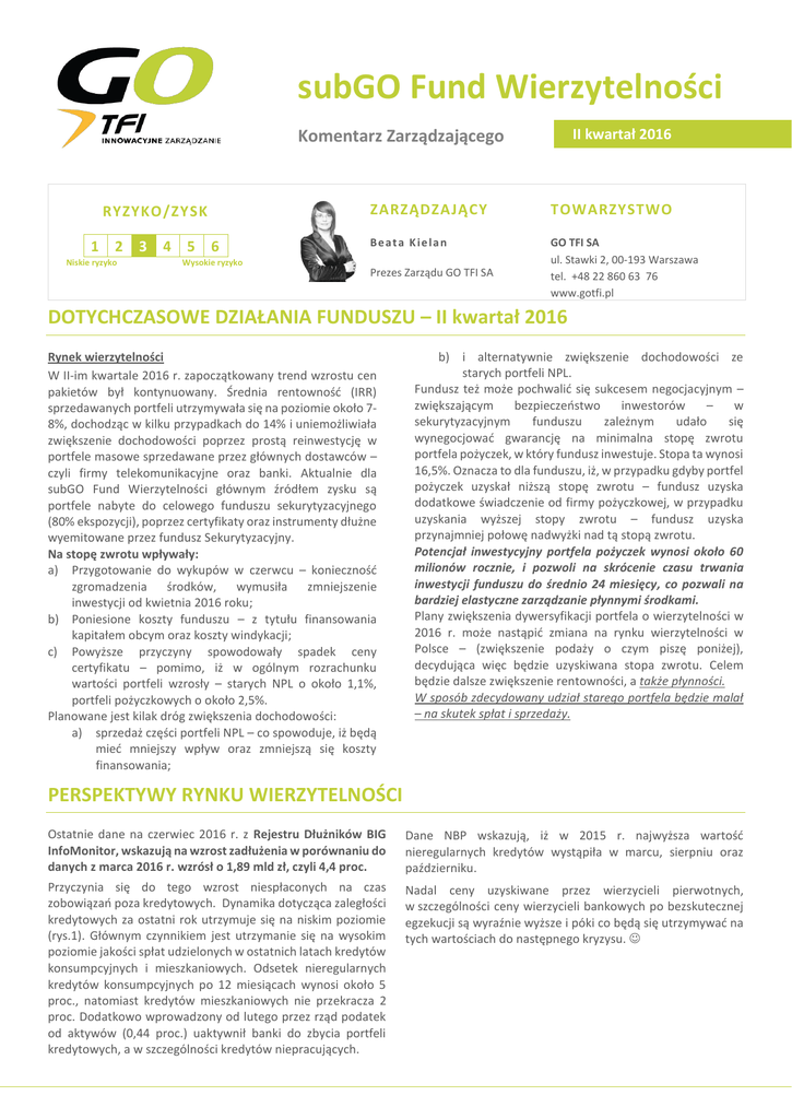 subGO Fund Wierzytelności II kwartał 2016 Komentarz Zarządzającego RYZYKO/ZYSK 1 2 Niskie ryzyko 3 4 5 6 Wysokie ryzyko ZARZĄDZAJĄCY TOWARZYSTWO B e a t a K ie la n GO TFI SA ul. Stawki 2, 00-193 Warszawa tel. +48 22 860 63 76 www.gotfi.pl Prezes Zarządu GO TFI SA doradca inwestycyjny, DOTYCHCZASOWE DZIAŁANIA FUNDUSZU licencja nr – 31.II kwartał 2016 Rynek wierzytelności W II-im kwartale 2016 r. zapoczątkowany trend wzrostu cen pakietów był kontynuowany. Średnia rentowność (IRR) sprzedawanych portfeli utrzymywała się na poziomie około 78%, dochodząc w kilku przypadkach do 14% i uniemożliwiała zwiększenie dochodowości poprzez prostą reinwestycję w portfele masowe sprzedawane przez głównych dostawców – czyli firmy telekomunikacyjne oraz banki. Aktualnie dla subGO Fund Wierzytelności głównym źródłem zysku są portfele nabyte do celowego funduszu sekurytyzacyjnego (80% ekspozycji), poprzez certyfikaty oraz instrumenty dłużne wyemitowane przez fundusz Sekurytyzacyjny. Na stopę zwrotu wpływały: a) Przygotowanie do wykupów w czerwcu – konieczność zgromadzenia środków, wymusiła zmniejszenie inwestycji od kwietnia 2016 roku; b) Poniesione koszty funduszu – z tytułu finansowania kapitałem obcym oraz koszty windykacji; c) Powyższe przyczyny spowodowały spadek ceny certyfikatu – pomimo, iż w ogólnym rozrachunku wartości portfeli wzrosły – starych NPL o około 1,1%, portfeli pożyczkowych o około 2,5%. Planowane jest kilak dróg zwiększenia dochodowości: a) sprzedaż części portfeli NPL – co spowoduje, iż będą mieć mniejszy wpływ oraz zmniejszą się koszty finansowania; b) i alternatywnie zwiększenie dochodowości ze starych portfeli NPL. Fundusz też może pochwalić się sukcesem negocjacyjnym – zwiększającym bezpieczeństwo inwestorów – w sekurytyzacyjnym funduszu zależnym udało się wynegocjować gwarancję na minimalna stopę zwrotu portfela pożyczek, w który fundusz inwestuje. Stopa ta wynosi 16,5%. Oznacza to dla funduszu, iż, w przypadku gdyby portfel pożyczek uzyskał niższą stopę zwrotu – fundusz uzyska dodatkowe świadczenie od firmy pożyczkowej, w przypadku uzyskania wyższej stopy zwrotu – fundusz uzyska przynajmniej połowę nadwyżki nad tą stopą zwrotu. Potencjał inwestycyjny portfela pożyczek wynosi około 60 milionów rocznie, i pozwoli na skrócenie czasu trwania inwestycji funduszu do średnio 24 miesięcy, co pozwali na bardziej elastyczne zarządzanie płynnymi środkami. Plany zwiększenia dywersyfikacji portfela o wierzytelności w 2016 r. może nastąpić zmiana na rynku wierzytelności w Polsce – (zwiększenie podaży o czym piszę poniżej), decydująca więc będzie uzyskiwana stopa zwrotu. Celem będzie dalsze zwiększenie rentowności, a także płynności. W sposób zdecydowany udział starego portfela będzie malał – na skutek spłat i sprzedaży. PERSPEKTYWY RYNKU WIERZYTELNOŚCI Ostatnie dane na czerwiec 2016 r. z Rejestru Dłużników BIG InfoMonitor, wskazują na wzrost zadłużenia w porównaniu do danych z marca 2016 r. wzrósł o 1,89 mld zł, czyli 4,4 proc. Dane NBP wskazują, iż w 2015 r. najwyższa wartość nieregularnych kredytów wystąpiła w marcu, sierpniu oraz październiku. Przyczynia się do tego wzrost niespłaconych na czas zobowiązań poza kredytowych. Dynamika dotycząca zaległości kredytowych za ostatni rok utrzymuje się na niskim poziomie (rys.1). Głównym czynnikiem jest utrzymanie się na wysokim poziomie jakości spłat udzielonych w ostatnich latach kredytów konsumpcyjnych i mieszkaniowych. Odsetek nieregularnych kredytów konsumpcyjnych po 12 miesiącach wynosi około 5 proc., natomiast kredytów mieszkaniowych nie przekracza 2 proc. Dodatkowo wprowadzony od lutego przez rząd podatek od aktywów (0,44 proc.) uaktywnił banki do zbycia portfeli kredytowych, a w szczególności kredytów niepracujących. Nadal ceny uzyskiwane przez wierzycieli pierwotnych, w szczególności ceny wierzycieli bankowych po bezskutecznej egzekucji są wyraźnie wyższe i póki co będą się utrzymywać na tych wartościach do następnego kryzysu. Rys.1 Należności z utratą wartości w mln zł. Przedsiębiorstwa Gospodarstwa domowe Kredyty konsumpcyjne Kredyty mieszkaniowe 45000 40000 35000 30000 25000 20000 15000 10000 5000 0 Źródło danych: NBP. Na pewne zmiany bazy rynku wskazuje wskaźnik Nowego Barometru Rynku Consumer Finance., który spadł z poziomu 57,6 do 56,8 pkt. i utrzymuje się na poziomie powyżej 50 pkt. Pomimo spadku warto zauważyć, że jest to piąty odczyt z kolei, w którym wartość Barometru przekracza poziom 50 punktów. Obserwowany wzrost jest najszybszy od sześciu lat. Taka wartość Barometru oznacza, że w ciągu 12 najbliższych miesięcy spodziewany jest wzrost rynku kredytów konsumpcyjnych. Podsumowując, analiza Barometru Rynku Consumer Finance wskazuje, że w nadchodzących 12 miesiącach rynek kredytu konsumenckiego powinien rosnąć w podobnym tempie jak obecnie, o ile banki same w związku z nowym podatkiem nie zmniejszą istotnie akcji kredytowej. Od dłuższego czasu piszemy o Bazylei III jako możliwej przyczynie zmiany stylu zarządzania aktywami. Banki jednak na regulacje unijne okazały się dość odporne – wystarczyło zmniejszyć akcję kredytową. Być może też poradzą sobie w ten sam sposób z podatkiem od aktywów – ale w 2016 r. bardziej prawdopodobne jest zwiększenie podaży, w pierwszej kolejności niepracujących kredytów mieszkaniowych, ale również należności z tytułu kart, oraz świeżych portfeli. W szczególności kilka banków GETIN, mbank, Millennium, Raiffeisen, BGZBNP Paribas – mogą mieć problemy ze współczynnikami TIER1 i TIER 2. Niektóre zatrzymają dywidendę, inne wyemitują obligacje, ale sprzedaż aktywów będzie nieunikniona. Nie mniej jednak dywersyfikacja zarówno produktowa (pożyczki), jak i zagraniczna funduszu jest dobrym pomysłem. Rys. 2 Barom