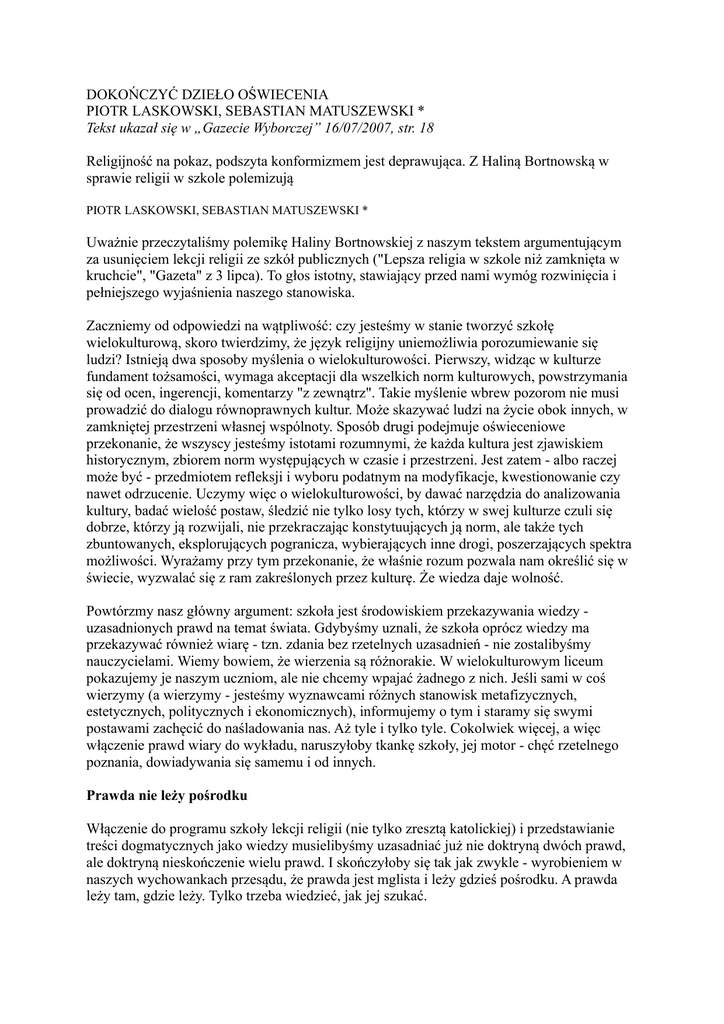 Bortnowska dostrzegła w naszym tekście pragnienie zesłania religii do kruchty. My jednak