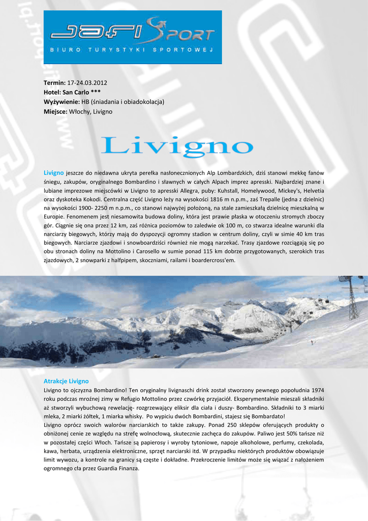 Termin: 17-24.03.2012 Hotel: San Carlo *** Wyżywienie: HB (śniadania i obiadokolacja) Miejsce: Włochy, Livigno Livigno jeszcze do niedawna ukryta perełka nasłonecznionych Alp Lombardzkich, dziś stanowi mekkę fanów śniegu, zakupów, oryginalnego Bombardino i sławnych w całych Alpach imprez apresski. Najbardziej znane i lubiane imprezowe miejscówki w Livigno to apresski Allegra, puby: Kuhstall, Homelywood, Mickey's, Helvetia oraz dyskoteka Kokodi. Centralna część Livigno leży na wysokości 1816 m n.p.m., zaś Trepalle (jedna z dzielnic) na wysokości 1900- 2250 m n.p.m., co stanowi najwyżej położoną, na stale zamieszkałą dzielnicę mieszkalną w Europie. Fenomenem jest niesamowita budowa doliny, która jest prawie płaska w otoczeniu stromych zboczy gór. Ciągnie się ona przez 12 km, zaś różnica poziomów to zaledwie ok 100 m, co stwarza idealne warunki dla narciarzy biegowych, którzy mają do dyspozycji ogromny stadion w centrum doliny, czyli w simie 40 km tras biegowych. Narciarze zjazdowi i snowboardziści również nie mogą narzekać. Trasy zjazdowe rozciągają się po obu stronach doliny na Mottolino i Carosello w sumie ponad 115 km dobrze przygotowanych, szerokich tras zjazdowych, 2 snowparki z halfpipem, skoczniami, railami i boardercross'em. Atrakcje Livigno Livigno to ojczyzna Bombardino! Ten oryginalny livignaschi drink został stworzony pewnego popołudnia 1974 roku podczas mroźnej zimy w Refugio Mottolino przez czwórkę przyjaciół. Eksperymentalnie mieszali składniki aż stworzyli wybuchową rewelację- rozgrzewający eliksir dla ciała i duszy- Bombardino. Składniki to 3 miarki mleka, 2 miarki żółtek, 1 miarka whisky. Po wypiciu dwóch Bombardini, stajesz się Bombardato! Livigno oprócz swoich walorów narciarskich to także zakupy. Ponad 250 sklepów oferujących produkty o obniżonej cenie ze względu na strefę wolnocłową, skutecznie zachęca do zakupów. Paliwo jest 50% tańsze niż w pozostałej części Włoch. Tańsze są papierosy i wyroby tytoniowe, napoje alkoholowe, perfumy, czekolada, kawa, herbata, urządzenia elektroniczne, sprzęt narciarski itd. W przypadku niektórych produktów obowiązuje limit wywozu, a kontrole na granicy są częste i dokładne. Przekroczenie limitów może się wiązać z nałożeniem ogromnego cła przez Guardia Finanza. Plusy: • • • • • • Livigno oferuje: 115 km tras duże 2 snowparki świetnie przygotowane i szerokie trasy długo utrzymująca się pokrywa śnieżna strefa wolnocłowa i zabójczo niskie ceny duże możliwości imprezowe puby, bary, restauracje, sławne imprezy apresski • • • • • • • • • 2 lodowiska tor saneczkowy ściankę wspinaczkową kino kręgle, bilard ogólnodostępny basen i centrum spa przejażdżki konne kłady, skutery oraz dyskotekę, ogromną liczbę barów apresski, pubów i restauracji i wiele innych atrakcji Obiekt położony jest w urokliwym otoczeniu, około 1,5 km od centrum Livignio. Wyciąg krzesełkowy Teola znajduje się w pobliżu, a przystanek autobusu dla narciarzy przed obiektem (2 linie skibusa). Obiekt składa się z 7 połączonych ze sobą obiektów (3-piętrowych). Do wyposażenia kompleksu hotelowego należą: hol hotelowy, restauracja, pokój wypoczynkowy z barem, wieczorna muzyka fortepianowa na żywo, pokój telewizyjny, kącik czytelniczy, pokój gier, kiosk i taras słoneczny. W obiekcie znajduje się również strefa wellness z krytym basenem i pomieszczeniem fitness (w cenie). Sauna i solarium (opalanie twarzy) dodatkowo płatne. Wieczorami program animacyjny (show, gry i zabawy). Dla dzieci w wieku od 5 - 12 lat "miniclub" (10:00 - 12:30 i 14:00 - 16:30). Bezpłatne miejsca parkingowe do dyspozycji gości. Garaż za opłatą. Wyposażenie Przytulne pokoje mają 2 osobne łóżka (na zamówienie łóżko podwójne), prysznic/WC, TV sat. i telefon. Cena zawiera: • zakwaterowanie w obiekcie • karnet narciarski 6 dni Livigno • wyżywienie HB (śniadania oraz obiadokolacje – bufet sałatkowy, zupa i drugie danie z wyborem z menu oraz deser)’ • korzystanie z basenu i siłowni • gry i mini club dla dzieci oraz animacje hotelowe dla dorosłych • ubezpieczenie KL, NNW rozszerzone o amatorskie uprawianie narciarstwa • zorganizowane zawody narciarskie z nagrodami • opieka rezydenta • animacje Jafi Sport (sumo na śniegu, siatkówka w butach narciarskich, imprezy apresski, karaoke itd.) CENA: 2590 zł/osoba Uwaga - Zniżki należy zsumować: Zniżka od ceny globalnej (hotel) dla osób na 3 i 4 łóżku: (0 - 2 lat) - gratis (50zł koszt ubezpieczenia) (2 - 12 lat) - 700 zł (powyżej 12 lat) - 420 zł Dopłata do pokoju jednoosobowego: 450 zł Zniżka od ceny globalnej (karnety) dla: osoba bez karnetu - 700 zł Baby: dzieci ur. po 01.01.2004 - 700 zł Junior: dzieci ur. po 01.01.1996 - 220 zł Senior: osoby ur. przed 31.12.1946 - 220 zł UWAGA: Przy wykupieniu zakwaterowania możliwe zajęcia z salsy z grupą taneczną Jose Torresa (3 dni x 1,5h) w Livigno – cena 100zł/osoba (lub przy wykupie na miejscu płatne 50€/osoba). Cena nie zawiera: • napoi do obiadokolacji (możliwość dokupienia dla całej grupy przed wyjazdem) • korzystania z sauny i solarium w Hotelu • transportu • szkoleń narciarskich i snowboradowych Dodatkowe informacje: • zakwaterowanie możliwe jest od godziny 16:00 w sobotę (wykwaterowanie musi nastąpić do godziny 10:00) • rezerwacja miejsca 30% ceny imprezy, pozostała kwota płatna na 30 dni przed wyjazdem • wystarczy dowód osobisty aby pojechać do Livigno • przy przejeździe autokarem dopuszczalny limit bagażowy to: 20 kg na bagaż główny, 5 kg bagaż podręczny oraz jeden komplet sprzętu sportowego • przejazd Warszawa – Livigno trwa orientacyjnie 24h • skibusy w Livigno kursują do godziny 19:40 • na basenie wymagane są czepki kąpielowe • możliwe jest wykupienie dodatkowego ubezpieczenia od kosztów rezygnacji –3% ceny wyjazdu Prop