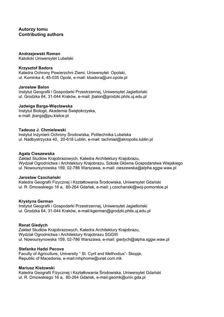 Autorzy tomu Contributing authors Andrzejewski Roman Katolicki Uniwersytet Lubelski Krzysztof Badora Katedra Ochrony Powierzchni Ziemi, Uniwersytet Opolski, ul. Kominka 4, 45-035 Opole, e-mail: [email protected] Jarosław Balon Instytut Geografii i Gospodarki Przestrzennej, Uniwersytet Jagielloński ul. Grodzka 64, 31-044 Kraków, e-mail: [email protected] Jadwiga Barga-Więcławska Instytut Biologii, Akademia Świętokrzyska, e-mail: [email protected] Tadeusz J. Chmielewski Instytut Inżynierii Ochrony Środowiska, Politechnika Lubelska ul. Nadbystrzycka 40, 20-618 Lublin, e-mail: [email protected] Agata Cieszewska Zakład Studiów Krajobrazowych, Katedra Architektury Krajobrazu, Wydział Ogrodnictwa i Architektury Krajobrazu, Szkoła Główna Gospodarstwa Wiejskiego ul. Nowoursynowska 159, 02-786 Warszawa, e-mail: [email protected] Jarosław Czochański Katedra Geografii Fizycznej i Kształtowania Środowiska, Uniwersytet Gdański ul. R. Dmowskiego 16 a, 80-264 Gdańsk, e-mail: [email protected] Krystyna German Instytut Geografii i Gospodarki Przestrzennej, Uniwersytet Jagielloński ul. Grodzka 64, 31-044 Kraków, e-mail:[email protected] Renat Giedych Zakład Studiów Krajobrazowych, Katedra Architektury Krajobrazu, Wydział Ogrodnictwa i Architektury Krajobrazu SGGW ul. Nowoursynowska 159, 02-786 Warszawa, e-mail: [email protected] Stefanka Hadzi Pecova Faculty of Agriculture, University “ St. Cyril and Methodius”- Skopje, Republic of Macedonia, e-mail:[email protected] Mariusz Kistowski Katedra Geografii Fizycznej i Kształtowania Środowiska, Uniwersytet Gdański ul. R. Dmowskiego 16 a, 80-264 Gdańsk, e-mail:[email protected] Jolanta Kijowska Zakład Analizy i Kartowania Środowiska, Instytut Geografii Fizycznej i Kształtowania Środowiska Przyrodniczego, Uniwersytet im. A. Mickiewicza, Poznań, ul. Fredry 10, 61-701 Poznań, e-mail:[email protected] Barbara Korwel Katedra Geografii Fizycznej i Kształtowania Środowiska, Uniwersytet Gdański ul. R. Dmowskiego 16 a, 80-264 Gdańsk, e-mail:[email protected] Aleksandra Kowalczyk Zakład Geografii Turystyki, Instytut Geografii, Akademia Bydgoska im. Kazimierza Wielkiego ul. Mińska 15 85-824 Bydgoszcz, e-mail:[email protected] Stanisław Krysiak Zakład Gleboznawstwa i Geoekologii, Katedra Geografii Fizycznej Kompleksowej, Instytut Geografii Fizycznej i Kształtowania Środowiska, Uniwersytet Łódzki ul. Jaracza 7/8 Łódź, e-mail:[email protected] Sylwia Kulczyk Zakład Geoekologii, Instytut Geografii Fizycznej, Wydział Geografii i Studiów Regionalnych, Uniwersytet Warszawski Ul. Krakowskie Przedmieście 30, 00-927 Warszawa, e-mail:[email protected] Iwona Markuszewska Zakład Kształtowania Środowiska Przyrodniczego i Fotointerpretacji Instytut Geografii Fizycznej i Kształtowania Środowiska Przyrodniczego Uniwersytet im. A. Mickiewicza, Poznań, e-mail:[email protected] Arkadiusz Nowak Katedra Biosystematyki, Uniwersytet Opolski, ul. Oleska 22, 45-052 Opole, e-mail: [email protected] Marek Ostrowski Samodzielna Pracownia Informacji Obrazowej SCI-ART Zakład Ekologii Wydział Biologii Uniwersytet Warszawski e-mail:[email protected] [email protected] Maciej Pietrzak Instytut Turystyki, Państwowa Wyższa Szkoła Zawodowa w Lesznie Zakład Syntez Krajobrazowych, Akademia Wychowania Fizycznego w Poznaniu ul. Rybaki 19, 61-884 Poznań, e-mail: [email protected] Maciej Przewoźniak Politechnika Gdańska, Wydział Architektury, ul. Narutowicza11/12, 80-952 Gdańsk, e-mail: [email protected] Andrzej Richling Zakład Geoekologii, Instytut Geografii Fizycznej, Wydział Geografii i Studiów Regionalnych, Uniwersytet Warszawski ul. Krakowskie Przedmieście 30, 00-927 Warszawa, e-mail:[email protected] Lech Ryszkowski Zakład Badań Środowiska Rolniczego i Leśnego, Polska Akademia Nauk, Poznań ul. Bukowska 19, 60-809 Poznań Jerzy Solon Instytut Geografii i Przestrzennego Zagospodarowania Polskiej Akademii Nauk ul. Twarda 51/55, 00-818 Warszawa, e-mail: [email protected] Barbara Szulczewska Zakład Studiów Krajobrazowych, Katedra Architektury Krajobrazu, Wydział Ogrodnictwa i Architektury Krajobrazu SGGW ul. Nowoursynowska 159, 02-786 Warszawa, e-mail: [email protected] Krzysztof Wojciechowski Katedra Ochrony Środowiska, Katolicki Uniwersytet Lubelski al.Kraśnicka 102, 20-718 Lublin, e-mail: [email protected] Przemysław Wolski Zakład Studiów Krajobrazowych, Katedra Architektury Krajobrazu, Wydział Ogrodnictwa i Architektury Krajobrazu SGGW ul. Nowoursynowska 159, 02-786 Warszawa, e-mail: [email protected] Alina Zajadacz Instytut Geografii Fizycznej i Kształtowania Środowiska Przyrodniczego UAM Poznań Uniwersytet im. A. Mickiewicza, Poznań ul.Fredry 10 61-701 Poznań