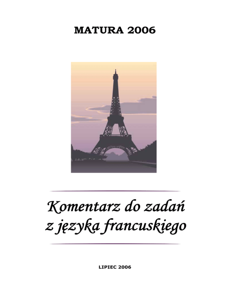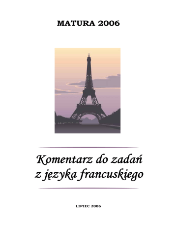 MATURA 2006 Komentarz do zadań z języka francuskiego LIPIEC 2006 Opracowano w Centralnej Komisji Egzaminacyjnej z wykorzystaniem materiałów otrzymanych z okręgowych komisji egzaminacyjnych Opracowano w Centralnej Komisji Egzaminacyjnej z wykorzystaniem materiałów otrzymanych z okręgowych komisji egzaminacyjnych 3 WSTĘP Zgodnie z Rozporządzeniem Ministra Edukacji Narodowej i Sportu w sprawie warunków i sposobu oceniania, klasyfikowania i promowania uczniów i słuchaczy oraz przeprowadzania sprawdzianów i egzaminów w szkołach publicznych z dnia 7 września 2004 roku z późniejszymi zmianami, język obcy nowożytny, wybrany przez zdającego z listy zamieszczonej w rozporządzeniu, był jednym z przedmiotów obowiązkowych zdawanych na egzaminie maturalnym. Zdający mógł, jako przedmiot dodatkowy, zdawać drugi język obcy wybrany z tej listy, inny niż język wybrany jako przedmiot obowiązkowy. Egzamin maturalny z języka obcego nowożytnego, zarówno zdawany jako przedmiot obowiązkowy, jak i przedmiot dodatkowy, składał się z części ustnej i pisemnej. Ze względu na dużą liczbę zadań zamkniętych zdecydowano się na wprowadzenie trzech równoległych wersji arkuszy egzaminacyjnych z najliczniej wybieranych języków obcych. Język obcy nowożytny wybrany jako przedmiot obowiązkowy mógł być zdawany na poziomie podstawowym lub rozszerzonym. W części pisemnej wszyscy zdający przystępowali do poziomu podstawowego (arkusz I), a następnie zdający, którzy zadeklarowali zdawanie poziomu rozszerzonego rozwiązywali dodatkowe arkusze (arkusz II i III). W części ustnej zdający przystępowali do egzaminu na jednym poziomie, podstawowym lub rozszerzonym. Zdający nie byli zobowiązani do zdawania egzaminu pisemnego i egzaminu ustnego z języka obcego nowożytnego na tym samym poziomie. Maturzyści, którzy wybrali język obcy nowożytny jako przedmiot dodatkowy, zdawali egzamin na poziomie rozszerzonym. W części pierwszej rozwiązywali oni arkusz I dla poziomu podstawowego, a w części drugiej arkusze II i III dla poziomu rozszerzonego. Arkusze egzaminacyjne z języka obcego zdawanego jako przedmiot obowiązkowy i jako przedmiot dodatkowy były takie same. Egzamin ustny z języka obcego nowożytnego wybranego jako przedmiot dodatkowy zdawany był na poziomie rozszerzonym. OPIS ARKUSZY EGZAMINACYJNYCH Arkusze egzaminacyjne dostępne są na stronie internetowej CKE www.cke.edu.pl Arkusz I – Poziom podstawowy Arkusz pierwszy (czas trwania: 120 minut) obejmował 3 części: rozumienie ze słuchu, rozumienie tekstu czytanego oraz wypowiedź pisemną. Część pierwsza – Rozumienie ze słuchu - trwała ok. 20 minut i składała się z trzech zadań zamkniętych opartych na różnorodnych tekstach. Zadaniem zdających było rozwiązanie tych zadań na podstawie tekstów nagranych w warunkach studyjnych. Lektorami byli rodzimi użytkownicy języka francuskiego. Na płycie każdy tekst nagrany był dwukrotnie i przewidziane były przerwy na zapoznanie się z zadaniem, rozwiązanie go i przeniesienie rozwiązania na kartę odpowiedzi. Za rozwiązanie tej części testu zdający mógł uzyskać 15 punktów (30% punktów możliwych do uzyskania na poziomie podstawowym). Zadanie 1. (5 pkt) Zadanie składało się z pięciu zadań cząstkowych z zakresu tematycznego „Podróżowanie i turystyka – środki transportu”, polegało na wysłuchaniu wypowiedzi pięciu osób i przyporządkowaniu im informacji zgodnych z treścią wypowiedzi. Nagranie to wypowiedzi młodych ludzi wymieniających się opiniami nt. plusów i minusów używania samochodu w mieście. Zdający musieli zaznaczyć, które z podanych w zadaniu osób opowiadają się za ruchem samochodowym w mieście, a które są przeciw. Zastosowaną techniką w zadaniu było „dobieranie”. 4 Opracowano w Centralnej Komisji Egzaminacyjnej z wykorzystaniem materiałów otrzymanych z okręgowych komisji egzaminacyjnych Sprawdzane umiejętności Standard II – 1. Rozumienie ze słuchu a – określanie głównej myśli tekstu Łatwość zadania 0,83 – łatwe (od 0,55 do 0,97) Komentarz 1.4. Zdającym sprawiła trudność wypowiedź Michel’a, który, opowiadając się przeciwko samochodom w mieście, użył konstrukcji zdaniowej w drugim trybie warunkowym i w dodatku w formie przeczącej S’il n’y avait aucune voiture (...) on pourrait... Zadanie 2. (5 pkt) Zadanie składało się pięciu zadań cząstkowych z zakresu tematycznego „Życie rodzinne i towarzyskie -formy spędzania czasu wolnego” i polegało na wysłuchaniu pięciu rad nt. zapobiegania nudzie podczas wakacji i stwierdzeniu, czy tekst zawiera określone informacje oraz ich wyselekcjonowanie. Zdający wybierał z dziesięciu propozycji podanych w zadaniu pięć rad zgodnych z treścią nagrania. Sprawdzane umiejętności Standard II – 1. Rozumienie ze słuchu c – stwierdzenia, czy tekst zawiera określone informacje d – wyselekcjonowania informacji Łatwość zadania 0,82 – łatwe Komentarz Zadanie to nie sprawiło kłopotu zdającym, pomimo występujących w zadaniu pięciu, nie będących związanym z nagraniem rad jakie znalazły się w zadaniach cząstkowych. Bliskie zdającym tematy, czas wolny i wakacje nie przysporzyły im większych trudności. Zadanie 3. (5 pkt) Zadanie składało się pięciu zadań cząstkowych, z zakresu tematycznego „Nauka i technika– obsługa i korzystanie z podstawowych urządzeń technicznych” oraz „Życie rodzinne i towarzyskie” i polegało na wysłuchaniu tekstu narracyjnego i określeniu czy zawiera on określone informacje. Nagranie to historia o chłopcu, który dzięki Internetowi odnalazł swojego psa, podarowanego przez dziadków. Zdający musieli zaznaczyć, które z podanych w zadaniu zdań były zgodne z treścią wysłuchanego tekstu (vrai), a które nie były zgodne (faux). Sprawdzane umiejętności Standard II – 1. Rozumienie ze słuchu c – stwierdzenia, czy tekst zawier