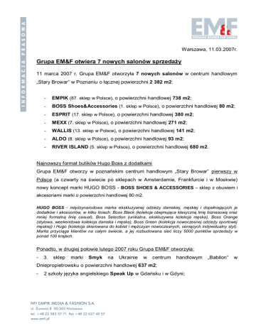 Warszawa, 11.03.2007r. Grupa EM&F otwiera 7 nowych salonów sprzedaży 11 marca 2007 r. Grupa EM&F otworzyła 7 nowych salonów w centrum handlowym „Stary Browar” w Poznaniu o łącznej powierzchni 2 382 m2: - EMPIK (87. sklep w Polsce), o powierzchni handlowej 738 m2; - BOSS Shoes&Accessories (1. sklep w Polsce), o powierzchni handlowej 80 m2; - ESPRIT (17. sklep w Polsce), o powierzchni handlowej 380 m2; - MEXX (7. sklep w Polsce), o powierzchni handlowej 271 m2; - WALLIS (13. sklep w Polsce), o powierzchni handlowej 141 m2; - ALDO (8. sklep w Polsce), o powierzchni handlowej 93 m2; - RIVER ISLAND (5. sklep w Polsce), o powierzchni handlowej 680 m2. Najnowszy format butików Hugo Boss z dodatkami Grupa EM&F otworzy w poznańskim centrum handlowym „Stary Browar” pierwszy w Polsce (a czwarty na świecie po sklepach w Amsterdamie, Frankfurcie i w Moskwie) nowy koncept marki HUGO BOSS - BOSS SHOES & ACCESSORIES – sklep z obuwiem i akcesoriami marki o powierzchni handlowej 80 m2. HUGO BOSS - międzynarodowa marka ekskluzywnej odzieży damskiej, męskiej i dopełniających je dodatków i akcesoriów, w kilku liniach: Boss Black (kolekcja obejmująca klasyczną linię biznesową oraz mniej formalną linię casual), Boss Selection (unikalna, ekskluzywna kolekcja męska), Boss Orange (stylowa, weekendowa kolekcja damska i męska), Boss Green (kolekcja nowoczesnej odzieży sportowej męskiej) i Hugo (kolekcja skierowana do kobiet i mężczyzn nowoczesnych, ceniących indywidualny styl). Marka przyciąga klientów na całym świecie, a jej rozbudowana sieć liczy 5000 punktów sprzedaży w ponad 100 krajach. Ponadto, w drugiej połowie lutego 2007 roku Grupa EM&F otworzyła: - 3. sklep marki Smyk na Ukrainie w centrum handlowym Dniepropietrowsku o powierzchni handlowej 637 m2; - 2 szkoły języka angielskiego Speak Up w Gdańsku i w Gdyni; „Babilon” w - salon Mexx w warszawskim centrum handlowym Sadyba Best Mall o powierzchni handlowej 193 m2. Tym samym Grupa EM&F powiększyła sieć sprzedaży do blisko 330 sklepów i punktów usługowych (włączając sklepy Zara, a wyłączając 52 perfumerie Sephora oraz 61 kawiarni coffeeheaven).